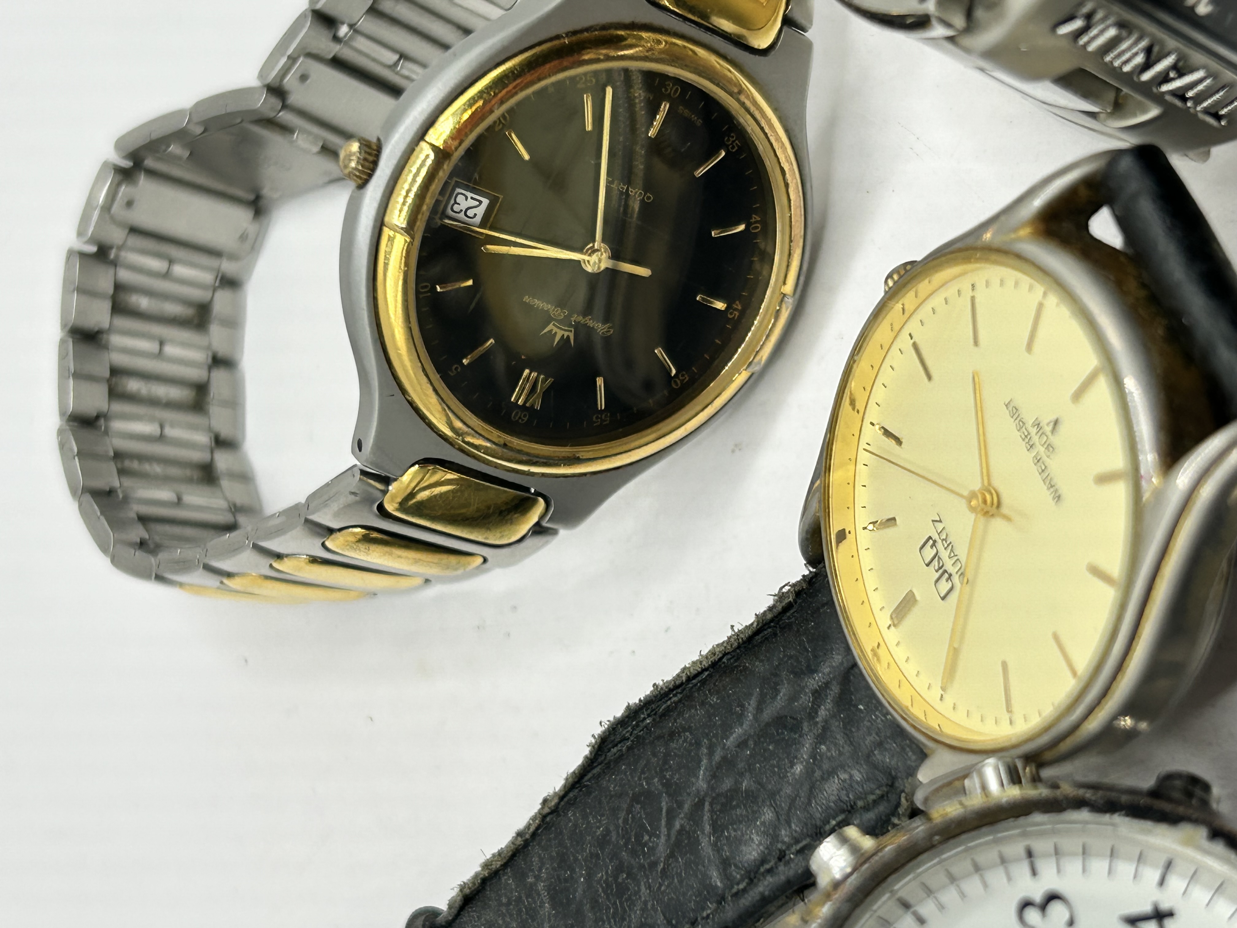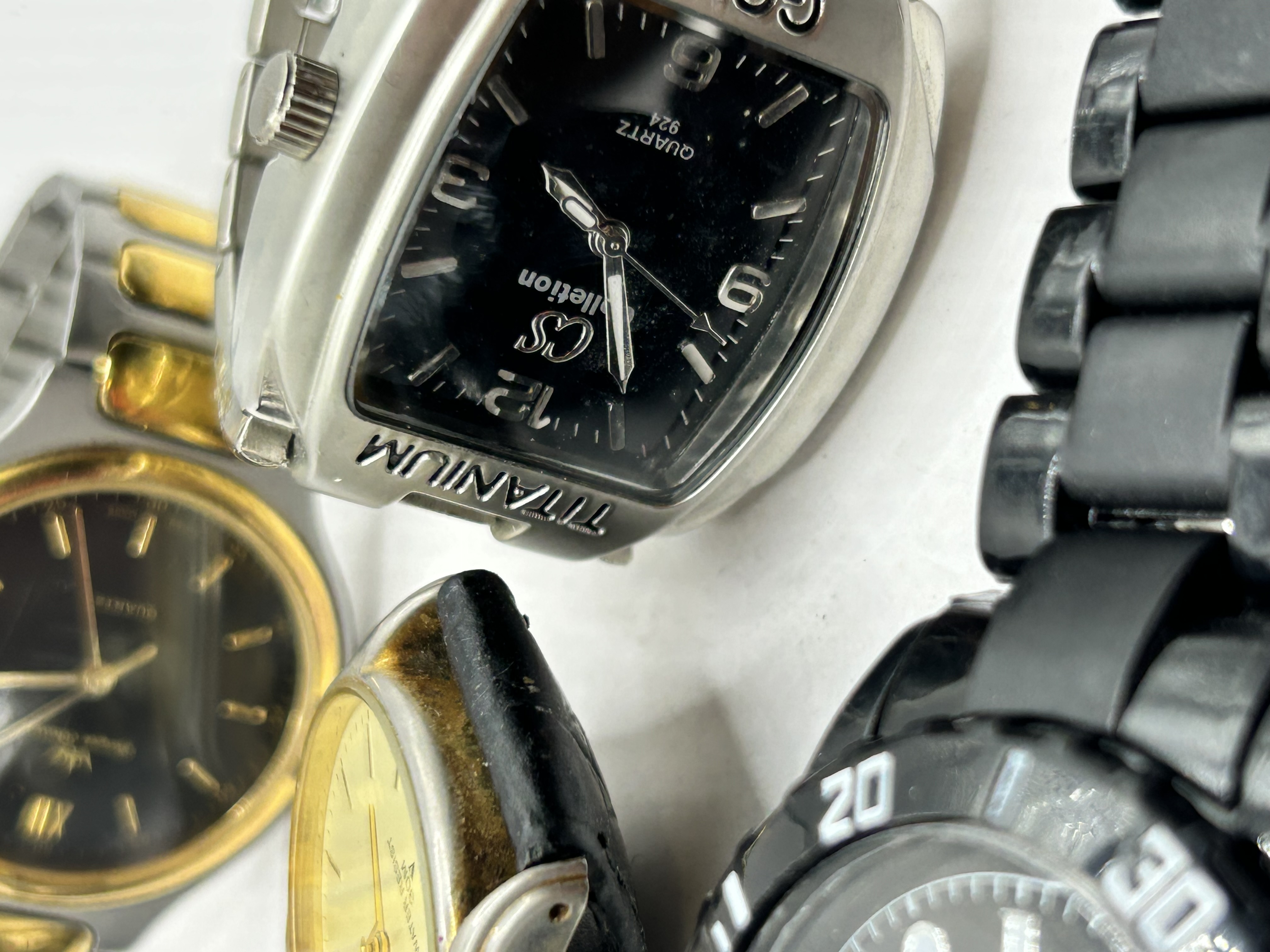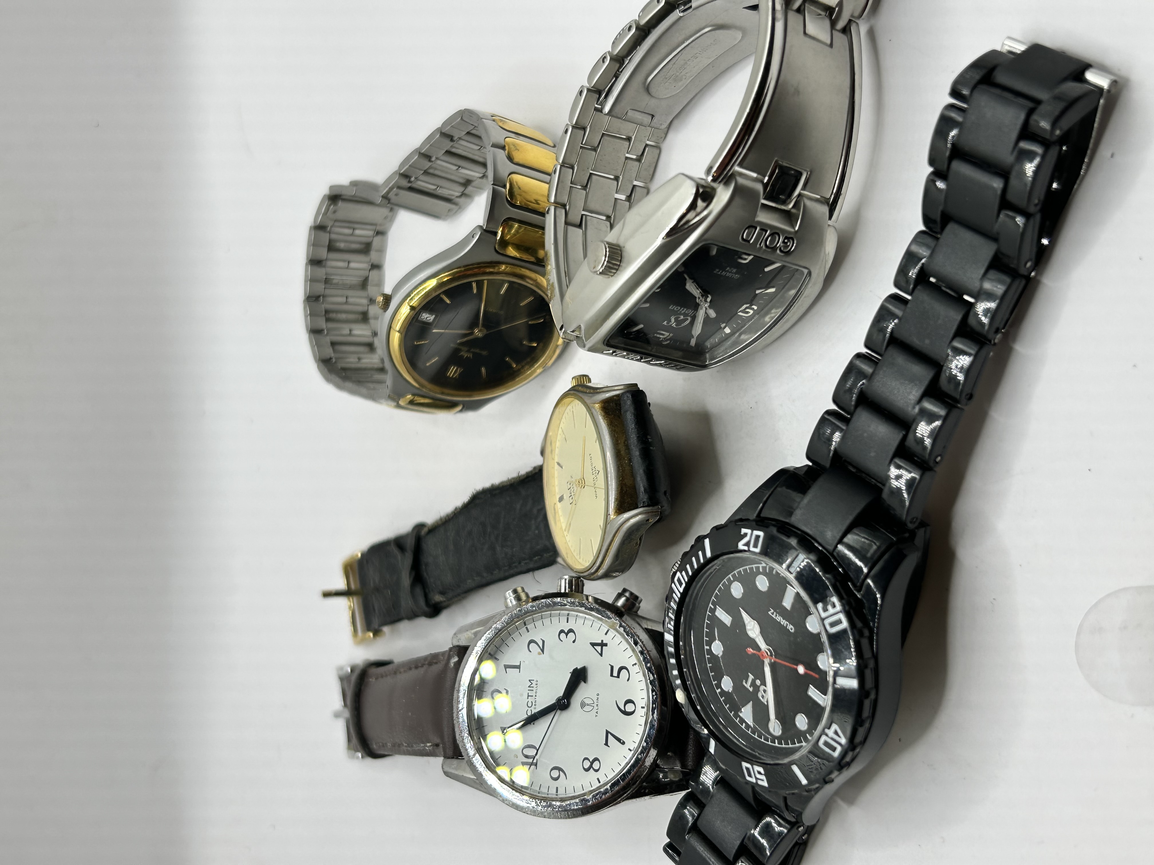 A collection of five modern quartz wristwatches of mixed materials and styles. The lot includes a Jacques Rissoni two-tone dress watch with a date aperture and metal link bracelet; a silver-tone rectangular watch marked TITANIUM and CS Collection; a gold-tone round watch marked Q.Q (Water Resist 30M); a white-dial chronograph-style watch marked OCCETIM on a leather strap; and a large black coated diver-style watch marked B.T. on a black link bracelet. The watches feature various finishes including stainless steel/base metal, gold and silver tone plating, and black coatings. All are quartz movement timepieces.