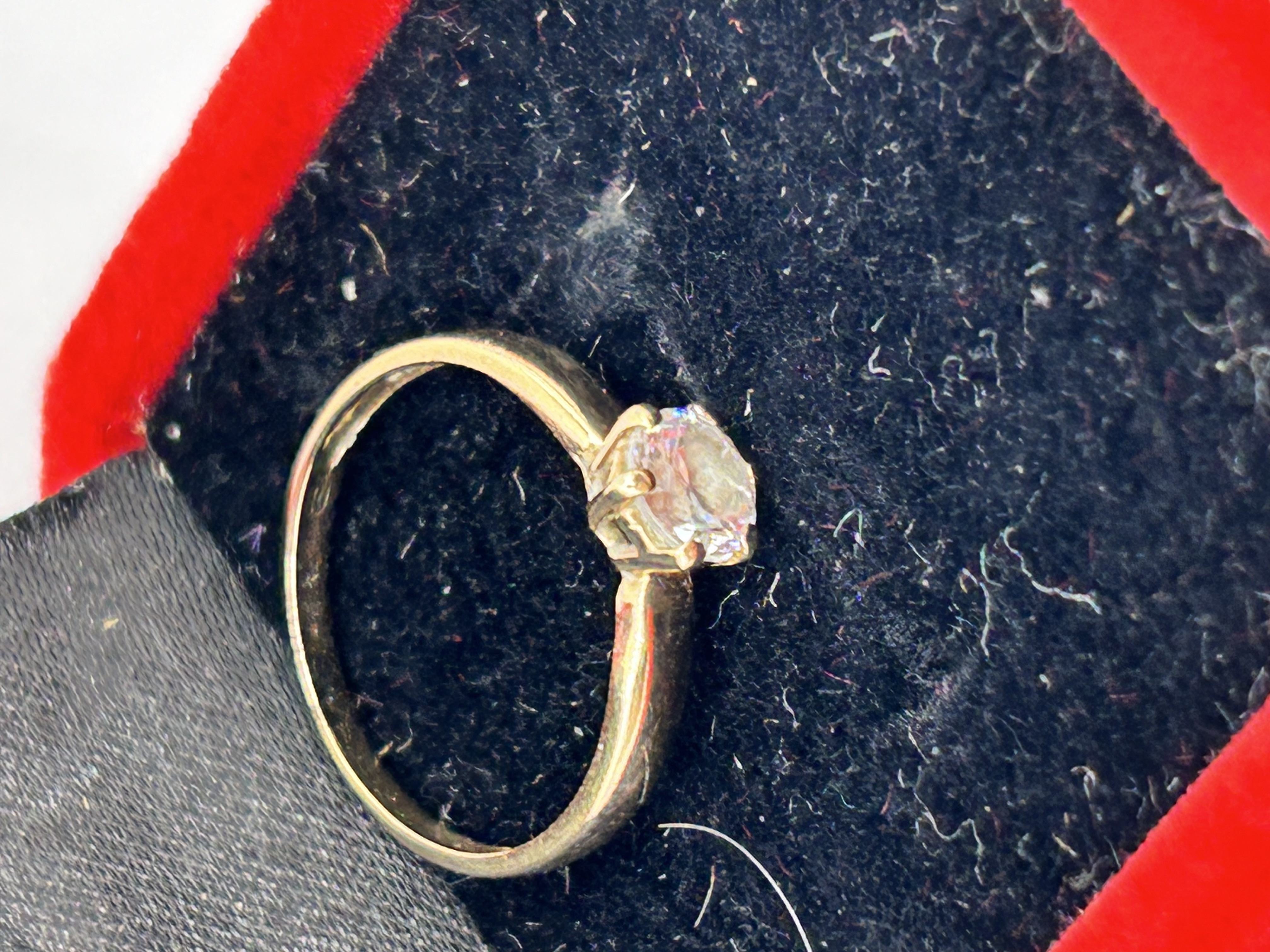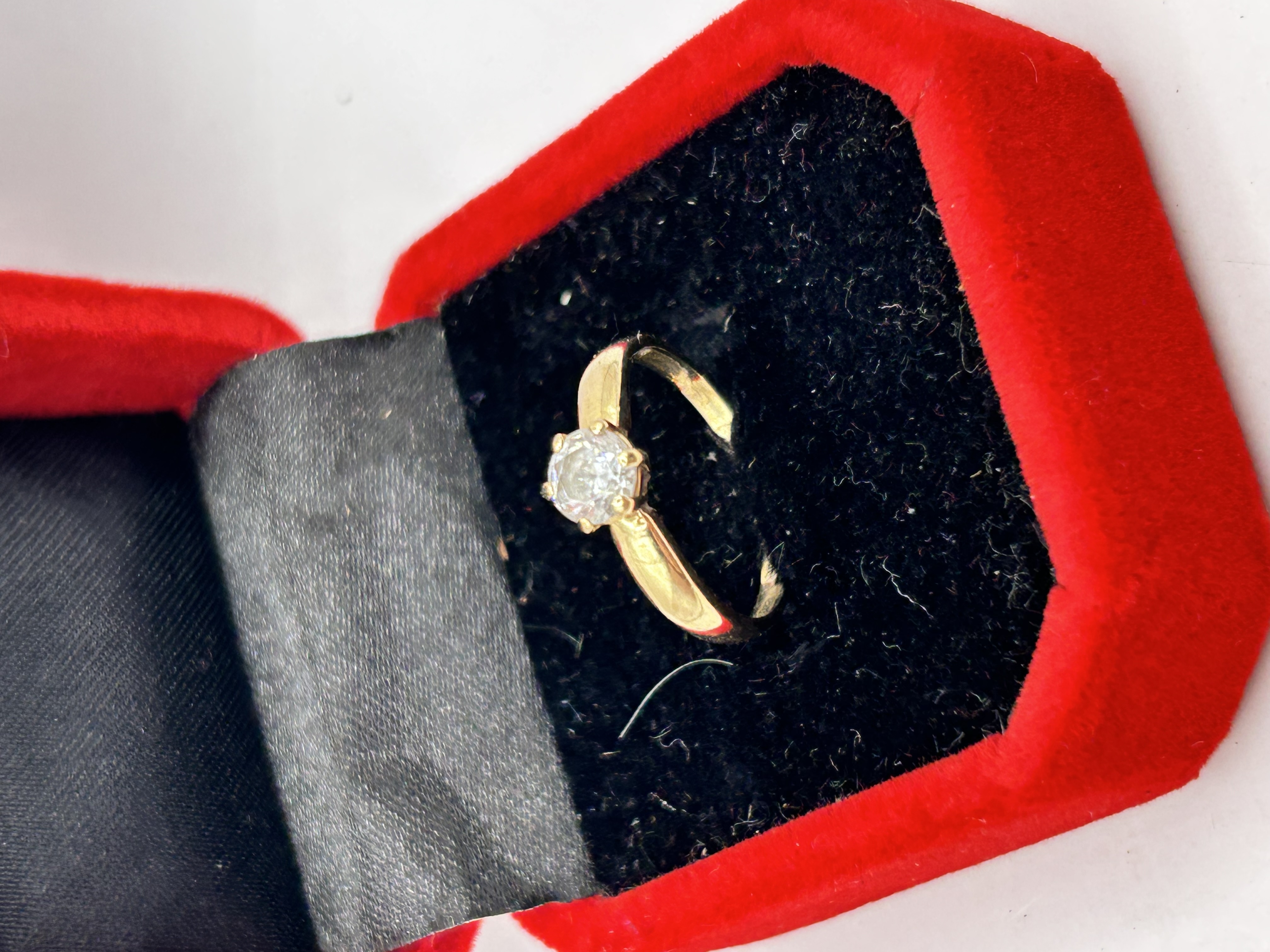 A traditional solitaire ring crafted from yellow-toned metal, likely gold, featuring a slender band that tapers toward a high-set six-prong basket setting. The setting securely holds one round brilliant-cut colorless faceted stone, which may be a diamond or a high-quality simulant, consistent with comparable 14K gold market examples. The item is presented in a small, hinged jewelry box featuring a red velvet exterior and a black flocked interior. No identifying hallmarks or maker’s marks are clearly visible upon inspection.