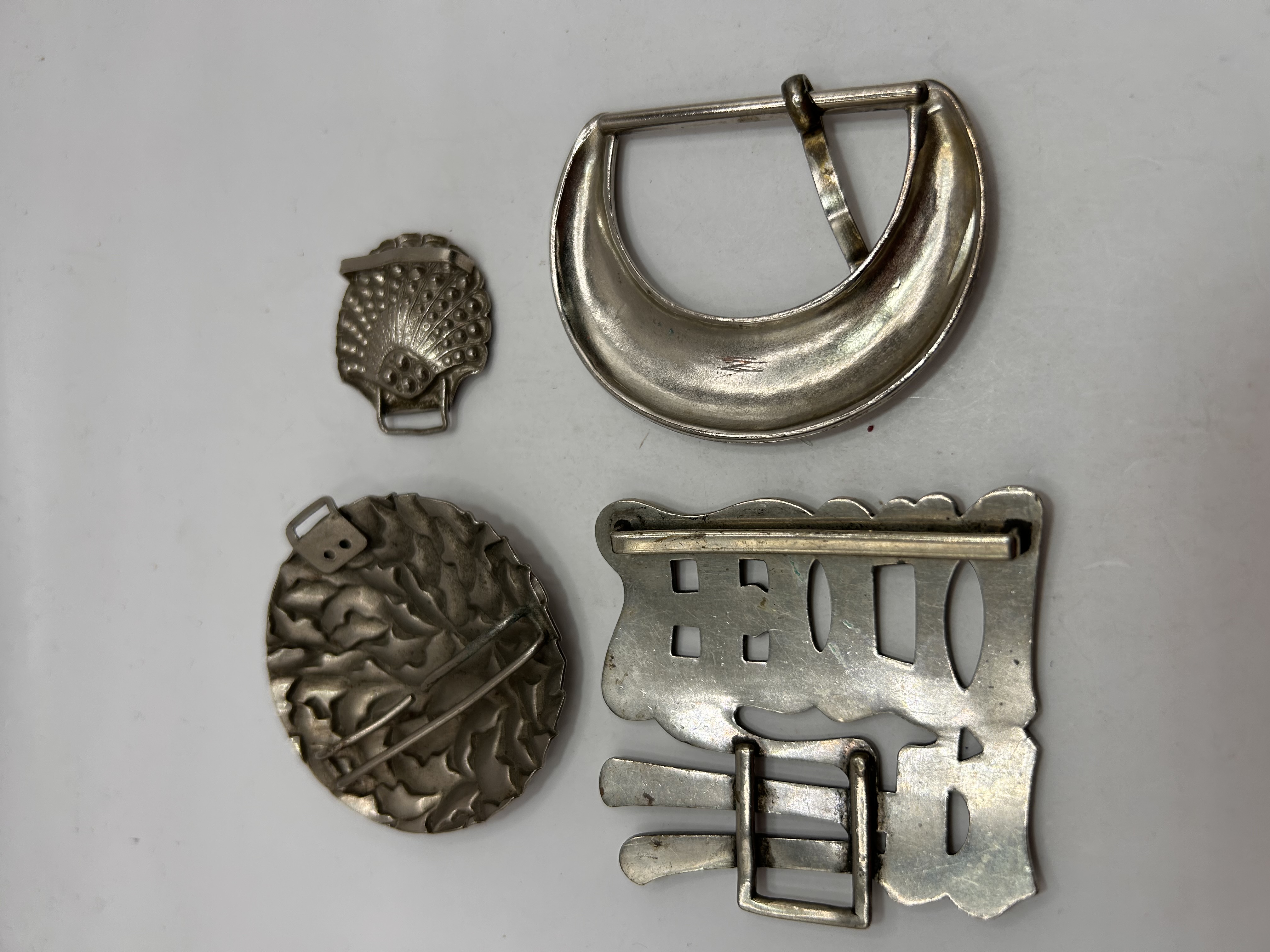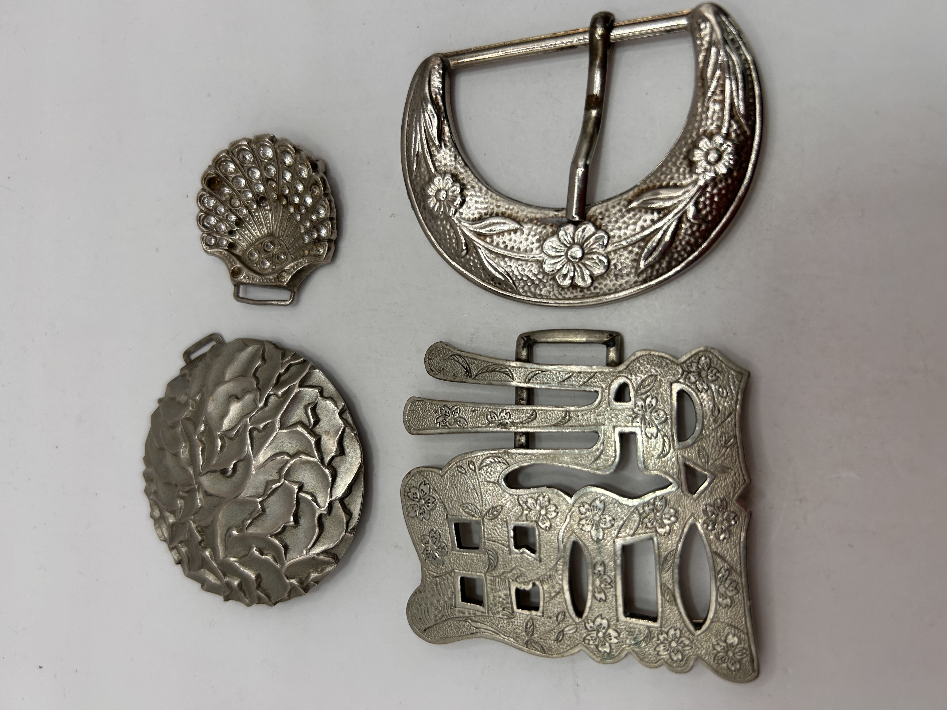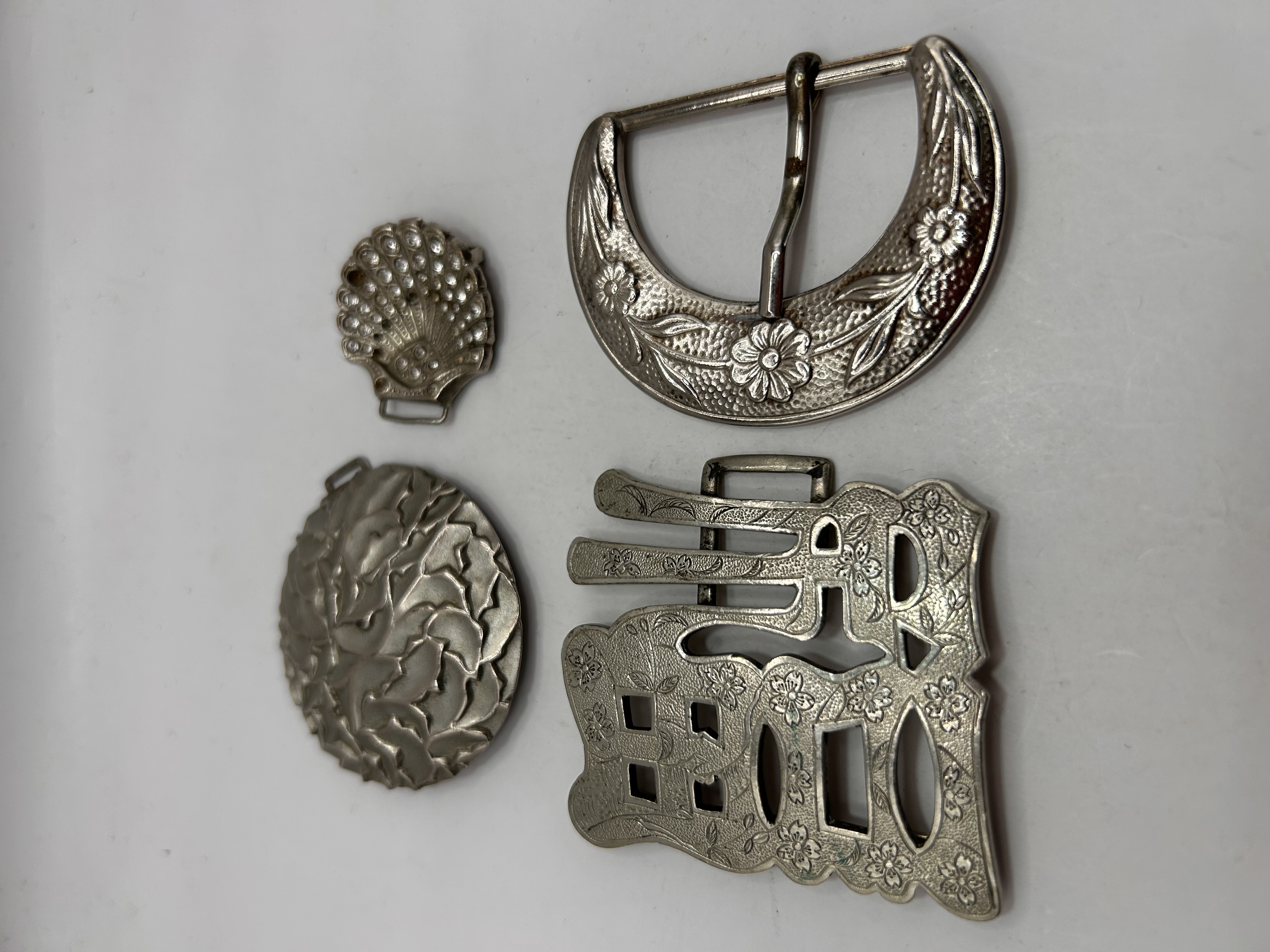 A collection of four silver tone metal accessories, likely plated base metal, comprising specialized buckles and ornamental components. The collection includes a large Western-style crescent belt buckle featuring a single prong mechanism and decorated with engraved floral and foliate motifs. A smaller, convex seashell-form ornament exhibits a beaded surface texture and includes a loop for attachment. The third item is a circular medallion with deep relief carving depicting swirling, overlapping leaves. The final component is a large, rectangular openwork ornament, likely a buckle component, highly stylized with Chinese characters dominated by 壽 (Shòu), representing Longevity, interspersed with small floral engravings. All items are finished in a bright silver tone.