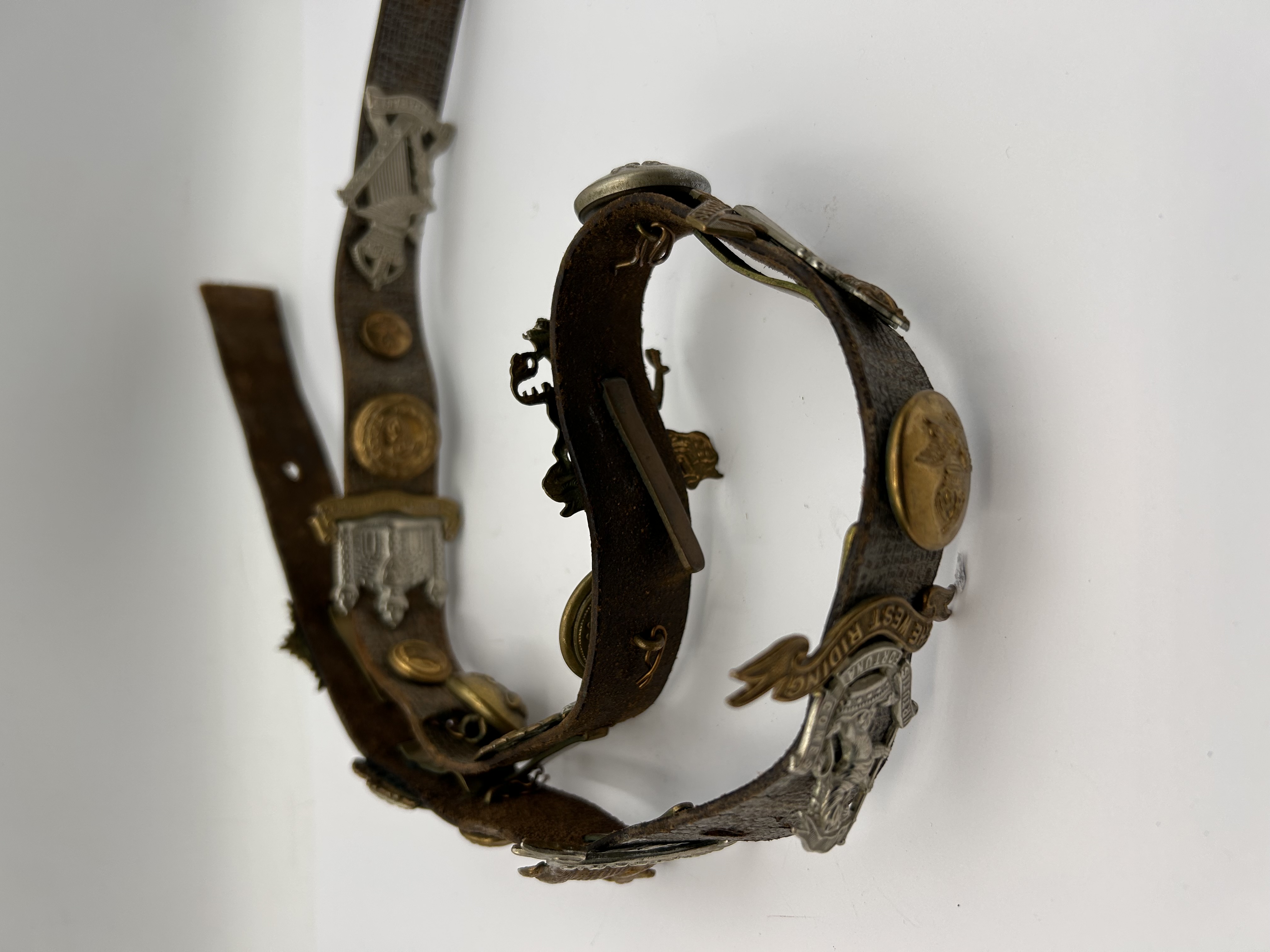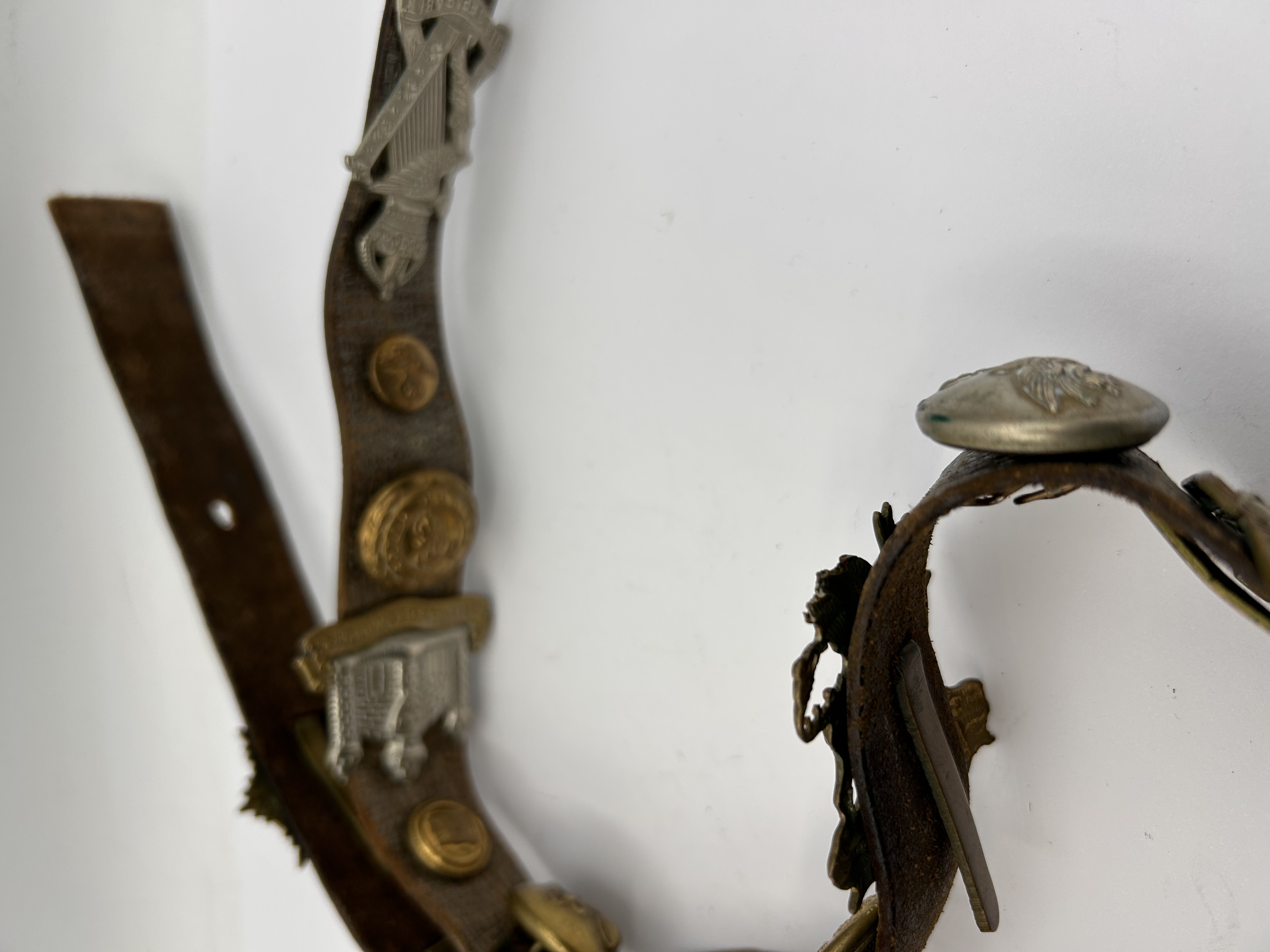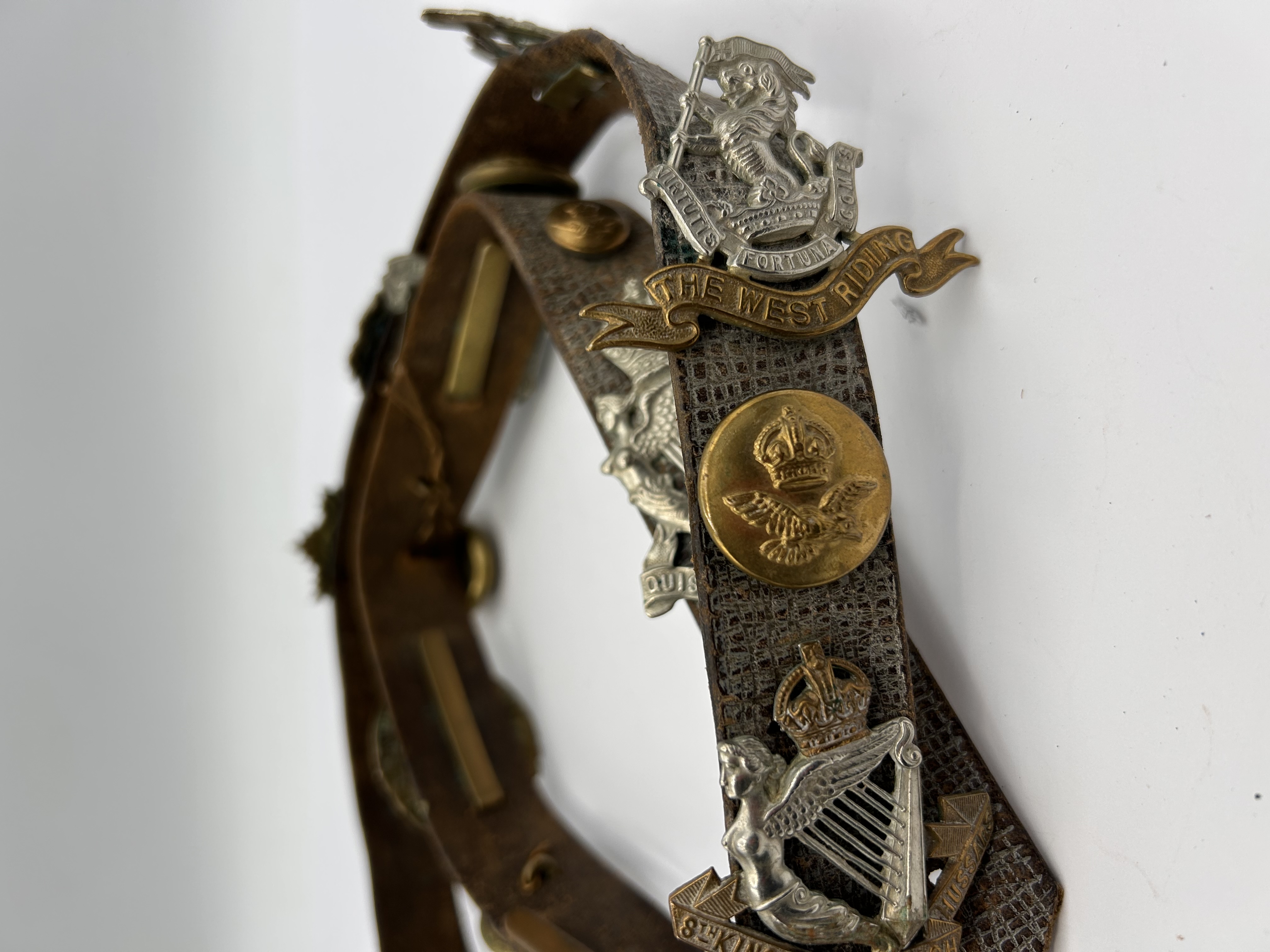 This item is identified through web intelligence as a British Army Souvenir Belt, commonly referred to as a “Hate Belt,” dating likely from the World War era. The narrow, dark brown leather strap features a textured or patterned surface and is affixed with a collection of 12 individual mixed-metal military and regimental insignia. The attachments include a mix of brass and gilt buttons or coins, alongside silver-toned cap badges and brooches. The insignia display heavy tarnish and patina consistent with age. Notable features include a large cap badge bearing a crown, lion, and banner inscribed with the Latin motto PER UNDAS ET AGRO (Through waves and fields), and a separate banner reading THE WEST RIDING. Other attachments feature crowns, shields, winged figures, and harp motifs. The construction involves various methods of attachment, including pins and backings, securing the badges to the leather strap.