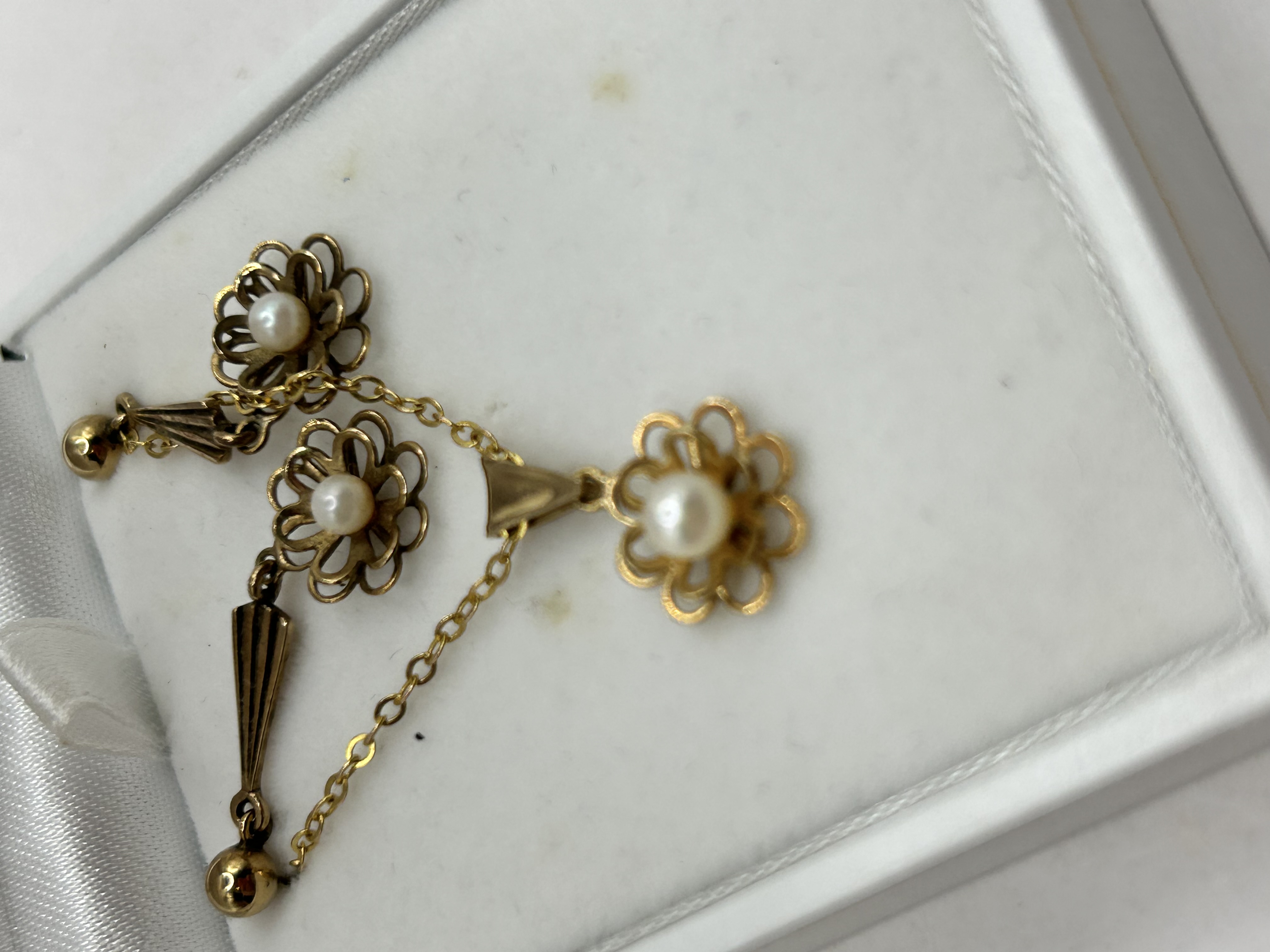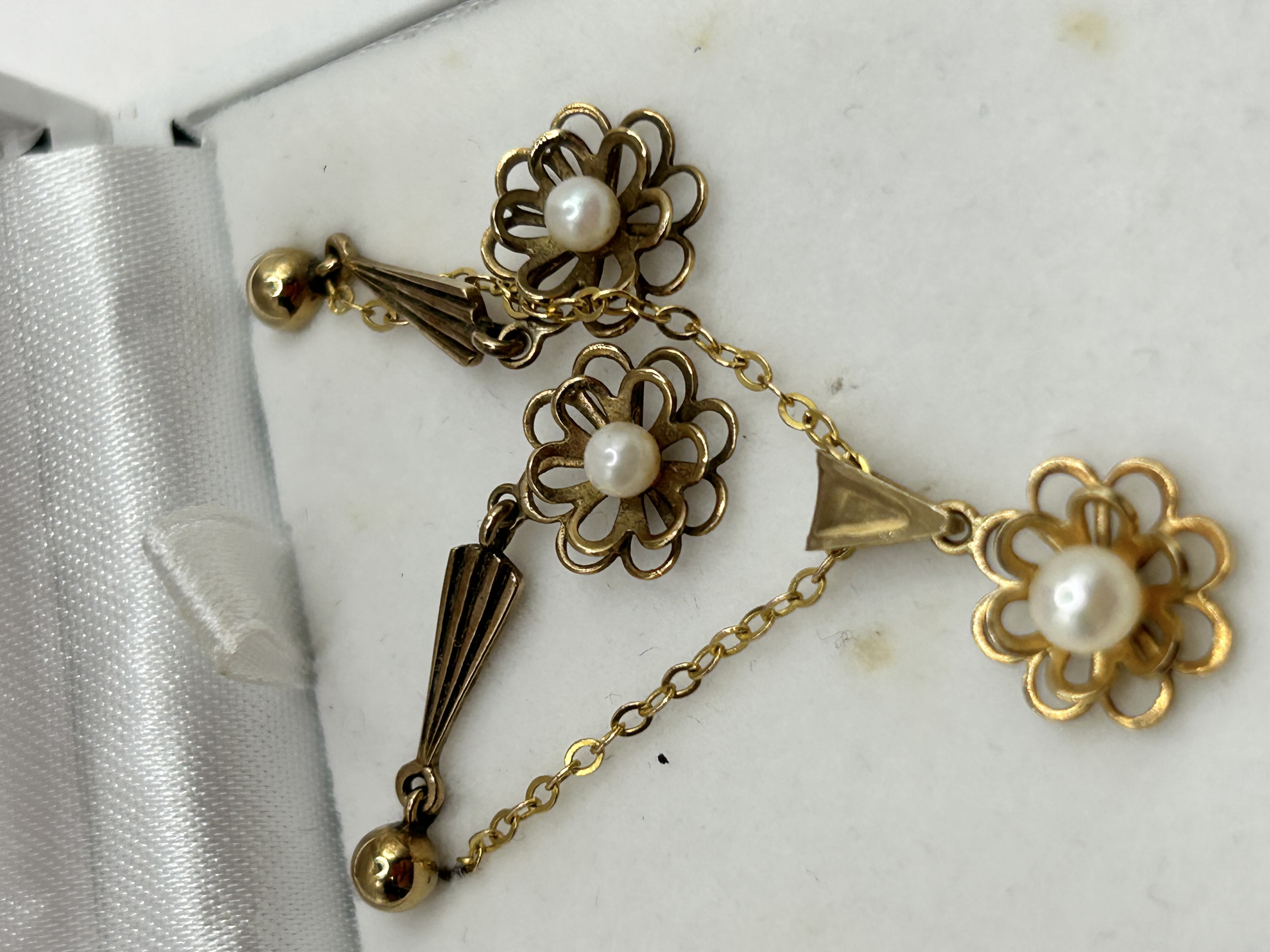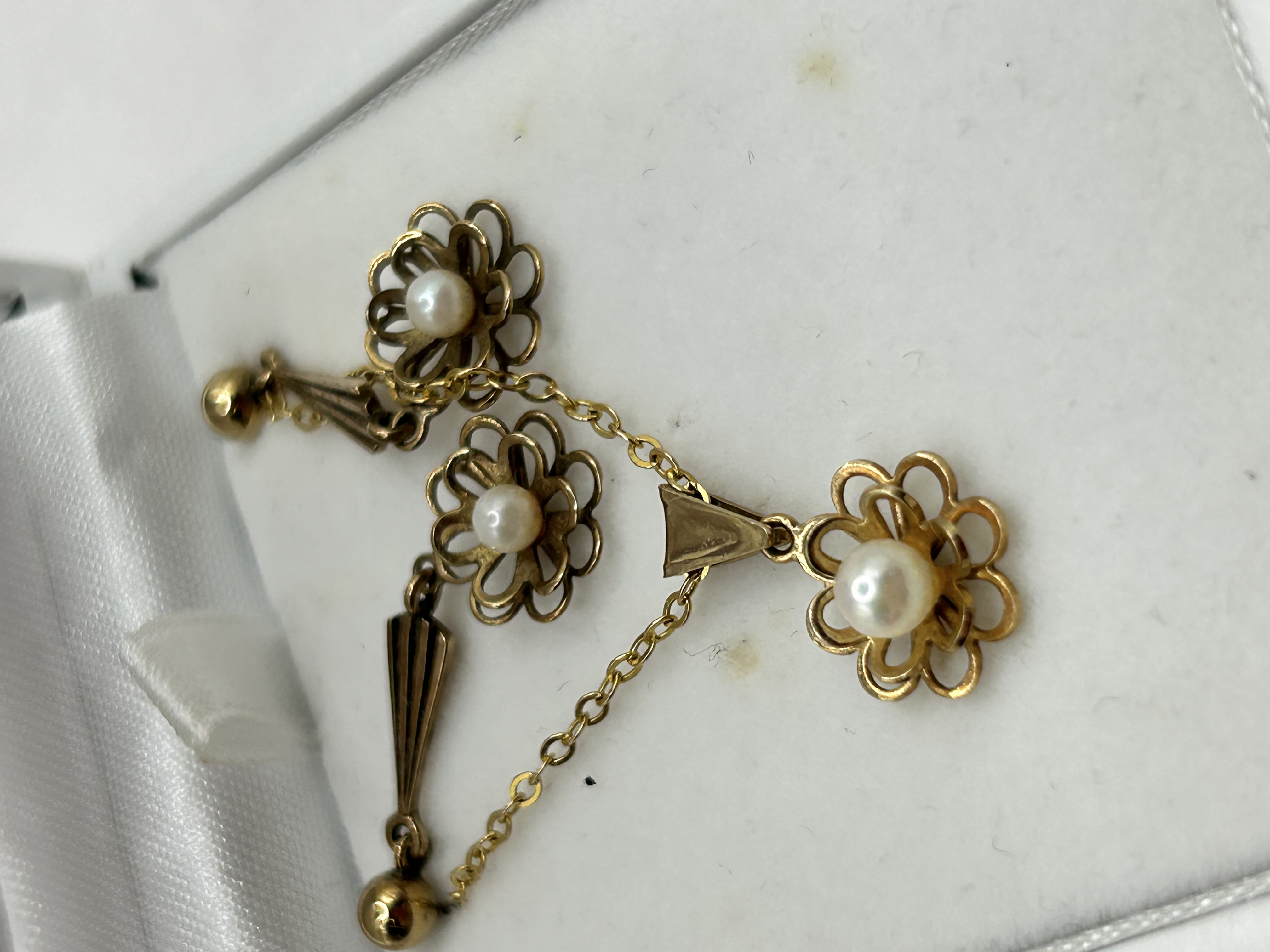 A single antique or vintage jewelry component, likely intended as a dangle earring or part of a lavalier necklace. The piece is constructed of yellow metal, possibly gold or gold-filled, and features three openwork floral cluster motifs. Each cluster is centered with a small, white spherical pearl. These elements are linked by fine chain segments. The design incorporates stylized geometric drops, including a ribbed, tapered V-shape pendant and two ball terminals. The overall aesthetic suggests an Edwardian or early Art Deco style. No visible hallmarks, maker’s marks, or inscriptions are discernible.