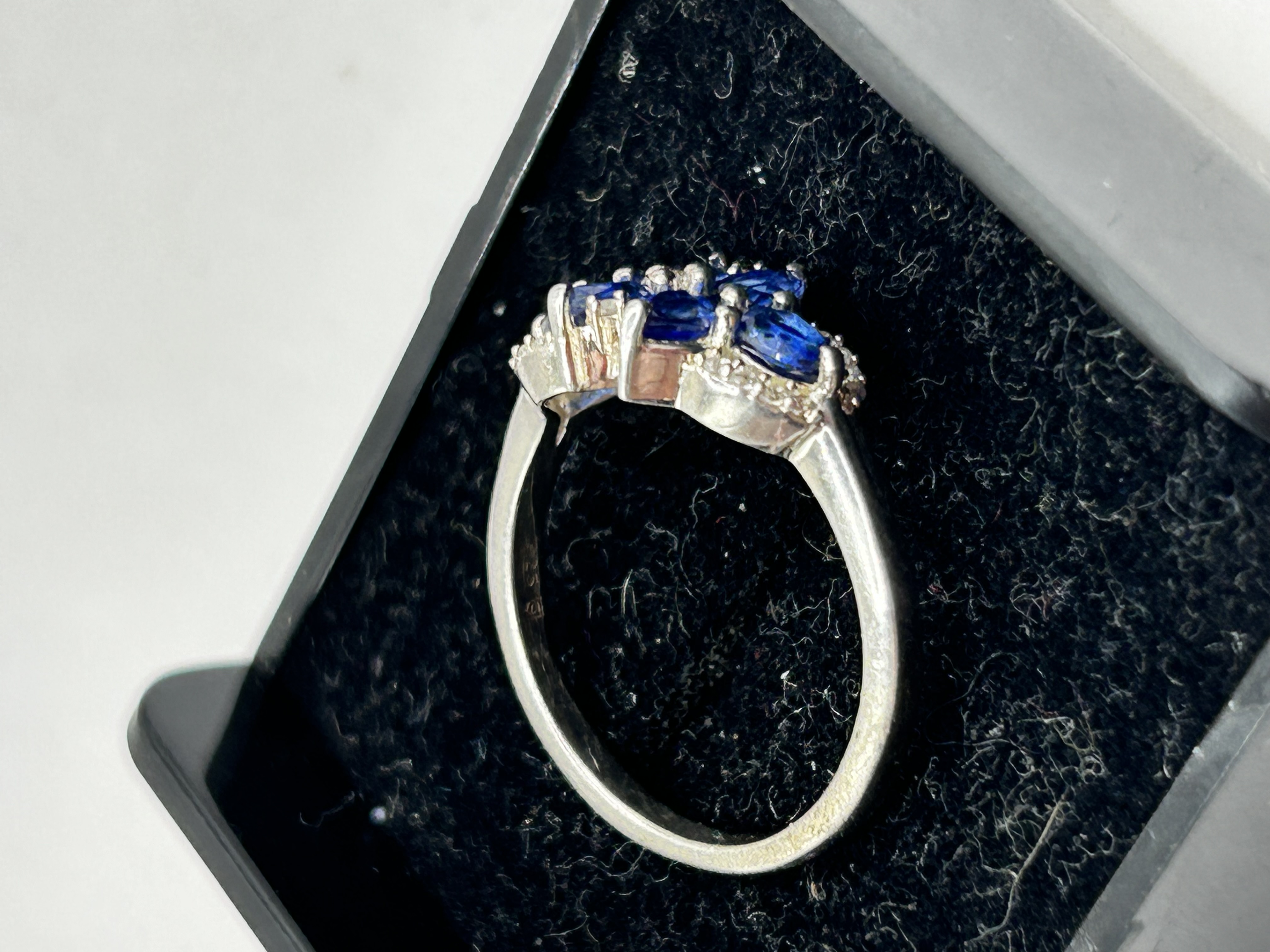 A silver-tone ring featuring a large cluster of marquise-cut deep blue stones accented by small clear stones, with no visible maker’s marks.