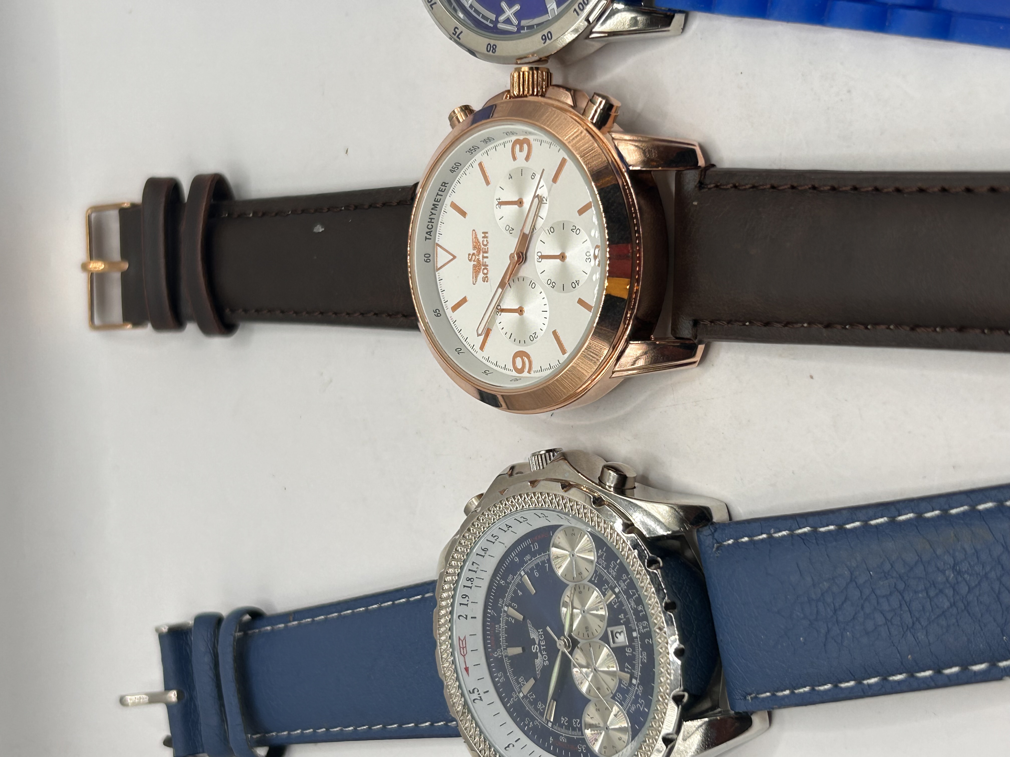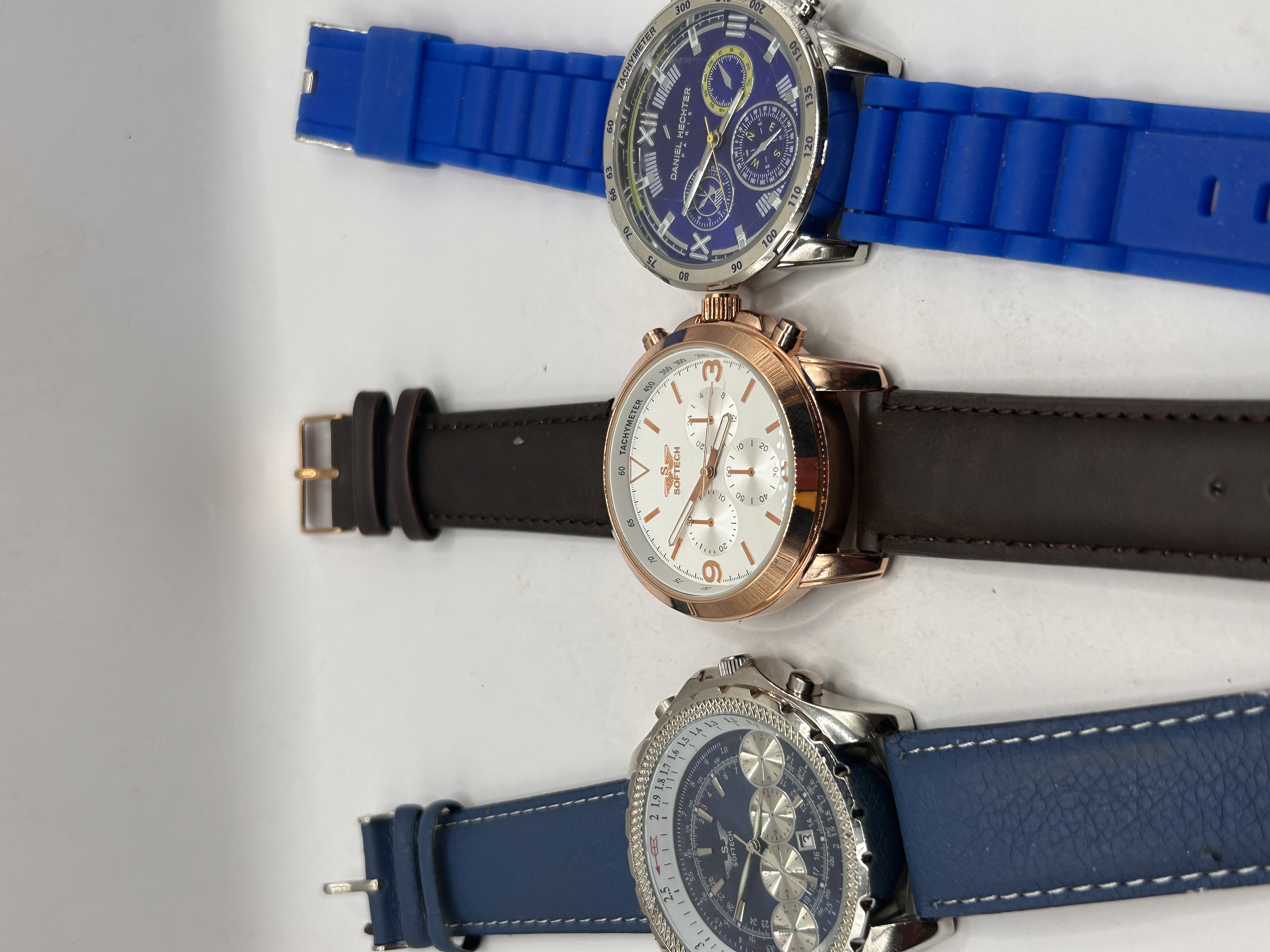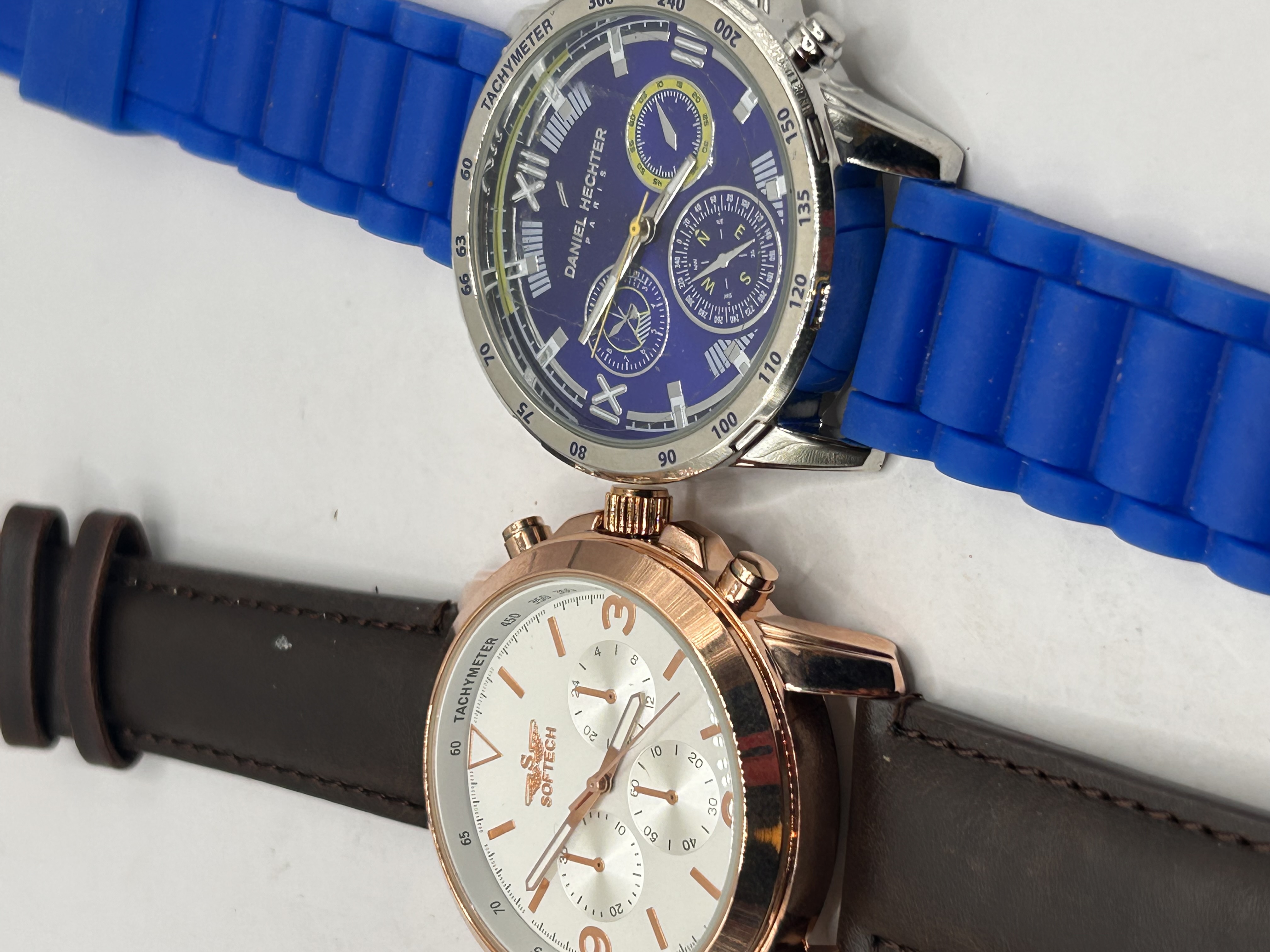 A collection of three modern analog wristwatches. Each timepiece features a multi-dial configuration and a TACHYMETER scale marked on the bezel or inner ring. The lot consists of two distinct brands. The first two watches are marked SOFTECH. The watch on the left features a silver-tone case with a simulated diamond-set bezel, a blue dial, and is fitted with a blue textured faux leather strap. The center watch features a rose gold-tone case, a white dial, and is attached to a dark brown faux leather strap. The third watch is marked DANIEL HECHTER PARIS. This watch features a silver-tone case, a deep blue dial with yellow accents, and is fitted with a bright blue silicone or rubber strap.