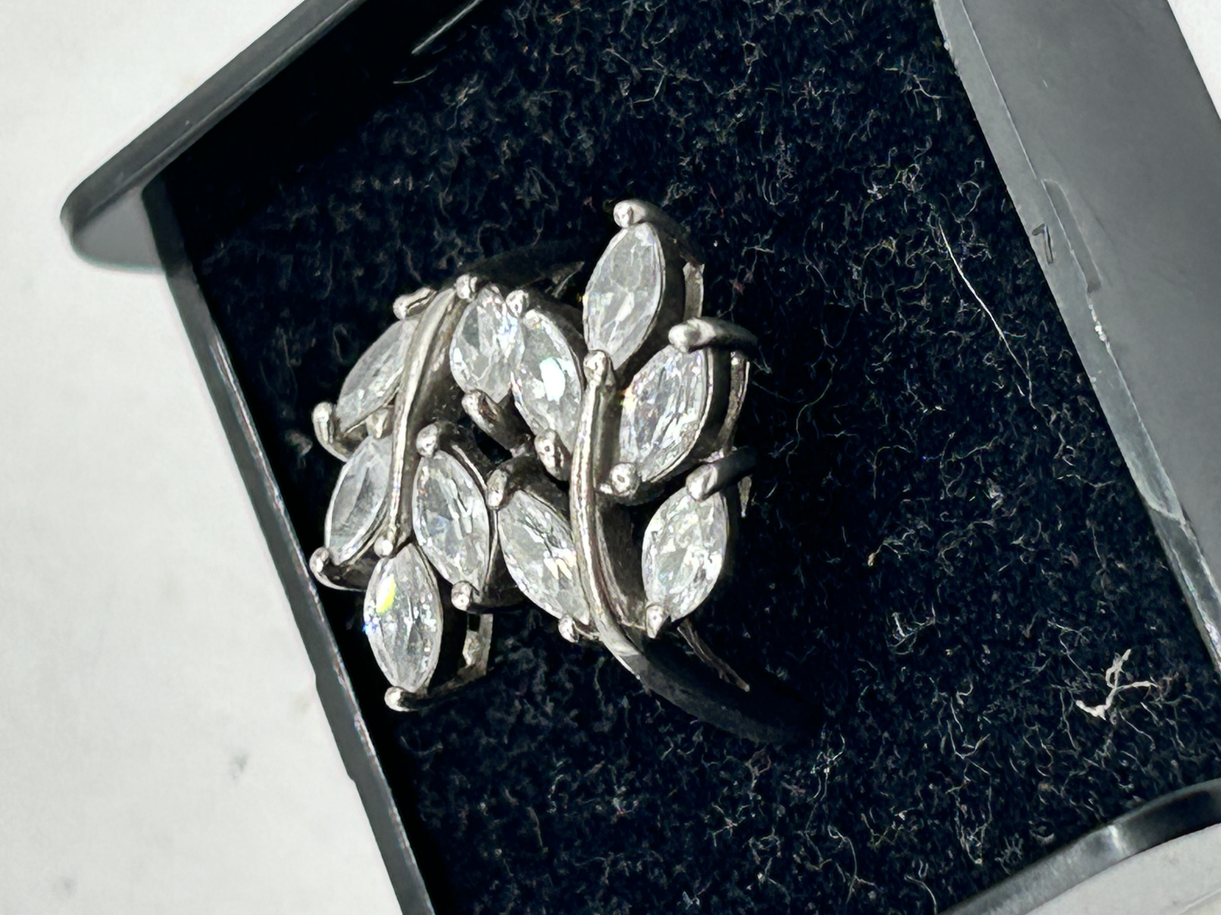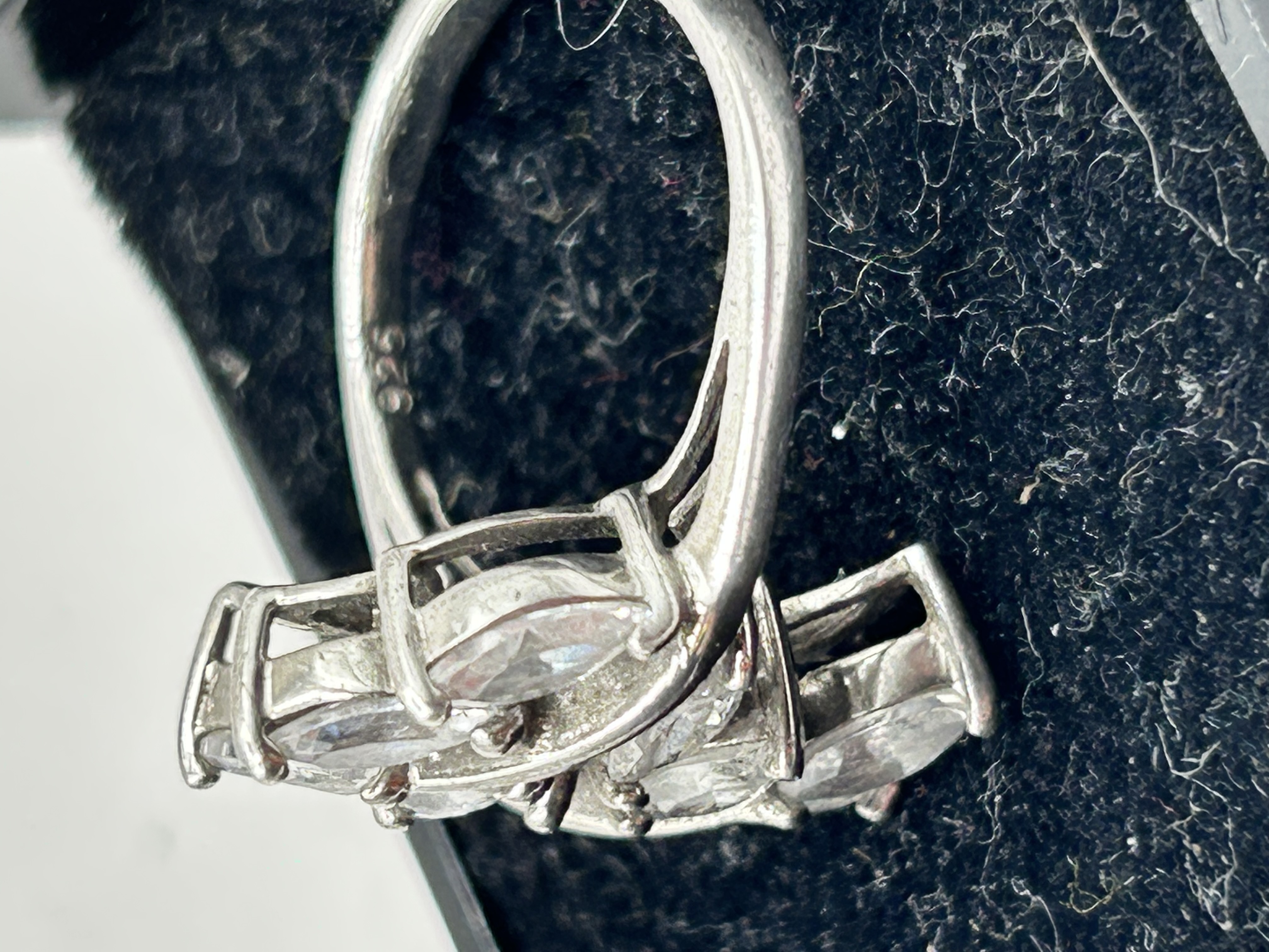A single Silver ring featuring a marquise-cut clear stone cluster setting and marked with a 925 hallmark on the inside of the band.