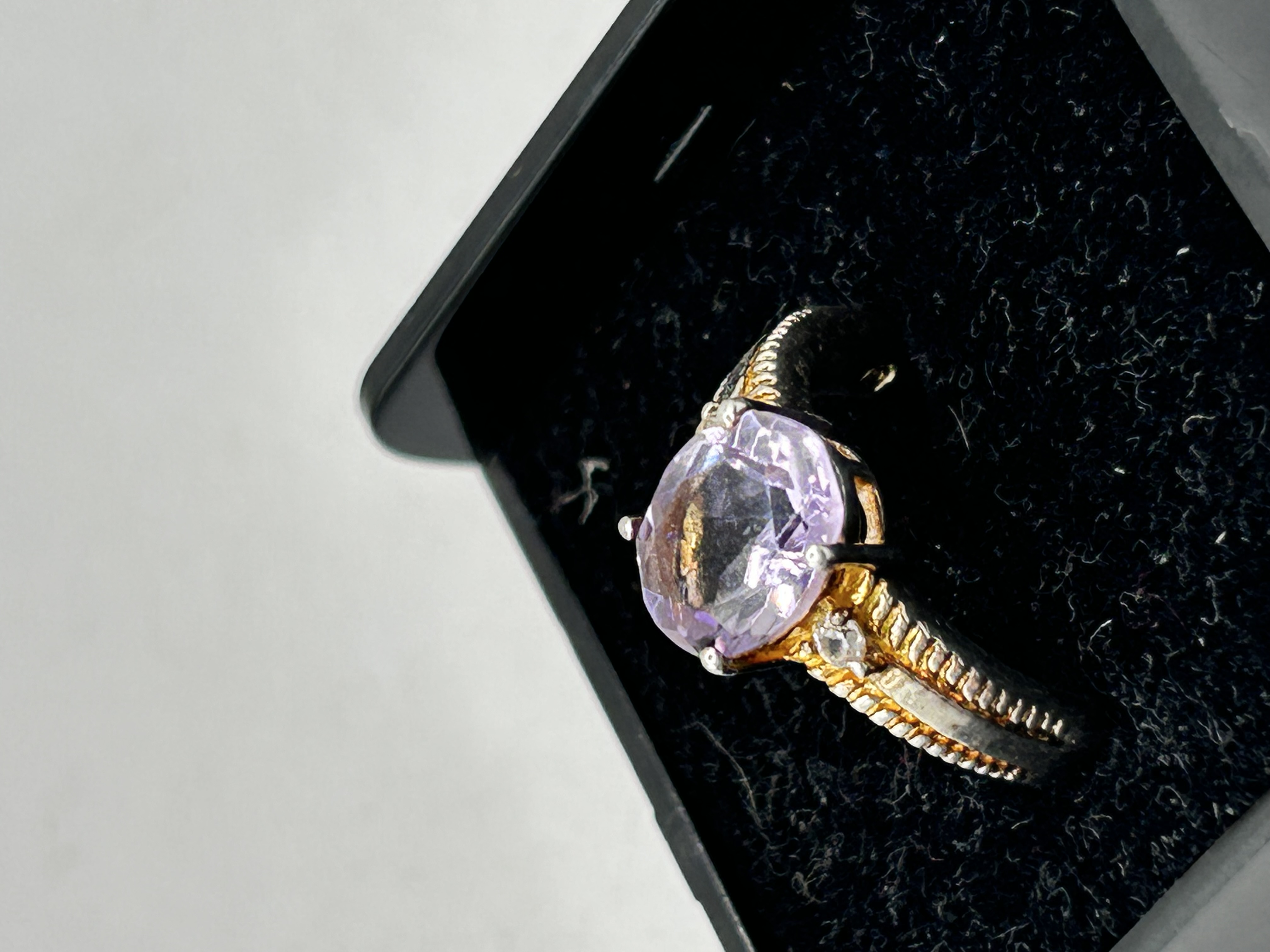 A two-tone silver and gold-accented ring featuring a large oval purple/lavender gemstone, small clear side stones, and inscribed with a 925 hallmark.