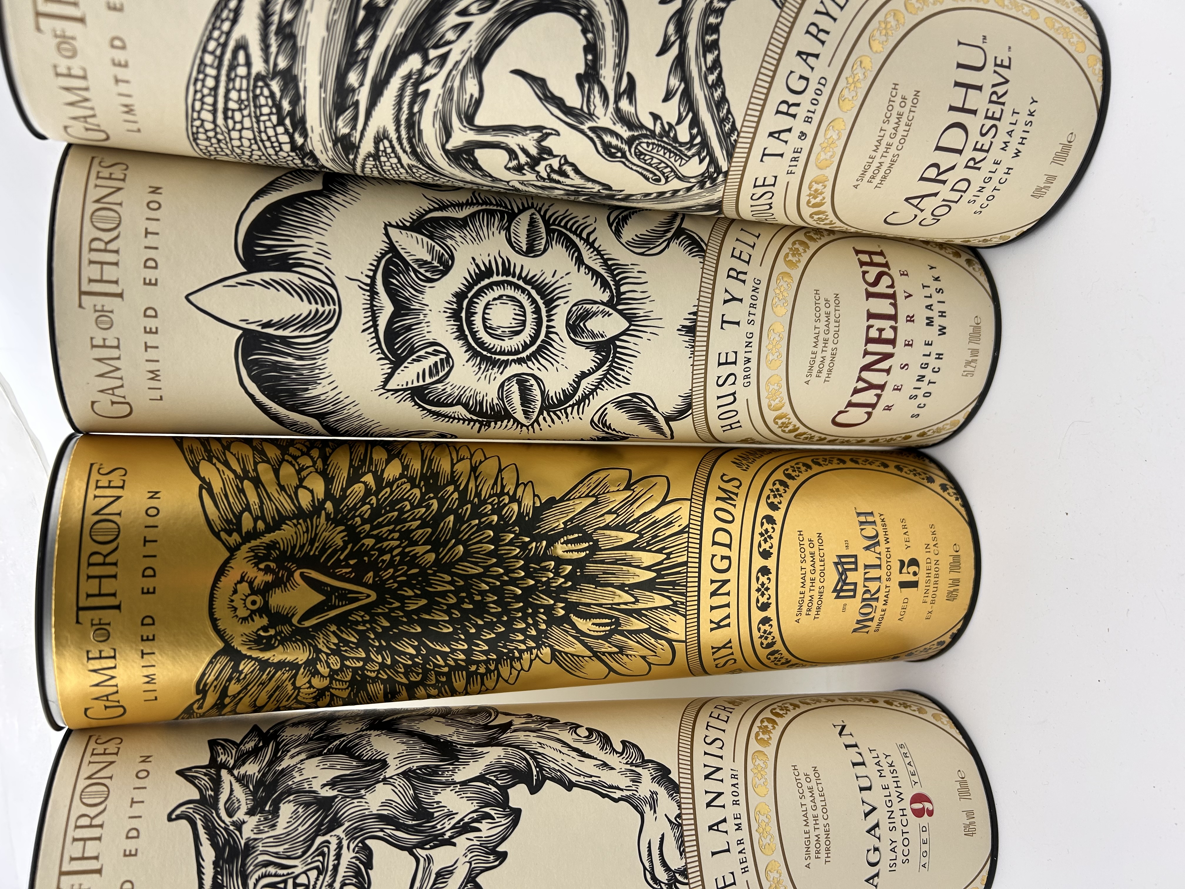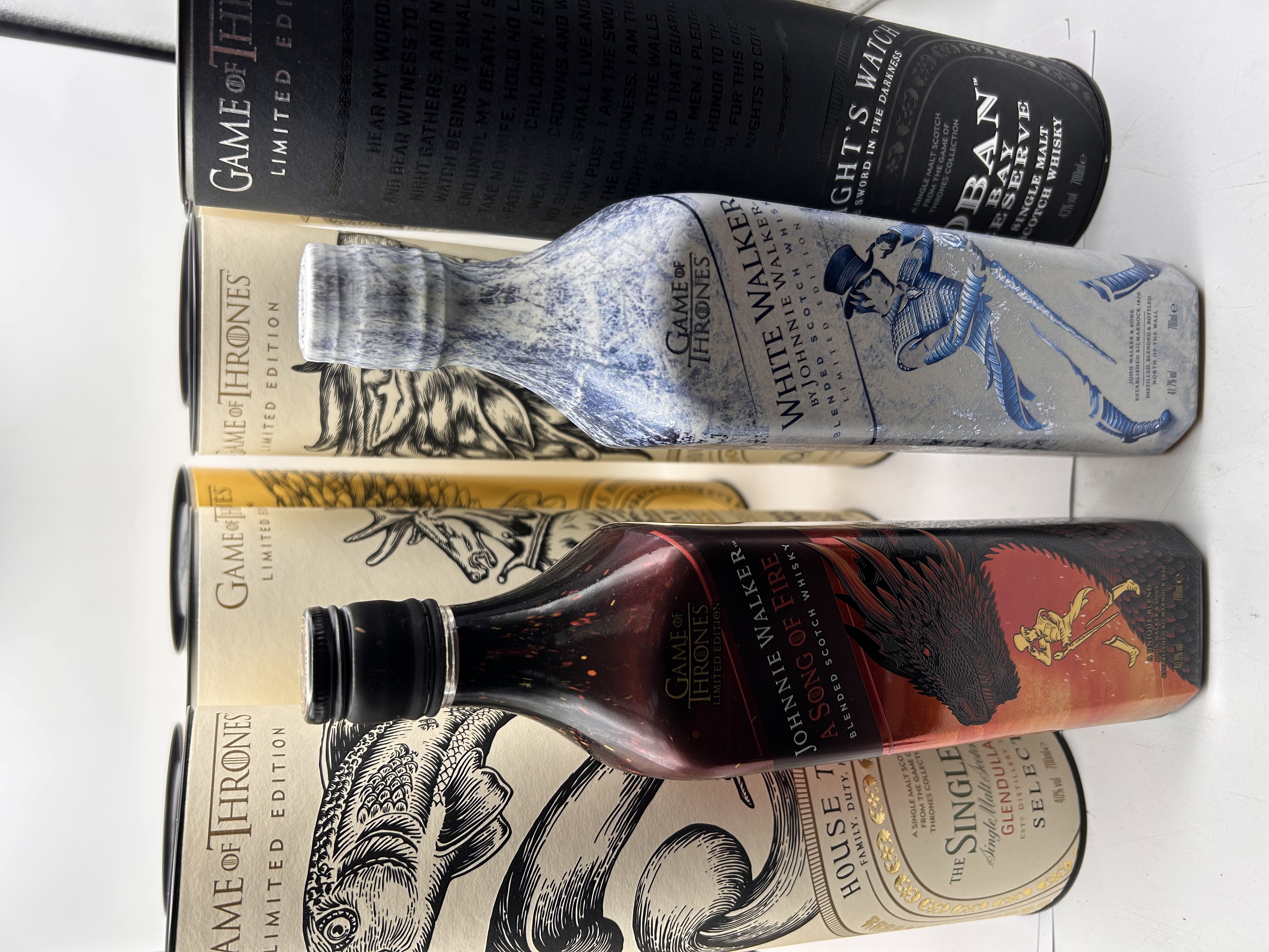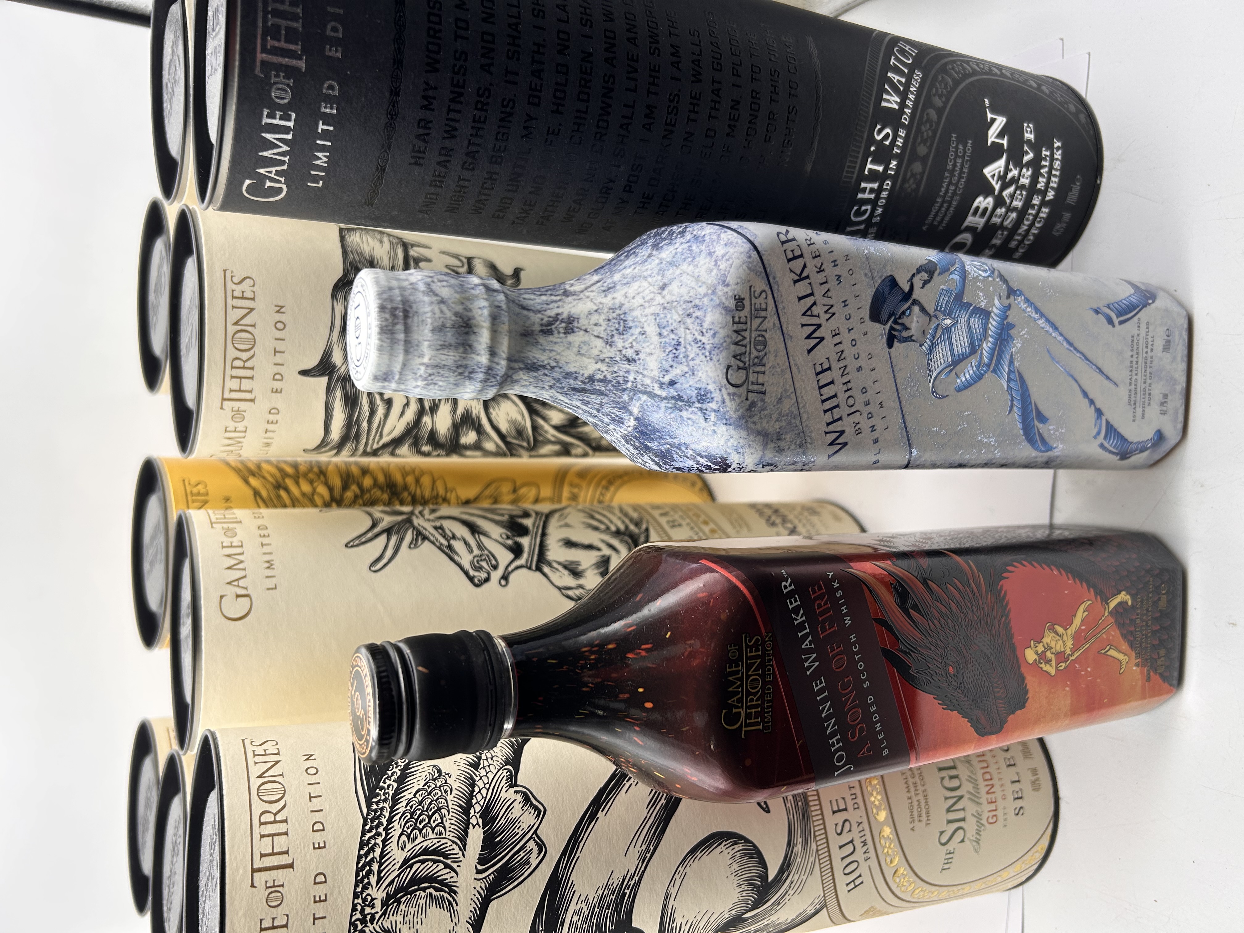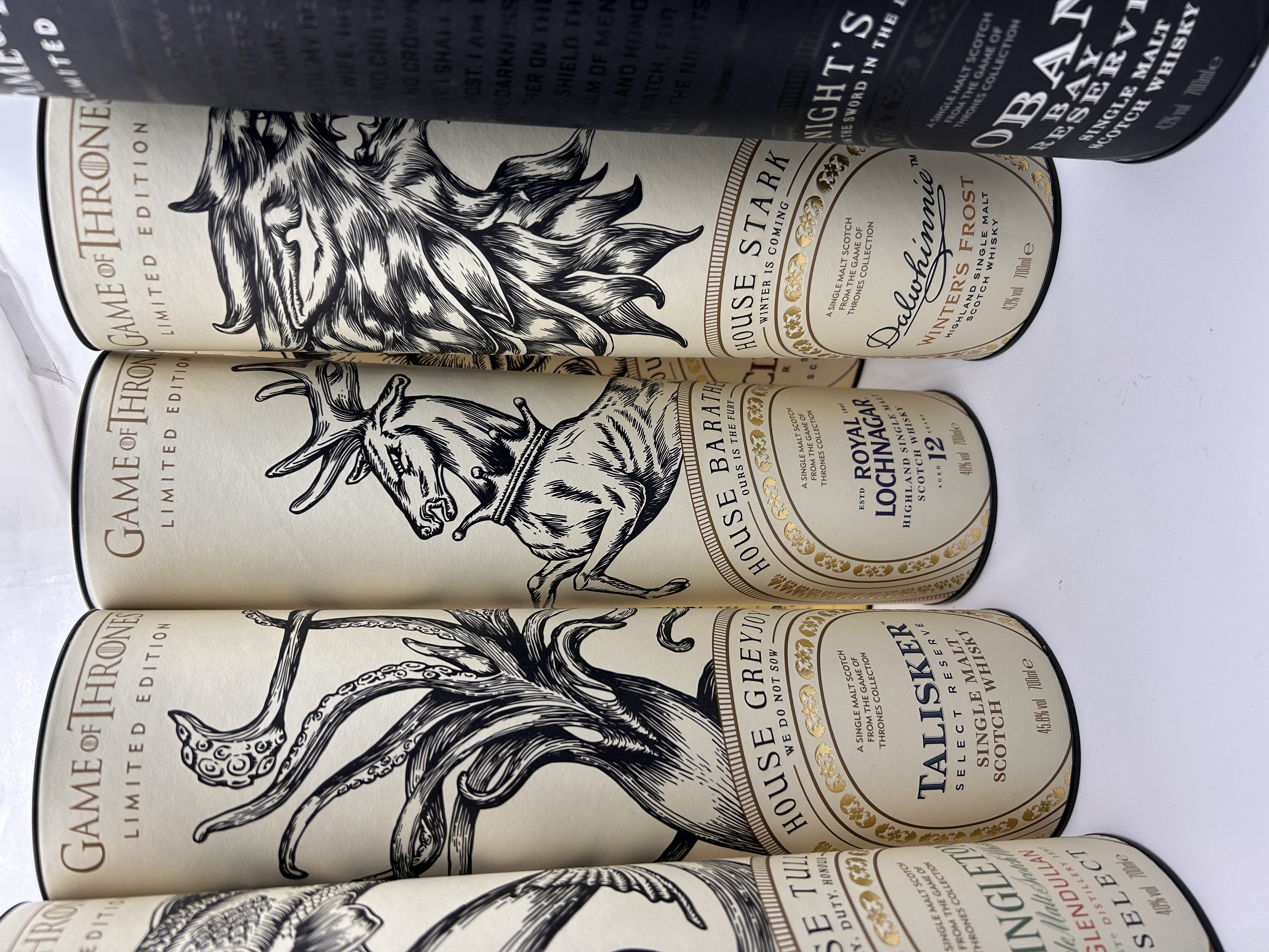 Collection of eleven items comprising the complete Johnnie Walker and Diageo Single Malt Scotch Whisky Game of Thrones Limited Edition series. The collection includes two sealed bottles of Johnnie Walker Blended Scotch Whisky: “White Walker” (featuring a blue and white cracked ice motif) and “A Song of Fire” (featuring a red and black dragon motif). Also included are nine distinct cylindrical cardboard presentation tubes, each containing a 700ml bottle of Single Malt Scotch Whisky representing the Houses of Westeros and other factions. The Single Malt expressions include: House Tully (The Singleton Glendullan Select), House Greyjoy (Talisker Select Reserve), House Baratheon (Royal Lochnagar 12 Year Old), House Stark (Dalwhinnie Winter’s Frost), House Lannister (Lagavulin 9 Year Old), House Tyrell (Clynelish Reserve), House Targaryen (Cardhu Gold Reserve), Oban Night’s Watch, and Mortlach ‘Six Kingdoms’. All bottles are sealed and marked 700ml volume.