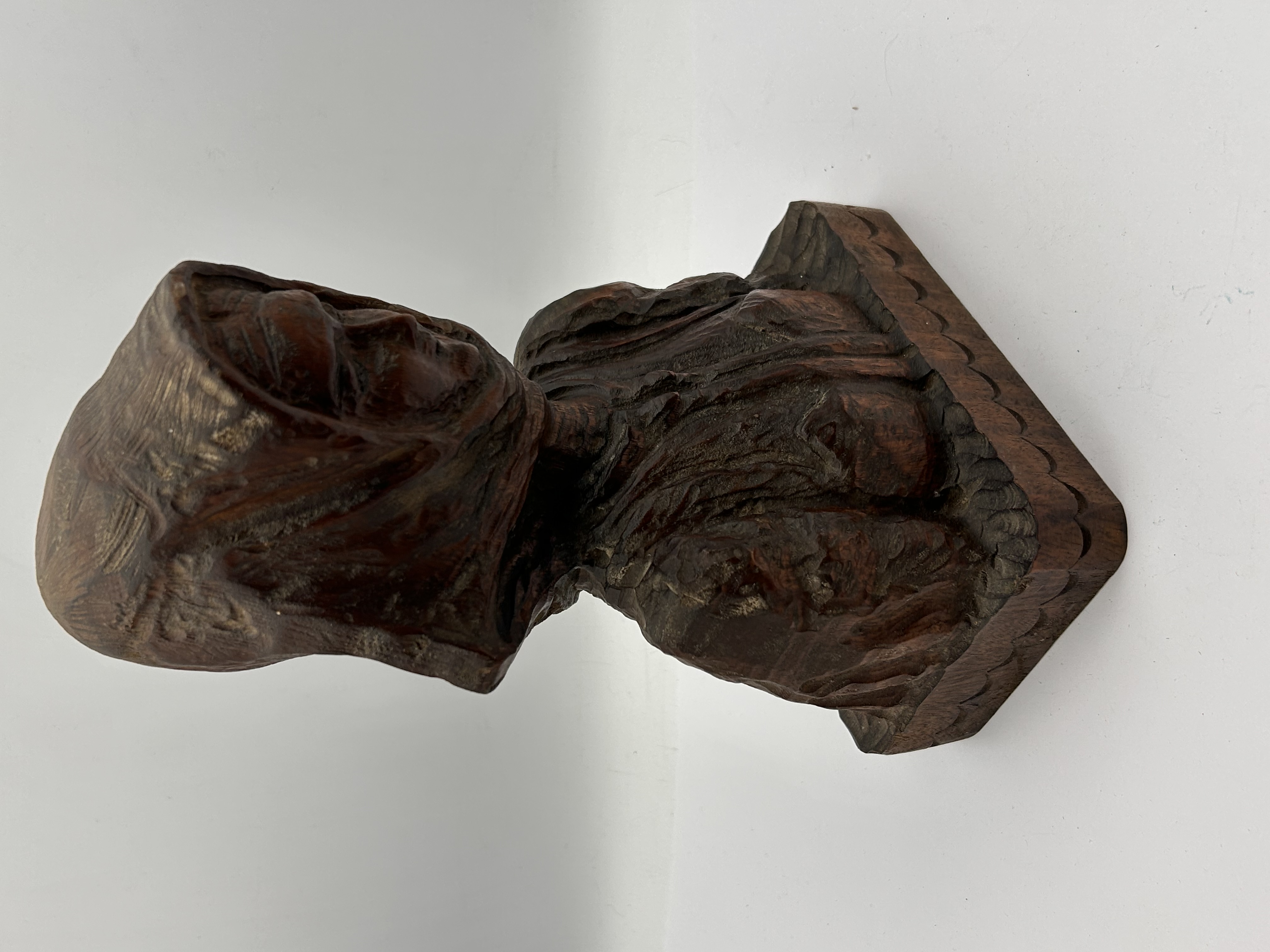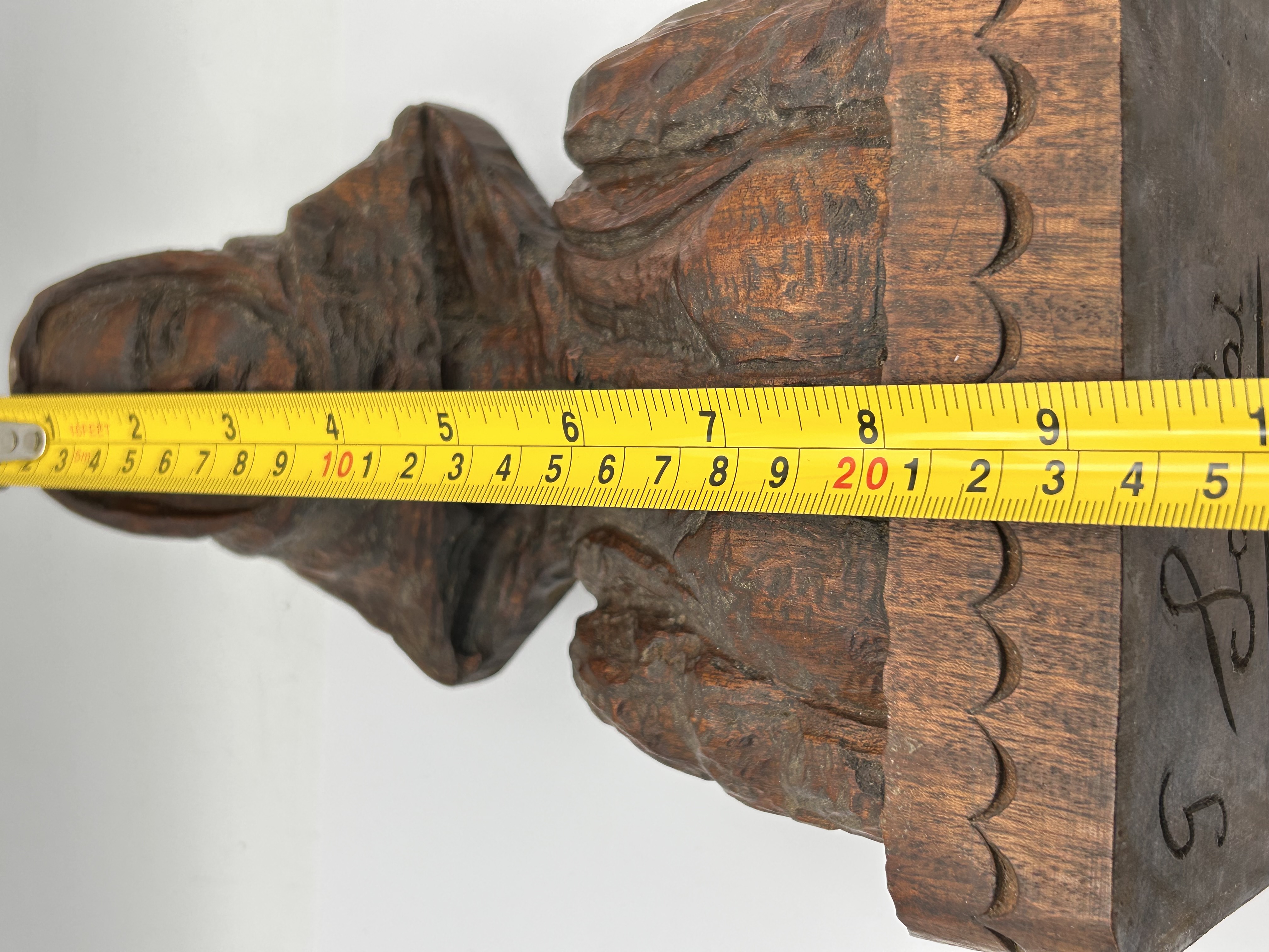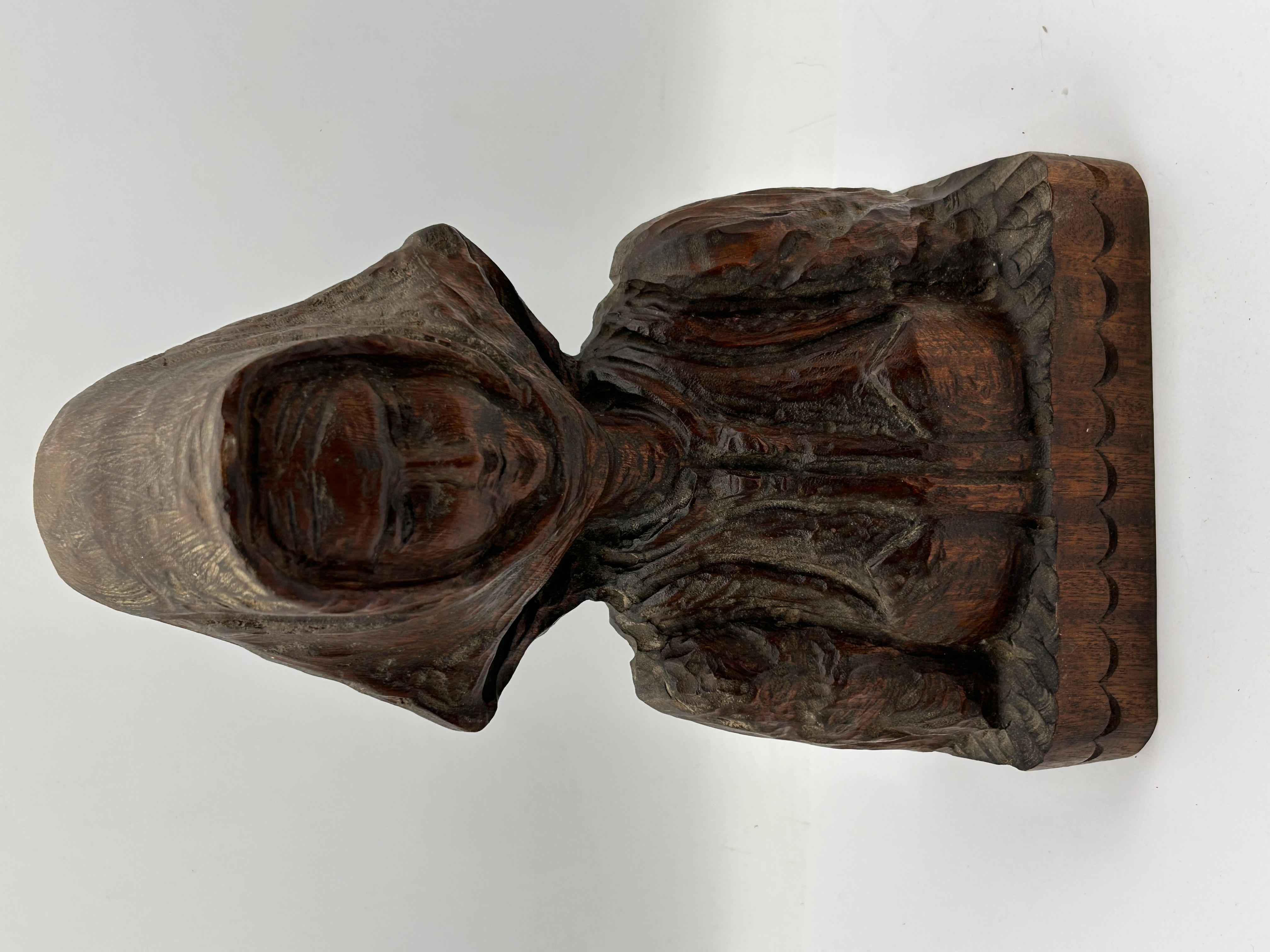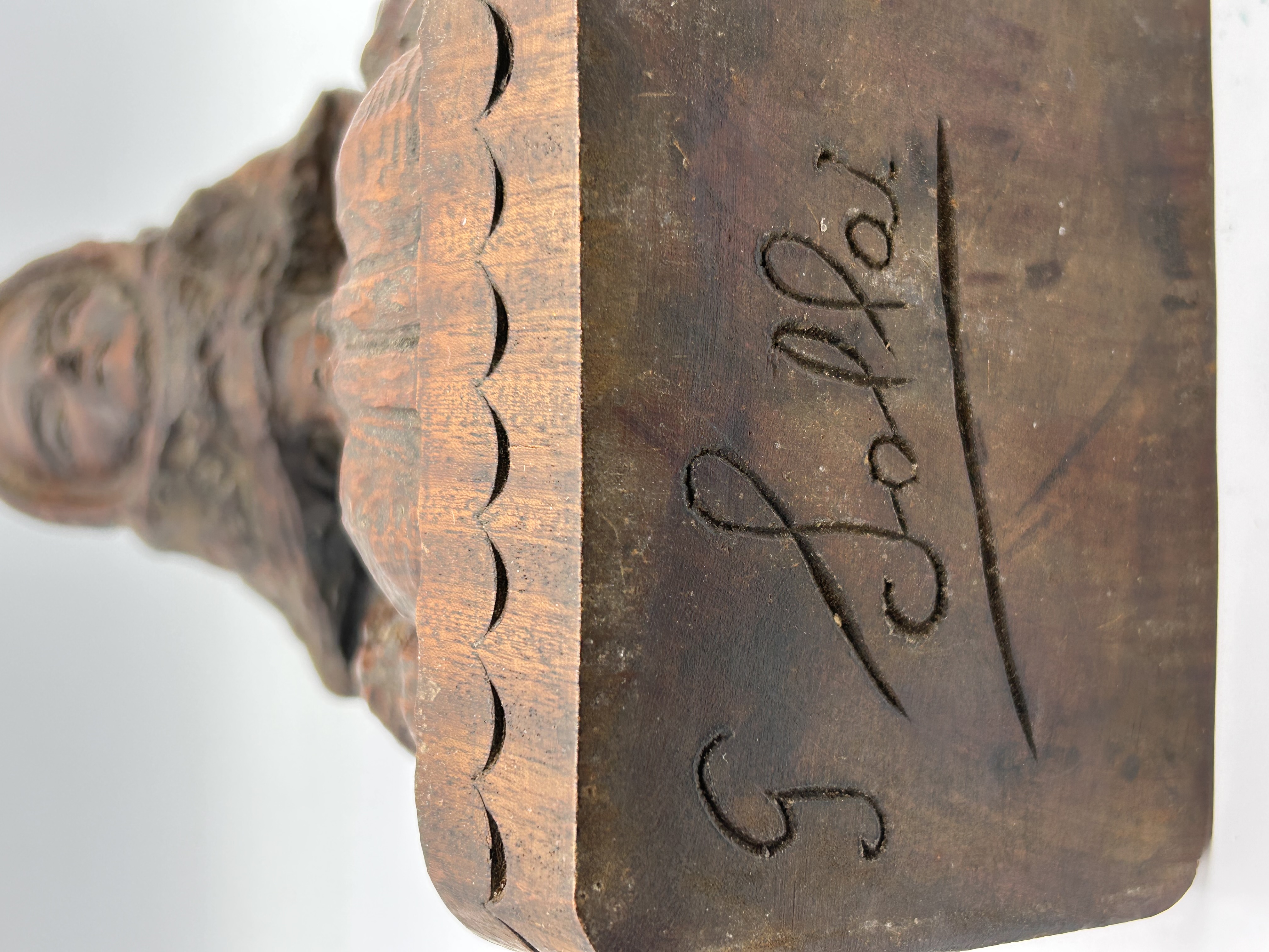 A single carved wood bust depicting a woman wearing a heavy shawl or kerchief, executed in a deeply textured, folk art or rustic style using dark hardwood. The sculpture features expressive carving marks detailing the folds of the clothing and the contours of the face, suggesting a vigorous carving technique. The bust rests on a rectangular integral base. The top edge of the base features a repetitive scalloped design carved along the perimeter. The front face of the base bears an incised signature reading “I. Sallai.”