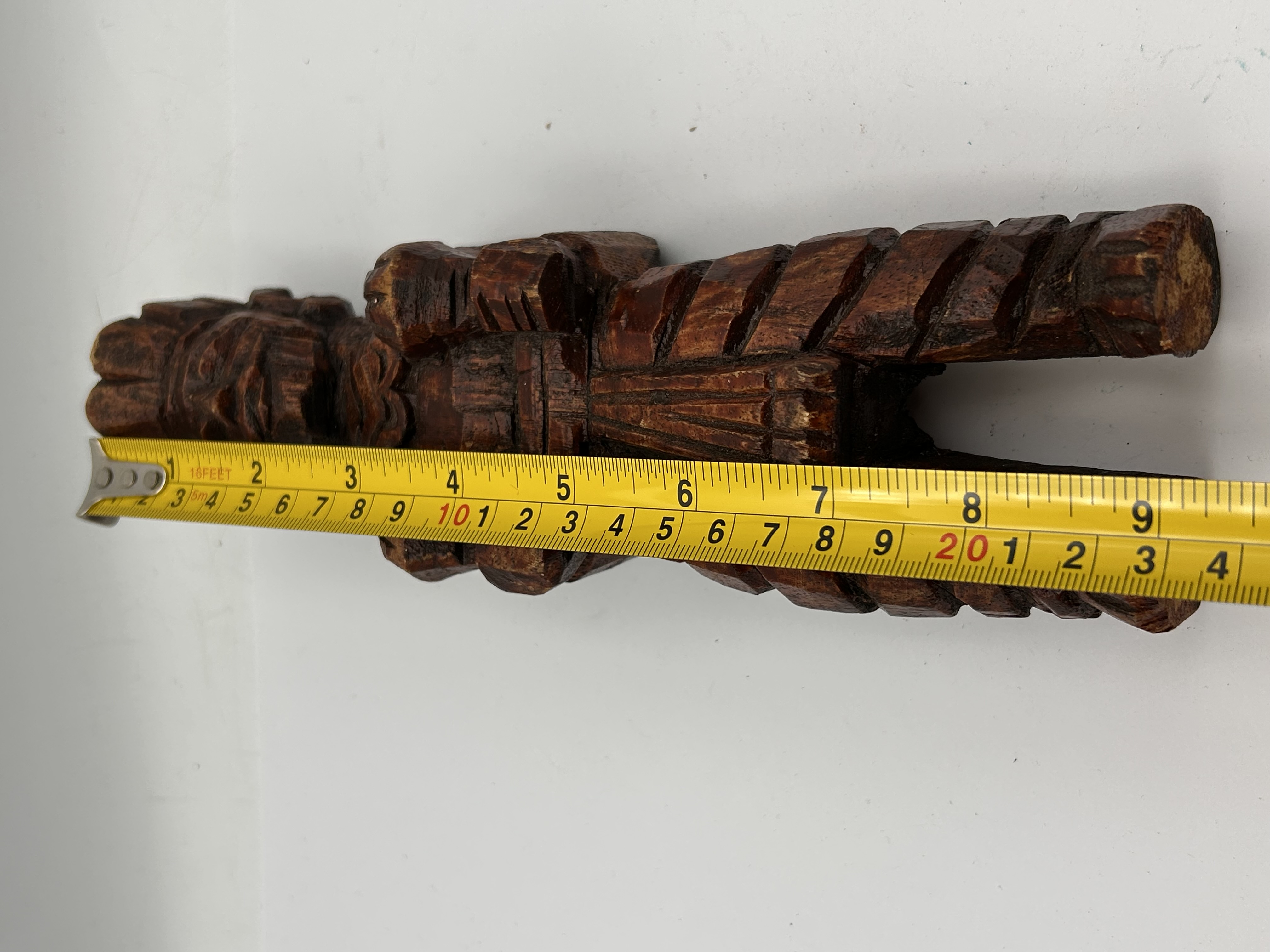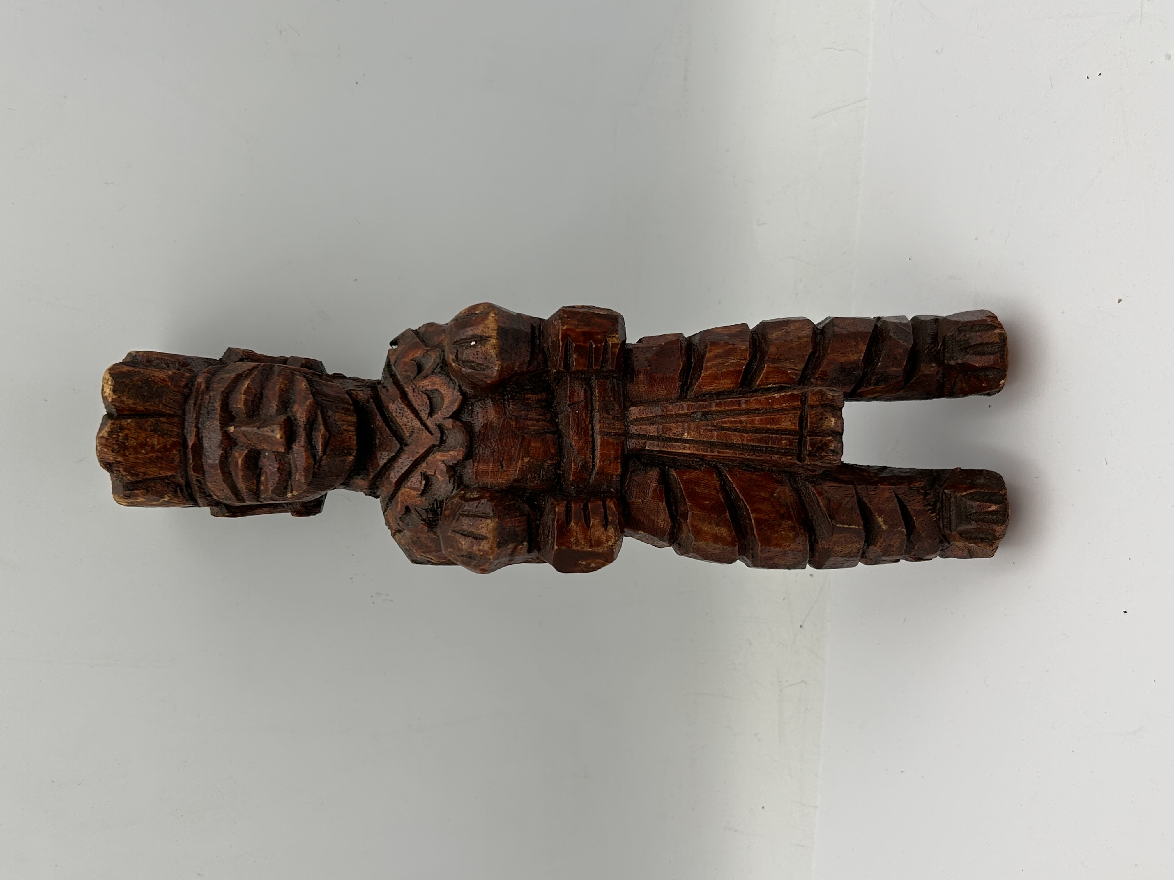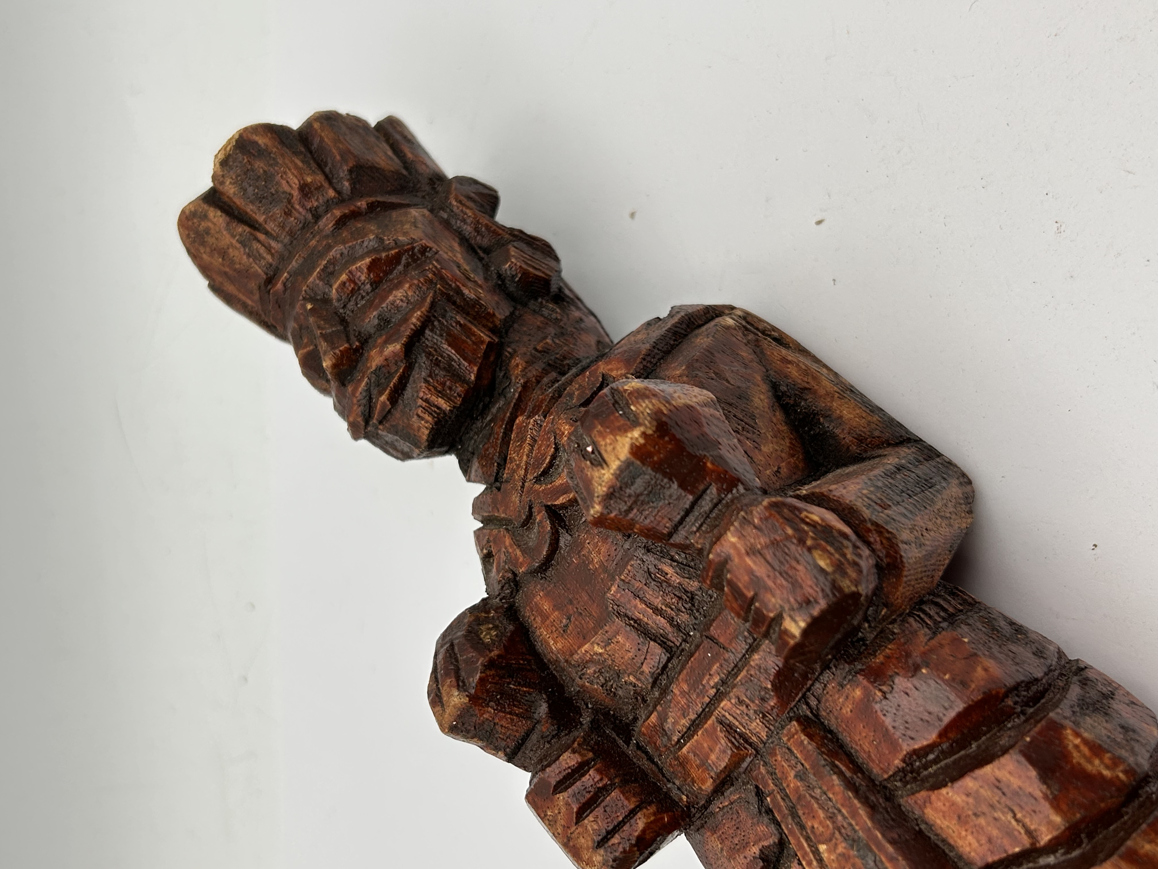 A single carved wooden figurative sculpture crafted from a dense, reddish-brown hardwood. The carving is executed in a blocky, geometric style, imitating a stylized ancient or indigenous figure, possibly influenced by Mesoamerican or general tribal aesthetics, consistent with folk art or tourist carvings. The figure features a prominent layered headdress, textured clothing, and highly stylized limbs held close to the body. The wood is finished with a glossy varnish or polish. No visible text, signatures, or specific markings are present.