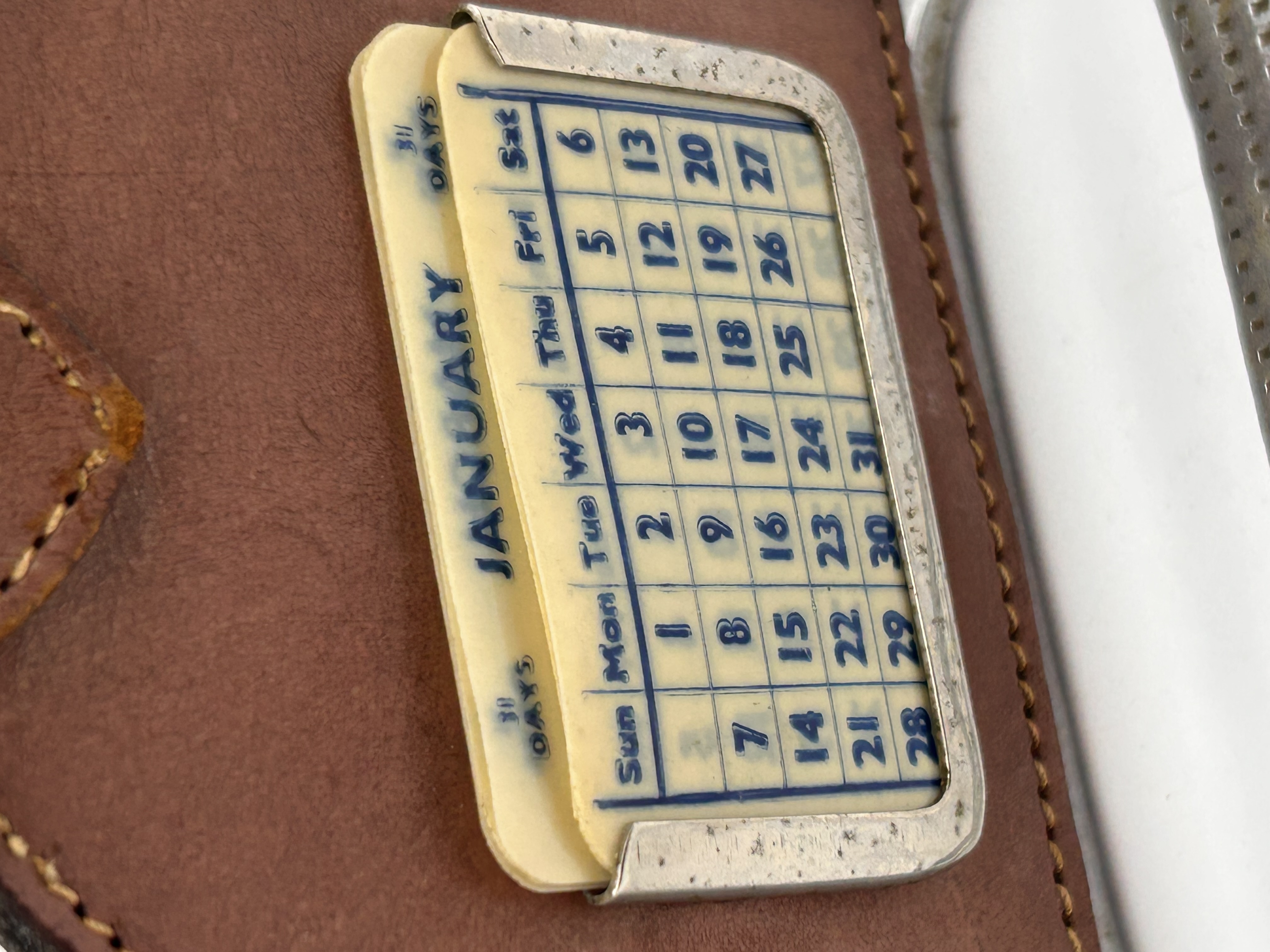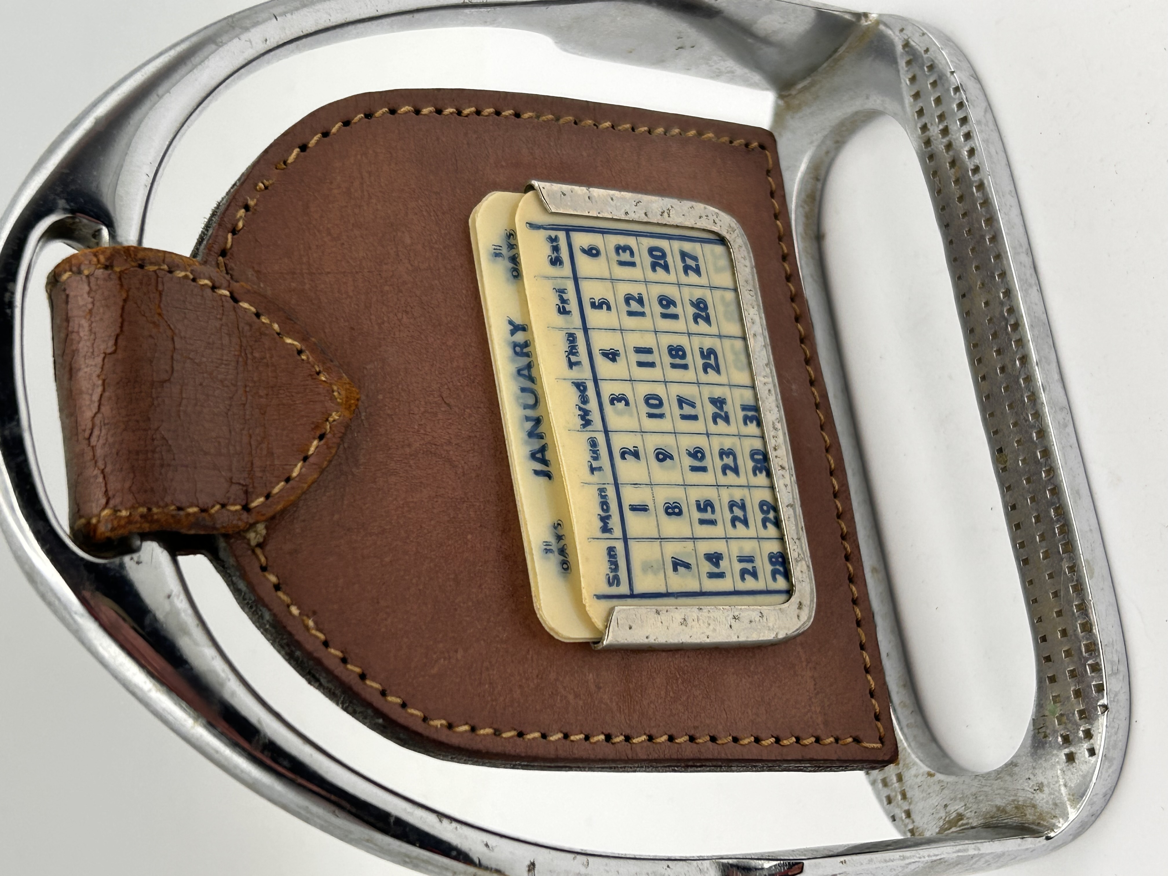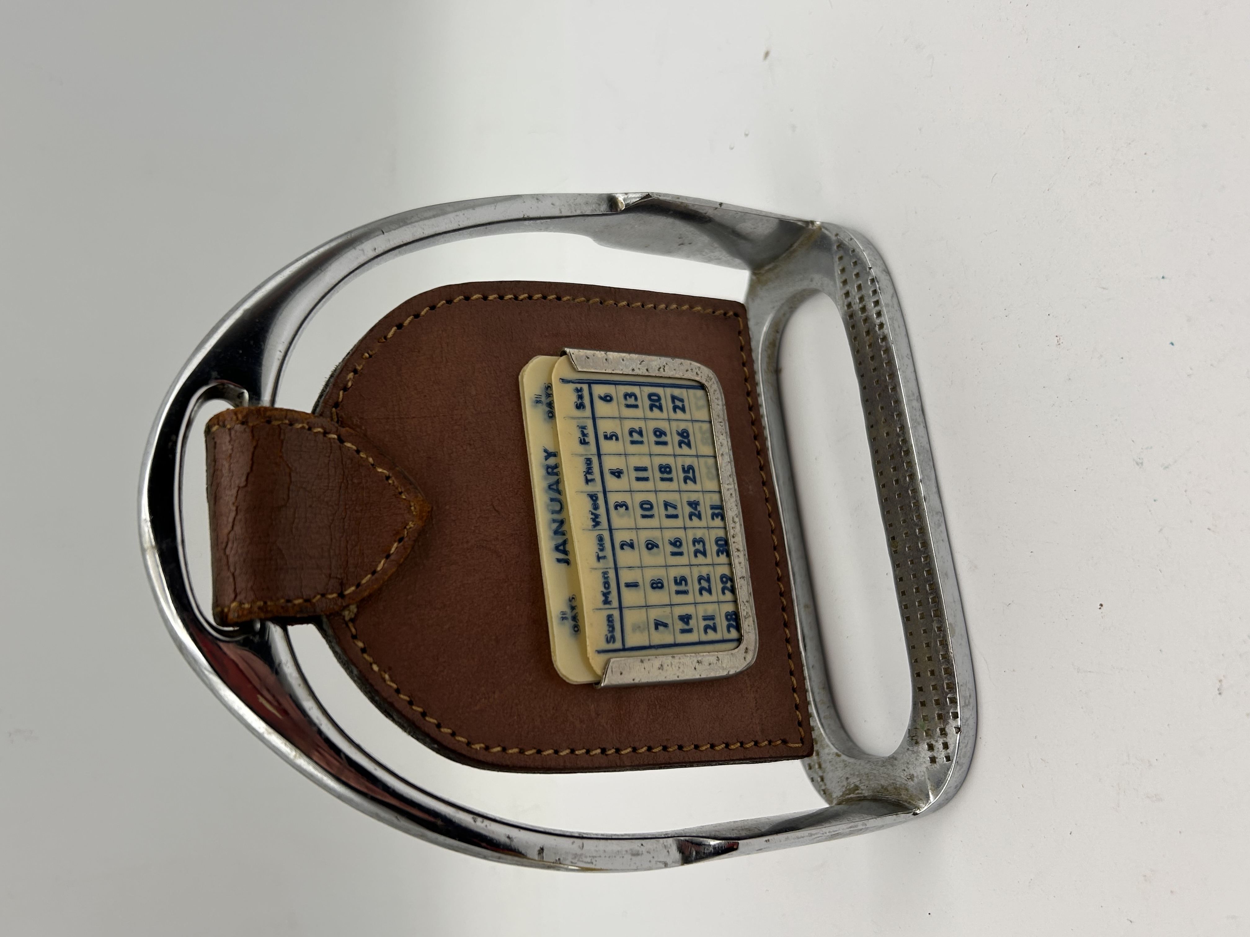 A vintage desk perpetual calendar housed within a polished metal frame styled after an English equestrian stirrup iron. The frame is constructed of chrome-plated metal or aluminum, featuring a textured grid pattern on the tread base. Mounted centrally within the stirrup frame is a stitched brown leather housing containing a manual slide perpetual calendar mechanism set into a small metal pocket. The visible calendar card displays the month “JANUARY” along with the days of the week and date numbers 1 through 31. Research suggests similar examples have been attributed to makers such as Mappin & Webb, placing this item within the category of luxury equestrian-themed desktop accessories.