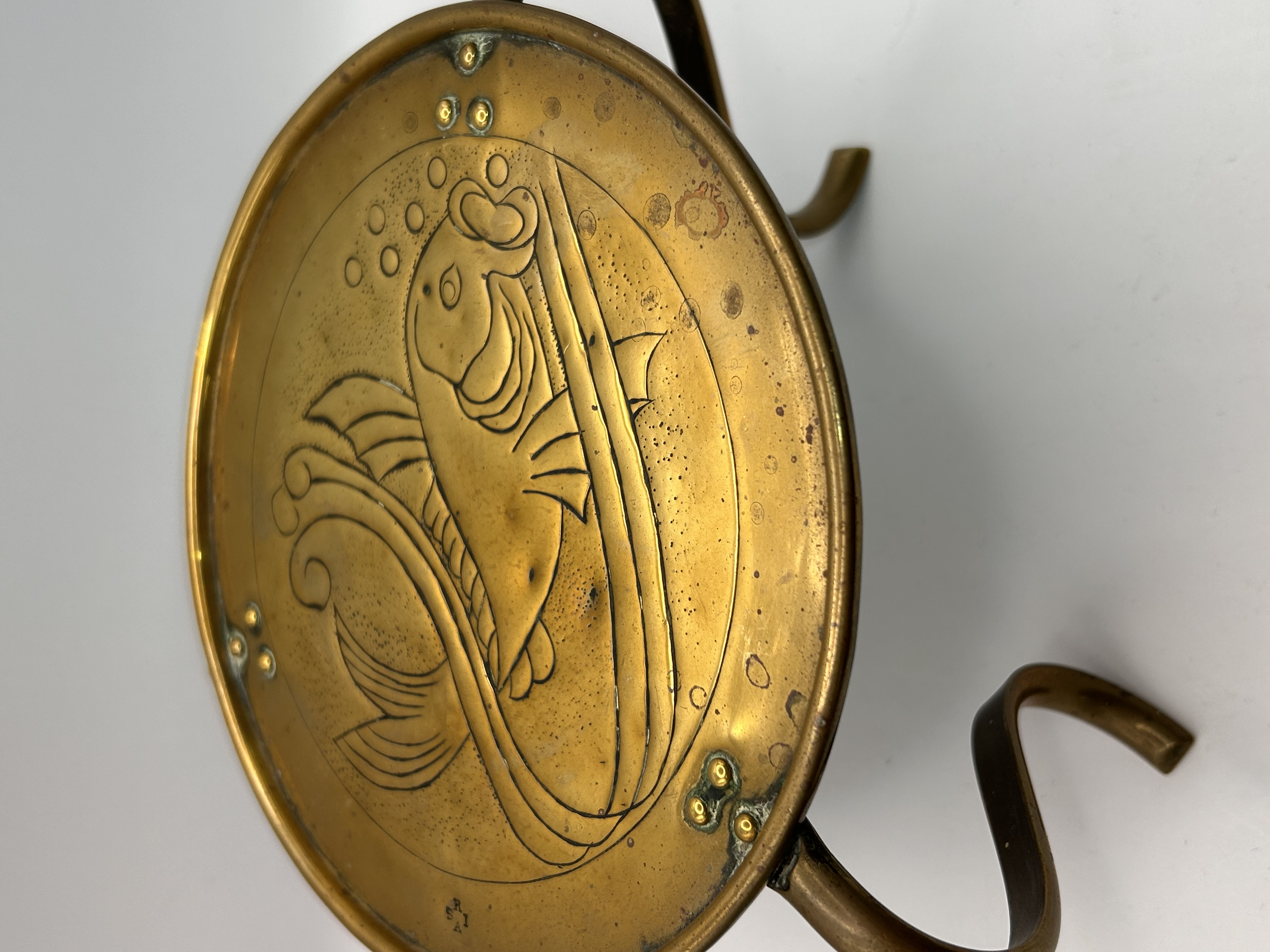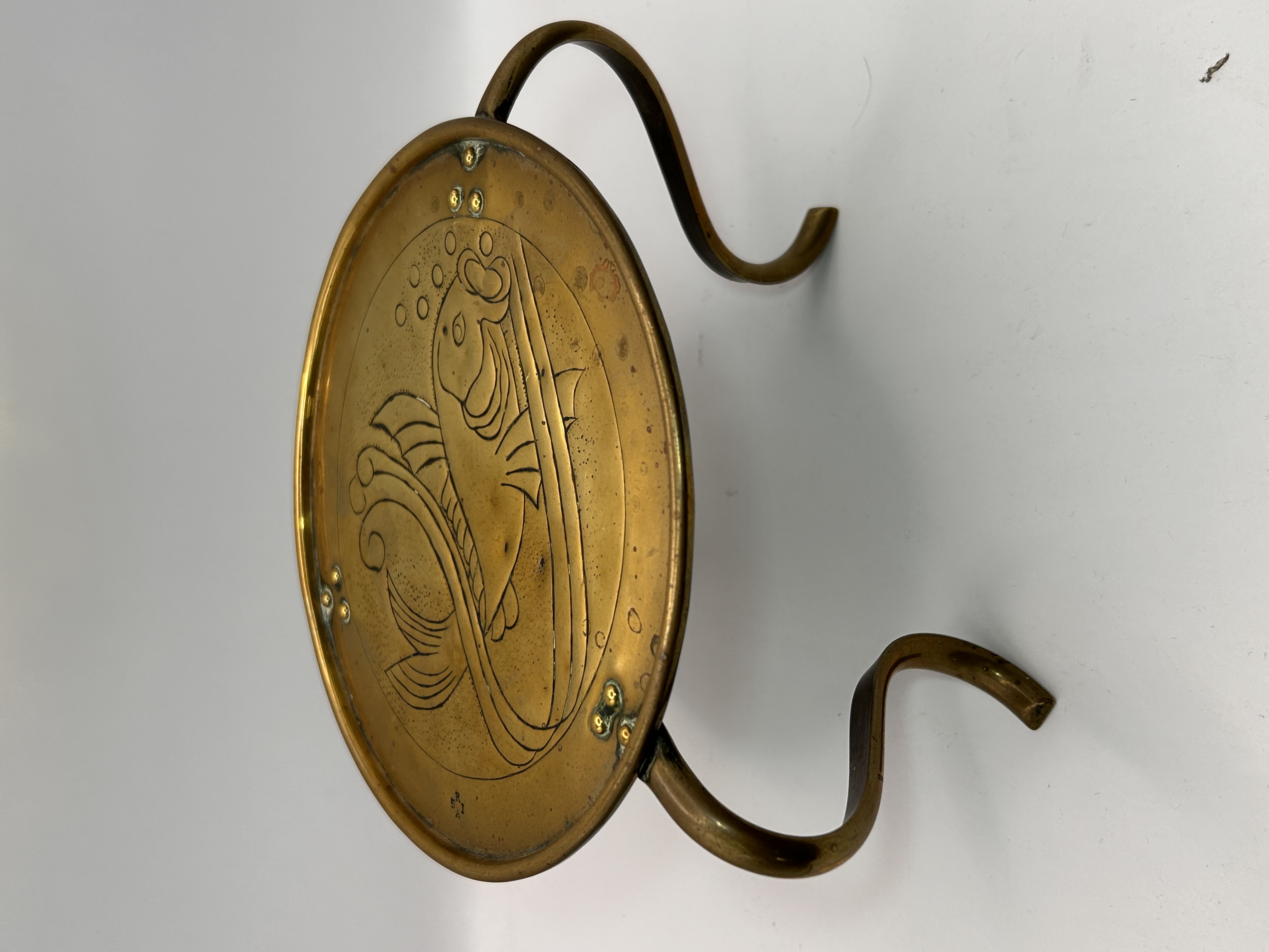 A single stand constructed of brass, likely serving as a trivet or a base for a small table gong, consistent with the Art Nouveau or Arts and Crafts periods. The circular top features an etched or engraved design depicting a stylized fish swimming amidst flowing aquatic elements and bubbles. The round plate is supported by three separate, scrolling legs, which are attached beneath the rim using small brass rivets. The object exhibits a faint stamped inscription near the edge of the central design field reading S & A I.