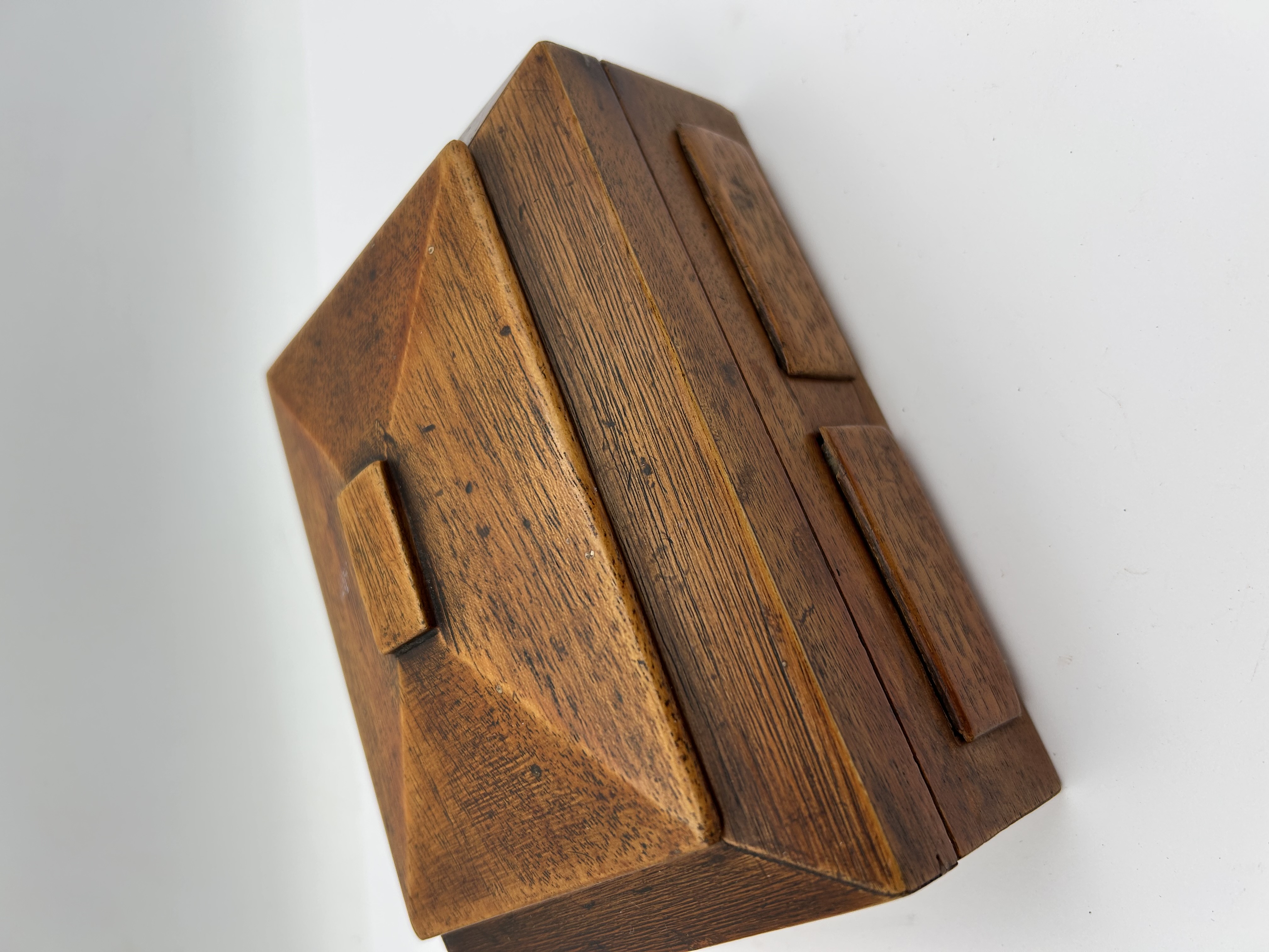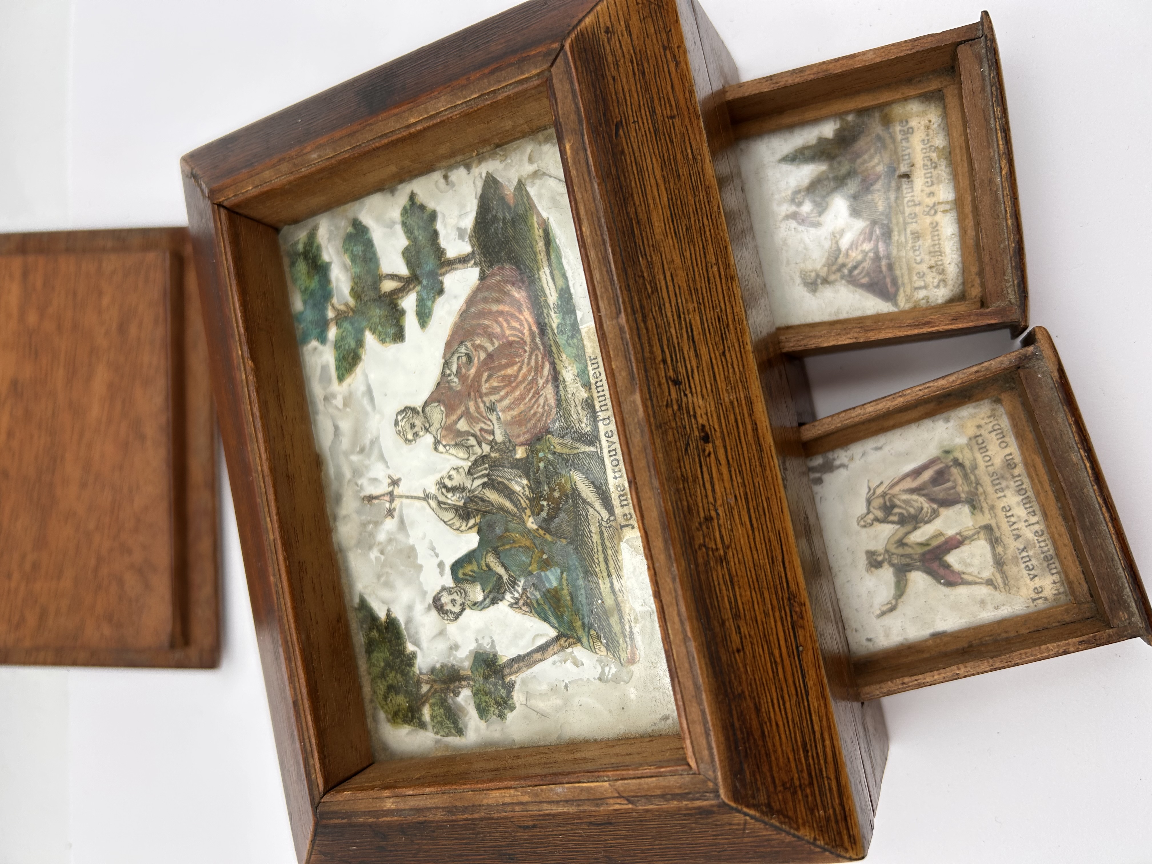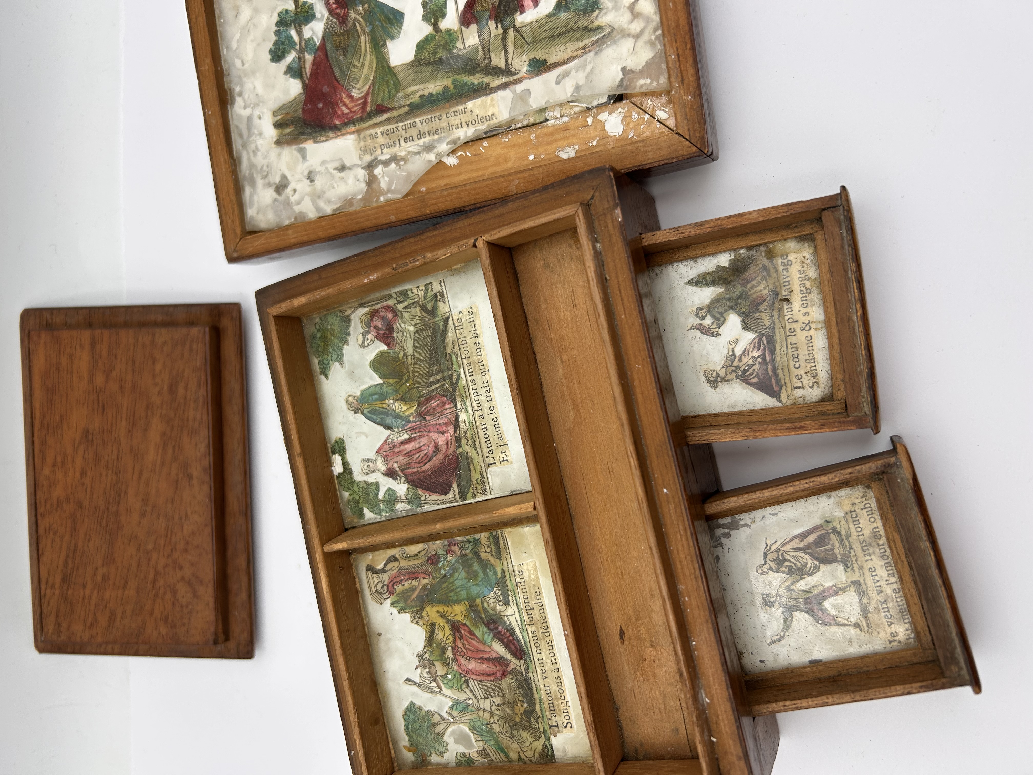 A three-piece assembly consisting of a rectangular wooden box, a conforming pyramidal lift-off lid, and one separate framed interior illustration panel. The box is constructed from dark, stained wood and is designed as a Tableau or Billet-doux (love message) box, likely dating to the late 18th or early 19th century based on style. The main body features two small pull-out drawers on the front face and fitted internal compartments. The drawers and internal sections contain small, hand-colored engravings or lithographs depicting allegorical or romantic scenes, set beneath a clear coating or glass. Visible French text is present beneath these scenes, including inscriptions such as Je me trouve d’humeur, Je veux vivre sans souci / Et mettre l’amour en oublie, and Le cœur le plus sauvage / S’anime & s’engage…. The pyramidal lid rests atop the box when closed.