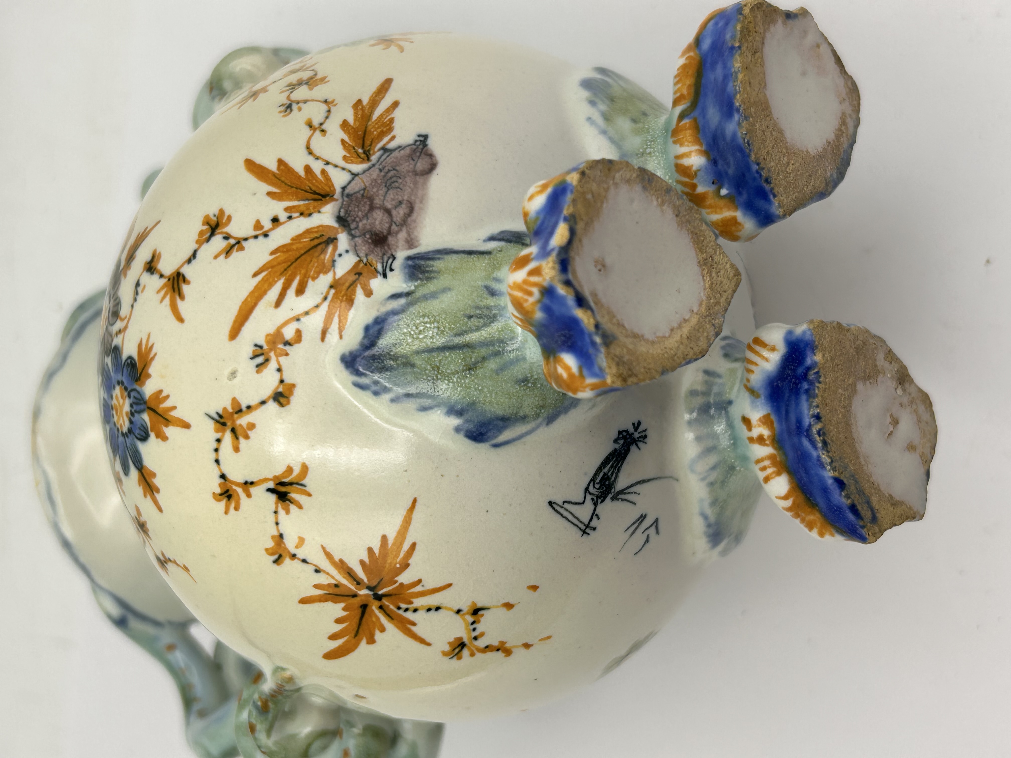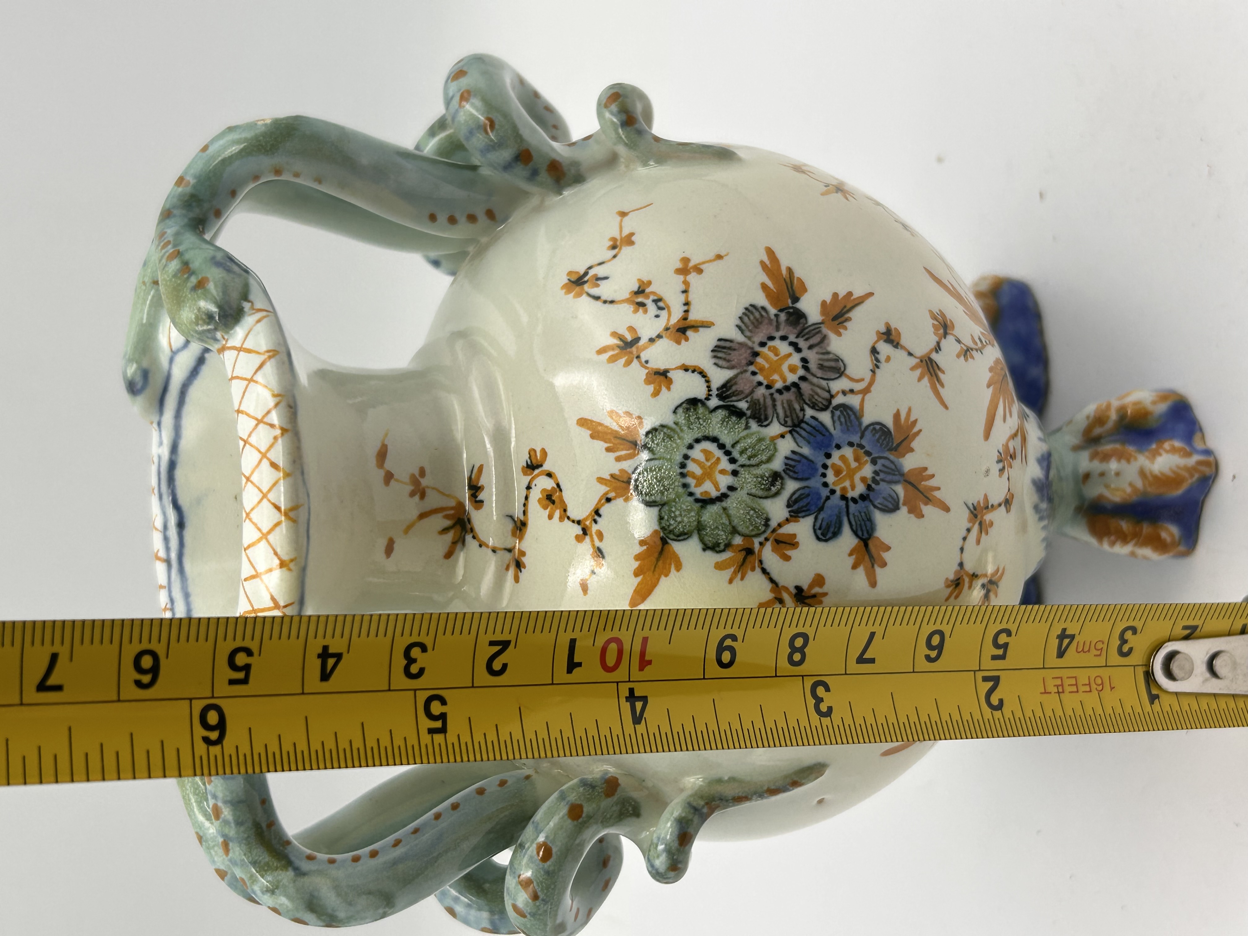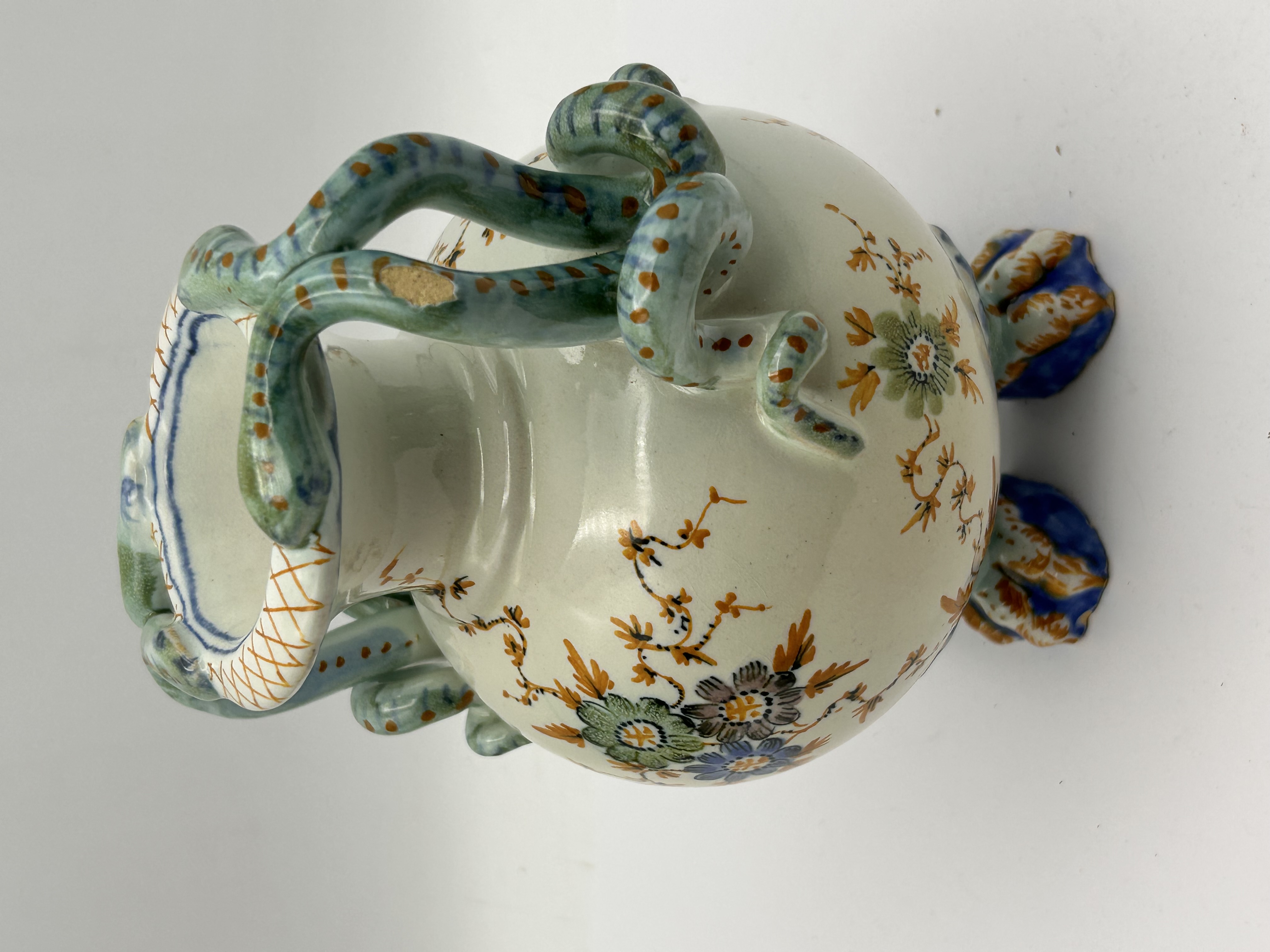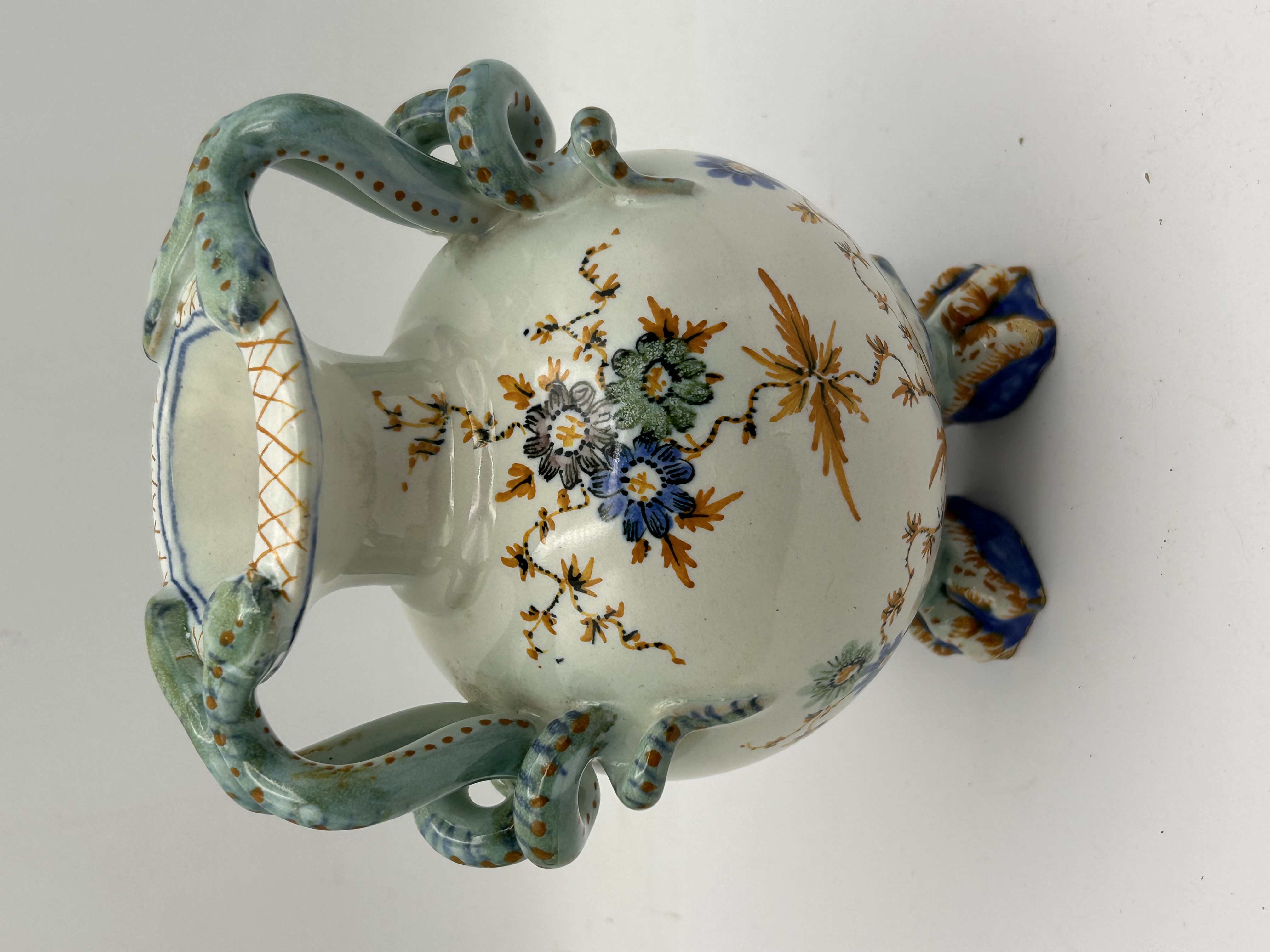 A single polychrome glazed earthenware vase featuring a globular body and a narrow neck. The vessel stands on three molded zoomorphic claw feet decorated in blue and orange glazes. The vase is characterized by twin molded handles shaped as scaled serpents or lizards, rendered primarily in turquoise-green with orange spotting, which wrap around the shoulders and terminate by biting the rim. The main body is decorated with hand-painted floral sprays and trailing vines utilizing blue, orange, green, and purple enamel colors set against a white ground. The underside of the vessel bears a small, indistinct hand-painted black mark located near one of the feet.