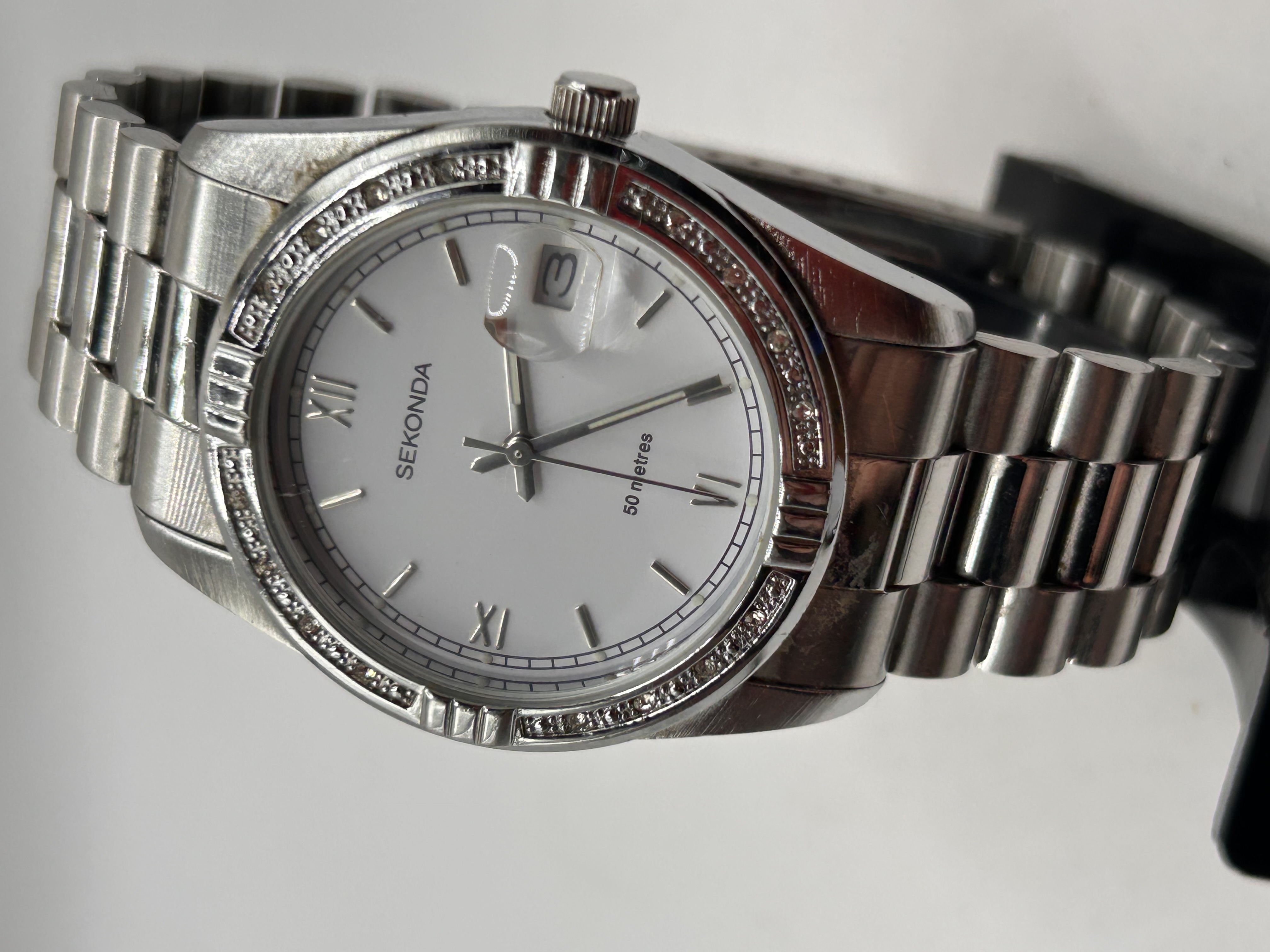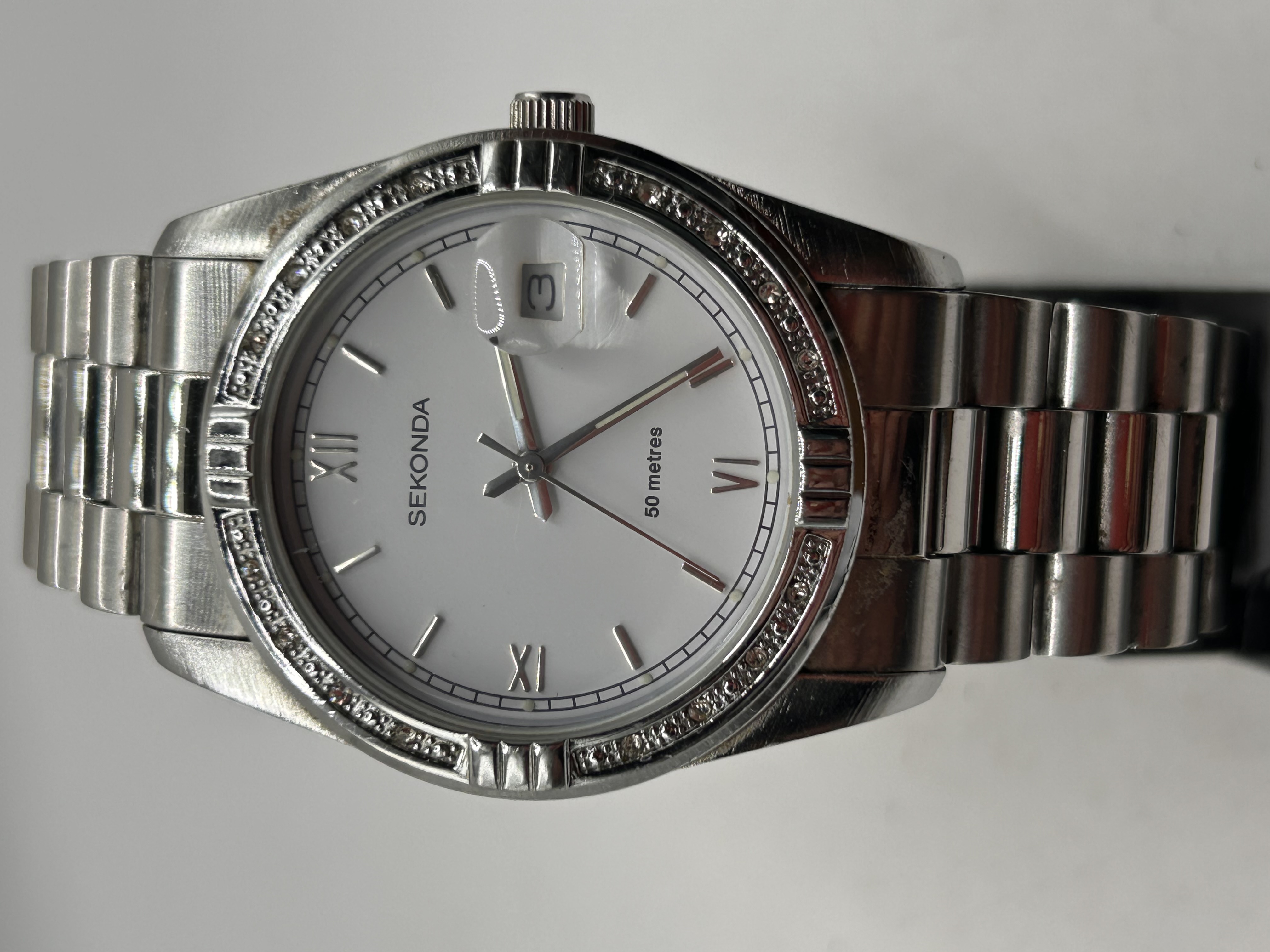 A Sekonda quartz analogue wristwatch featuring a silver-tone case and an integrated metal bracelet styled in the Jubilee pattern, consistent with stainless steel or plated base metal construction. The watch features a white/silver dial with applied stick indices and Roman numerals marking the XII, IX, and VI positions. The movement utilizes a three-hand display and includes a date aperture at the 3 o’clock position, magnified by a cyclops lens. The fixed bezel is decorated with a double row of small, clear stones, likely crystals or simulants. The dial is marked SEKONDA below the 12 o’clock position and includes the water resistance rating 50 metres above the 6 o’clock position.