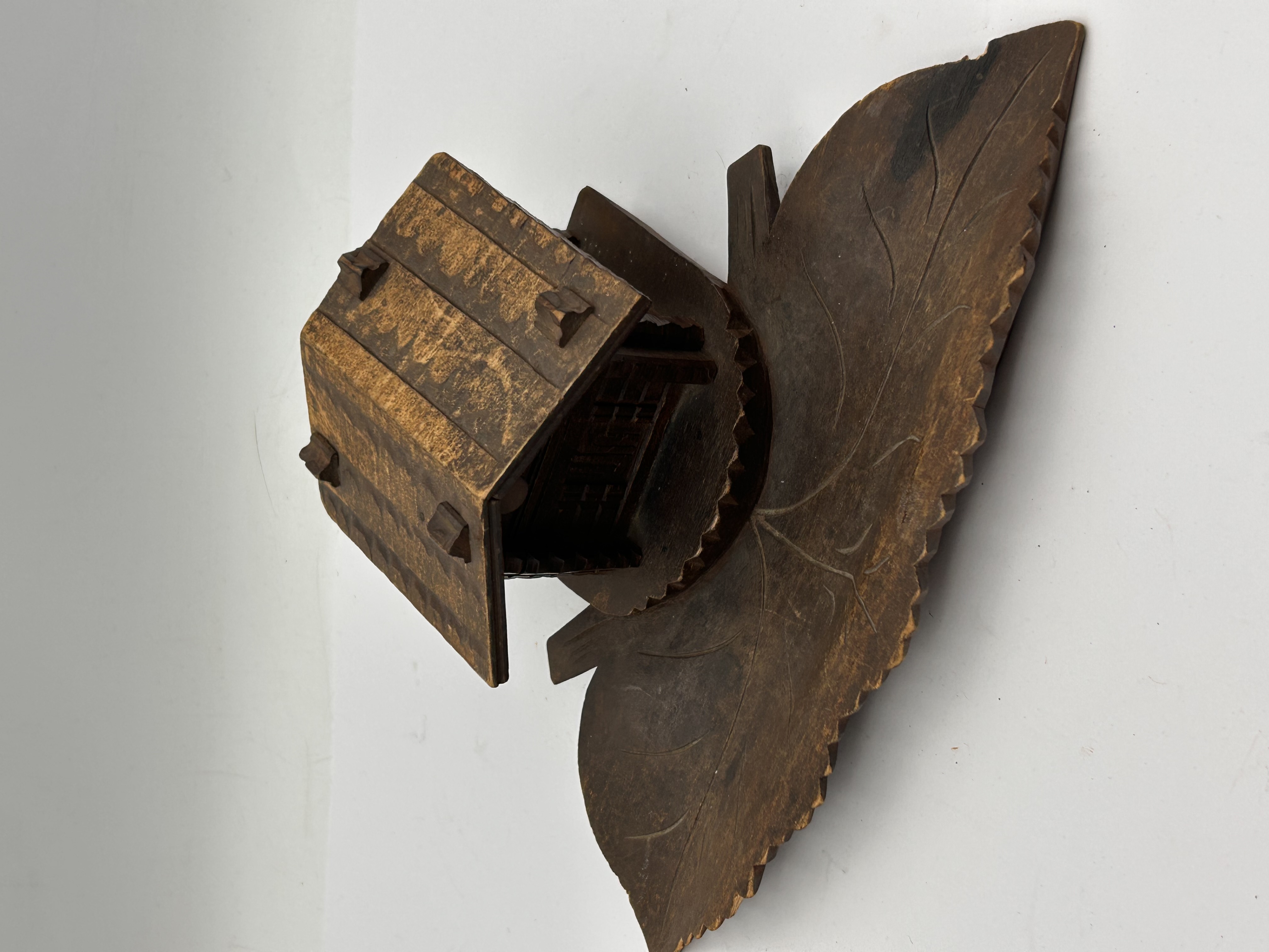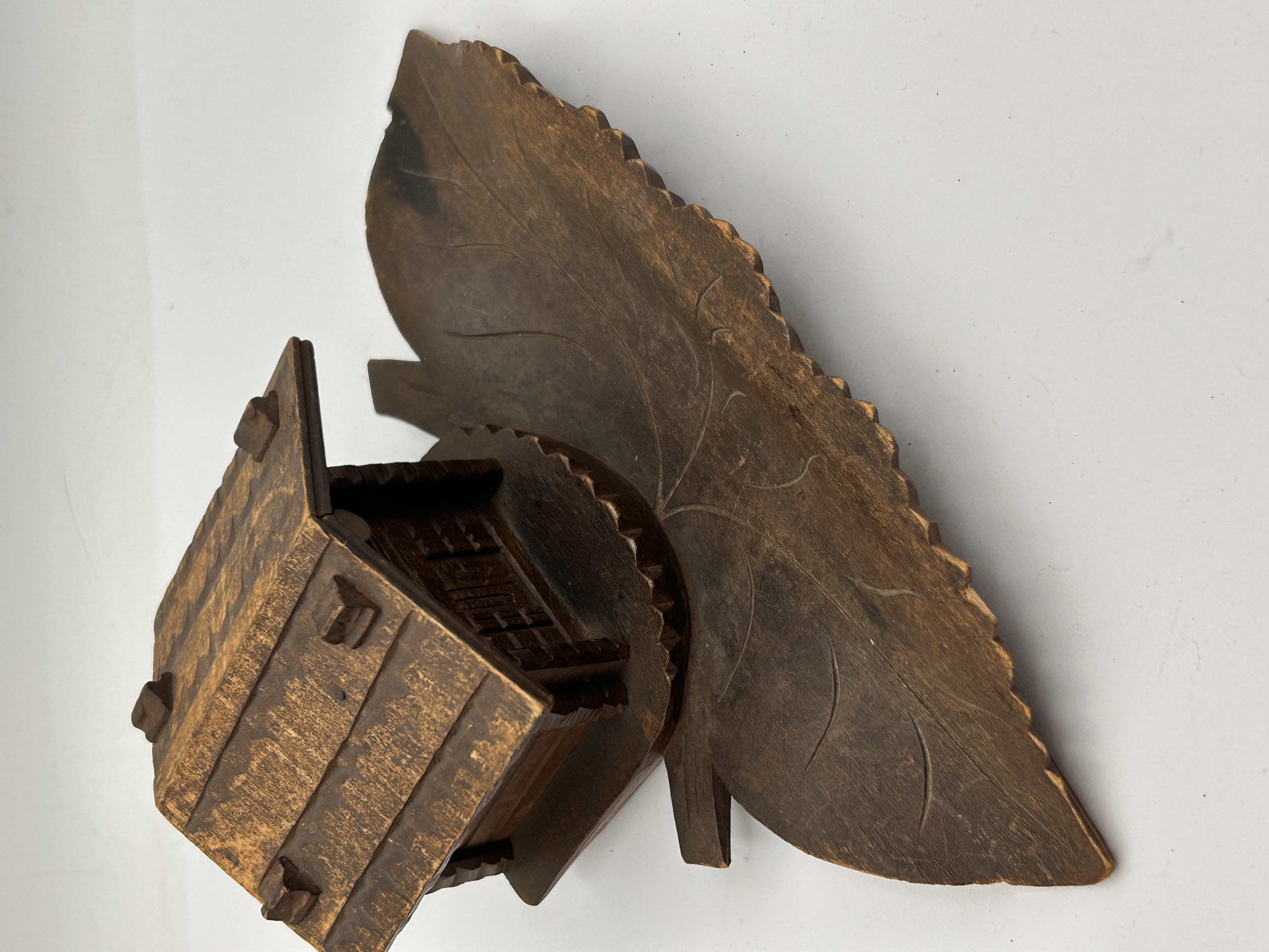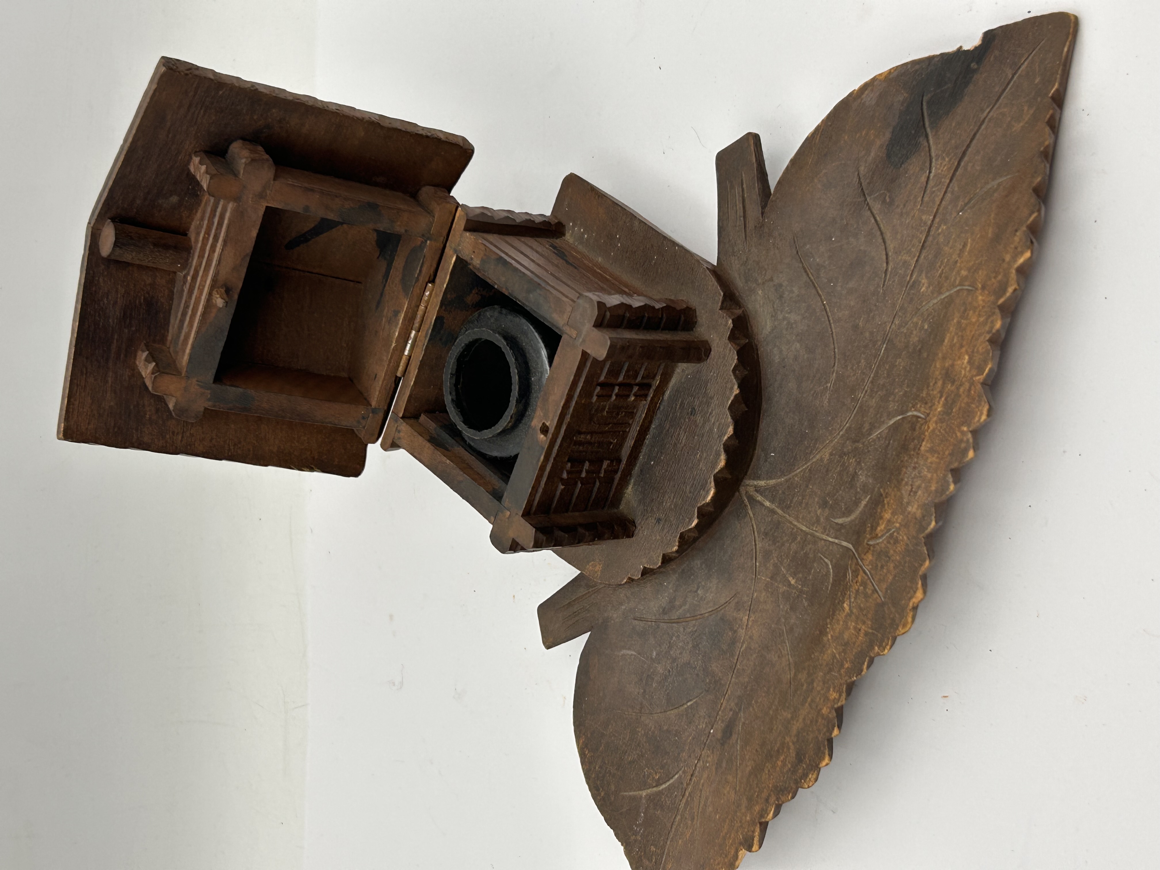 A carved wood novelty desk accessory, identified in the market as being in the Black Forest style and functioning as an inkwell and pen rest. The piece is carved entirely from dark brown wood, featuring a large, naturalistic leaf-shaped tray base with carved vein details and serrated edges, which serves as the pen rest. Mounted centrally on the base is a miniature rustic cabin or house, constructed with plank-style walls and a hinged plank roof. The hinged roof opens to reveal a single, removable black ceramic or glass insert designed to hold ink. The overall aesthetic is consistent with naturalistic folk art carvings. No visible manufacturer markings or inscriptions are present.