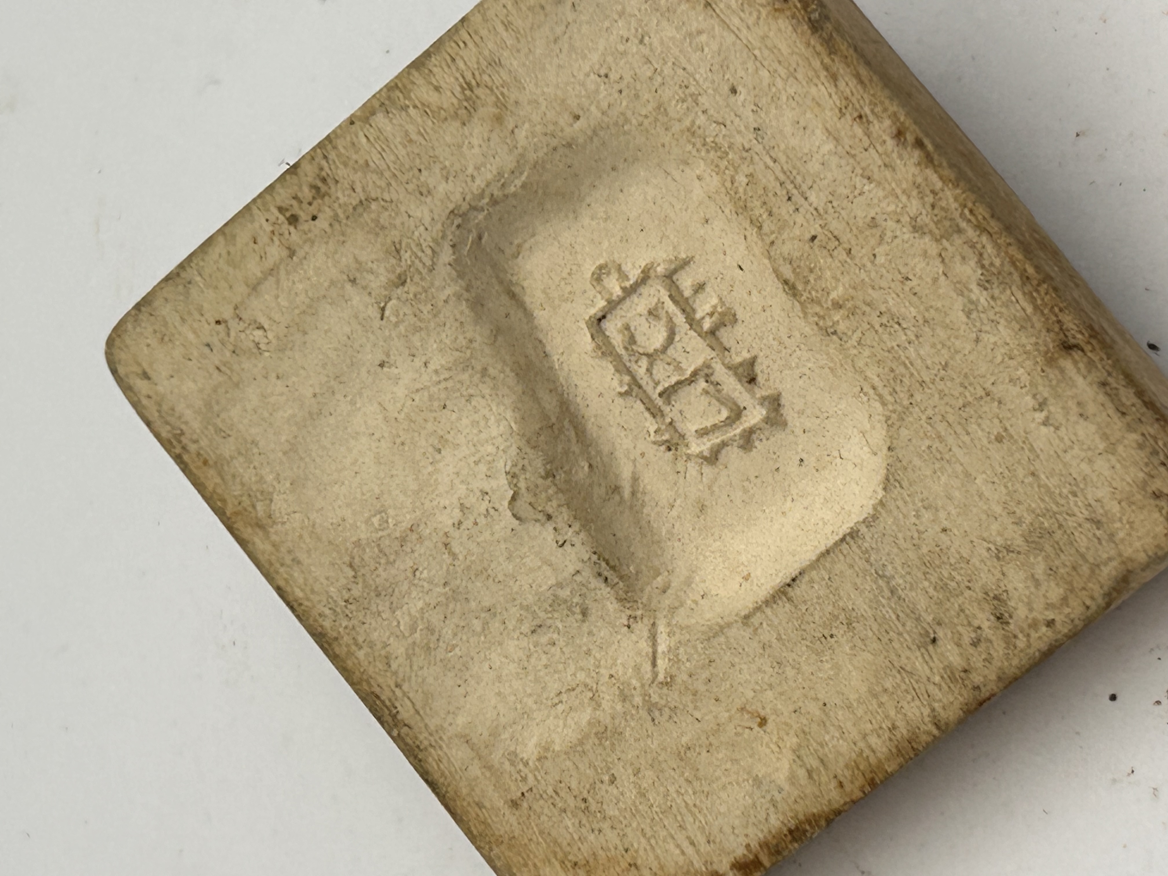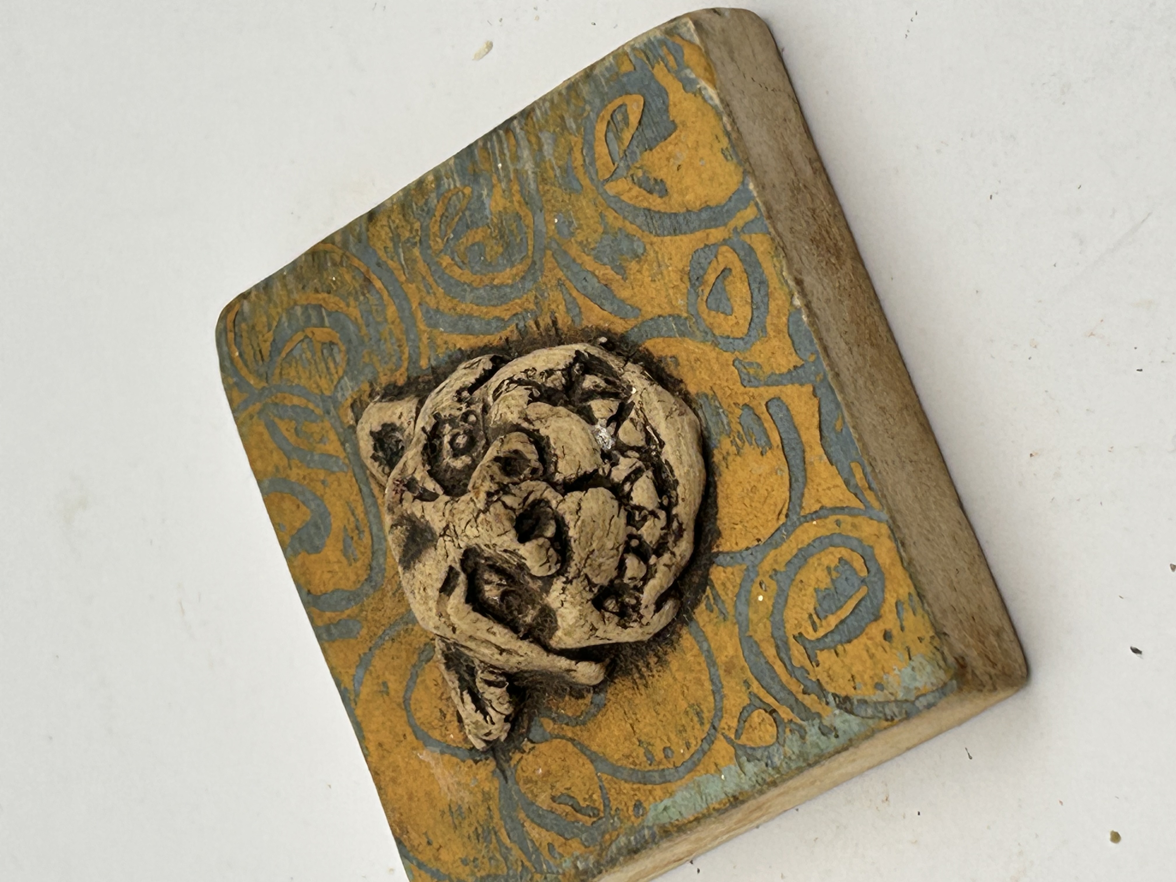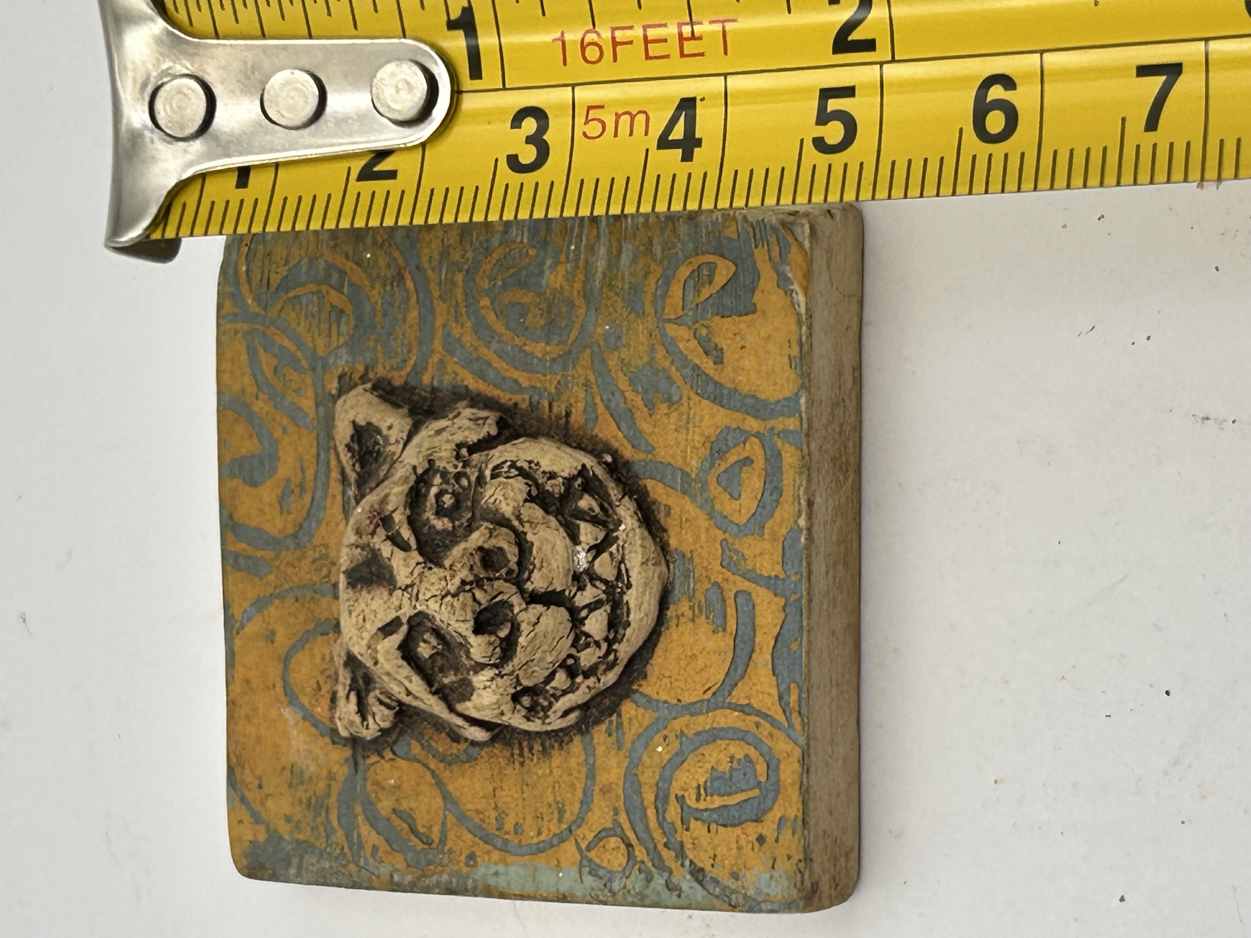 A single contemporary artisan ceramic plaque or tile, approximately square in form. The surface decoration features a high-relief sculpted central face of a grotesque or stylized animal figure, executed in unglazed natural clay, characterized by a wide, toothy grin. The surrounding field is decorated with a distressed, painted finish utilizing a mustard yellow base overlaid with swirling, abstract patterns in blue-gray. The reverse side is unglazed bisque ceramic and contains a recessed indentation bearing an impressed rectangular maker’s mark composed of the stylized, interconnected letters LJC. The subject matter of the grotesque face is stylistically reminiscent of the Pra Rahu deity associated with Thai amulets, such as those connected to Luang Pu Rod.