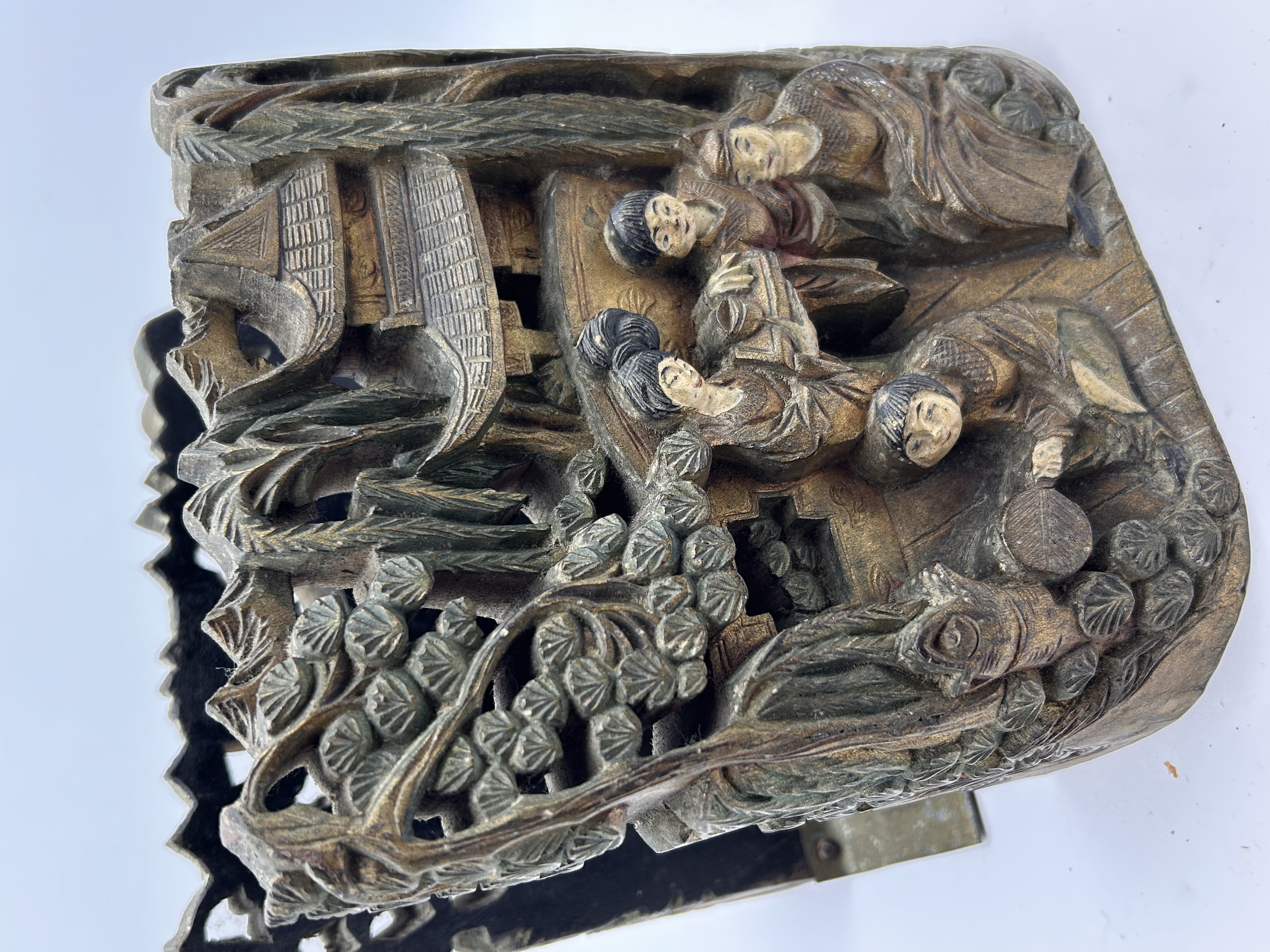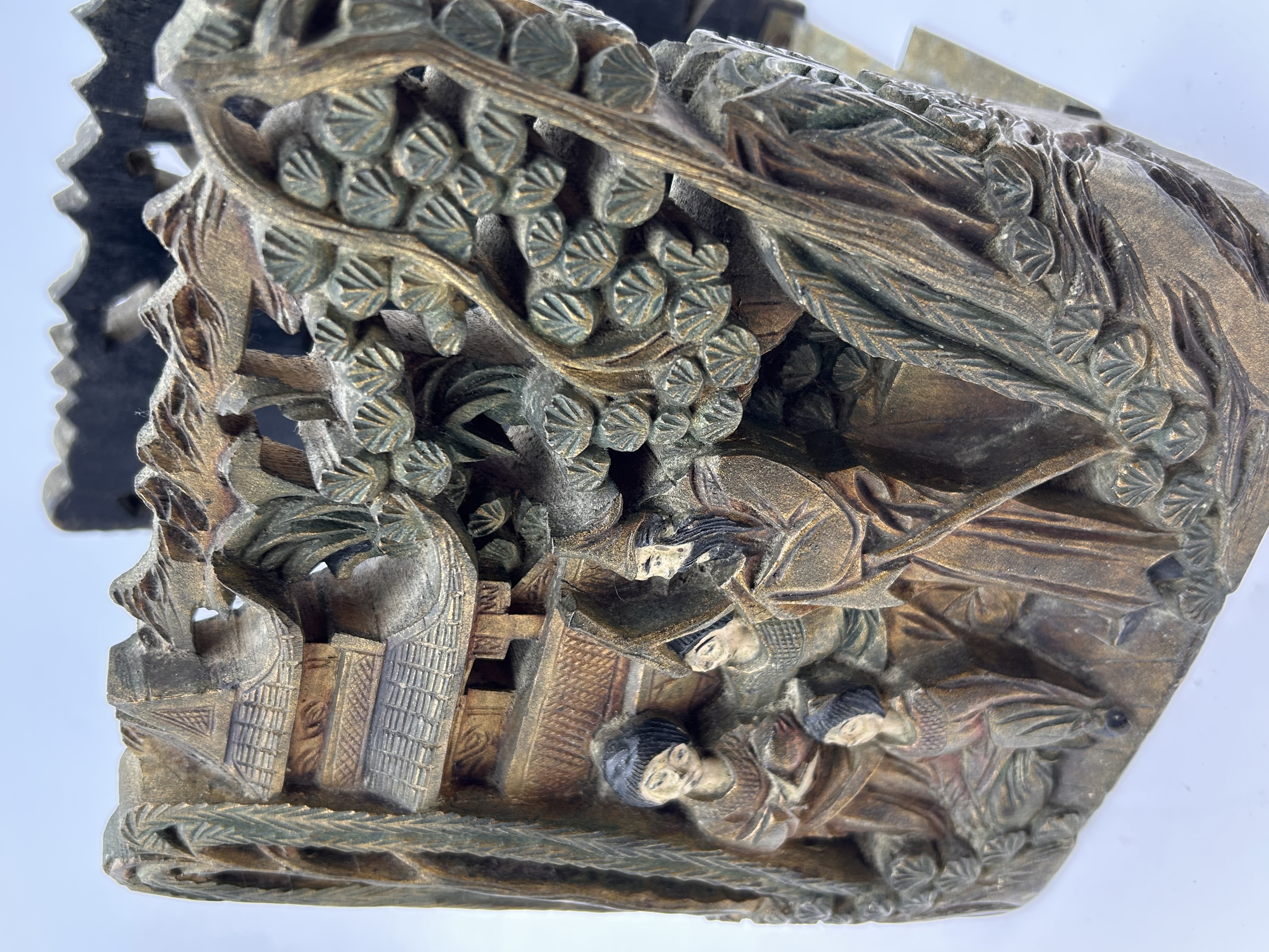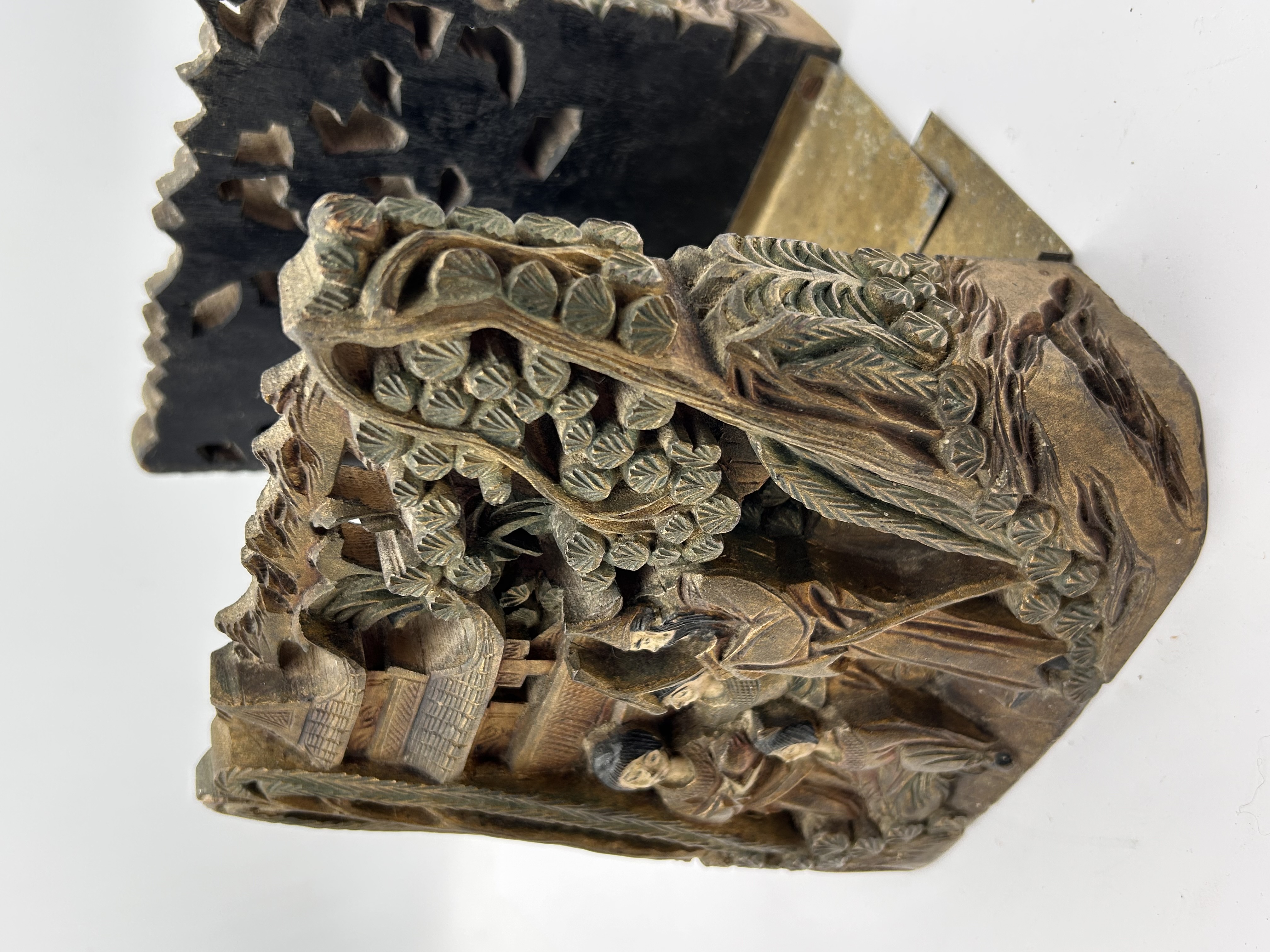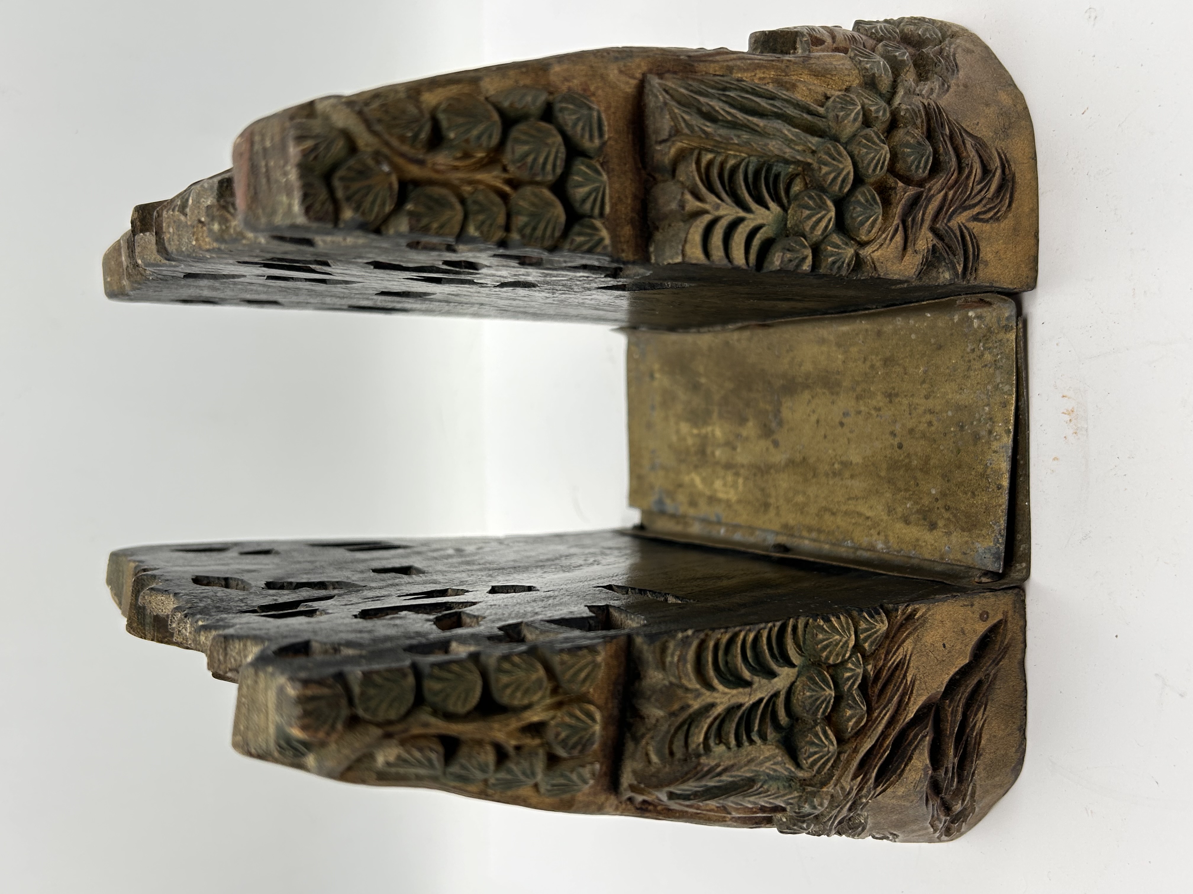 A pair of decorative bookends in the East Asian/Chinese folk art style. Each bookend consists of a deeply carved upright support, likely constructed from wood or a resin composite imitating wood, affixed to a U-shaped pivoting metal base plate, likely brass or bronze. The upright supports are executed in high relief, depicting elaborate landscape scenes. These scenes include tiered pagodas, stylized trees and foliage, and groups of robed figures (four figures visible on the face of each support). The carvings feature a pronounced faux patina utilizing dark brown and oxidized green-bronze tones to enhance the relief. The inner faces of the uprights incorporate perforated openwork designs. The web intelligence confirms these items are consistent with antique Chinese hand-carved folk art bookends.