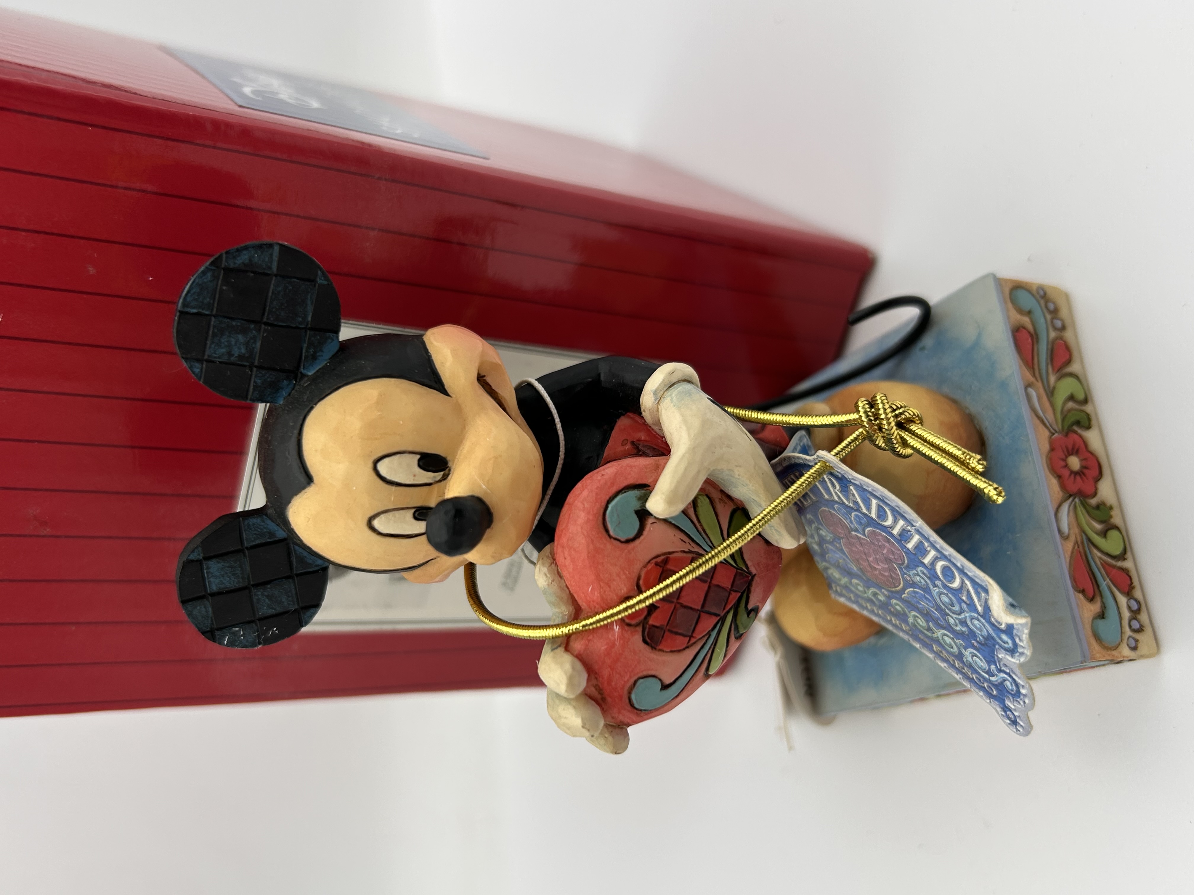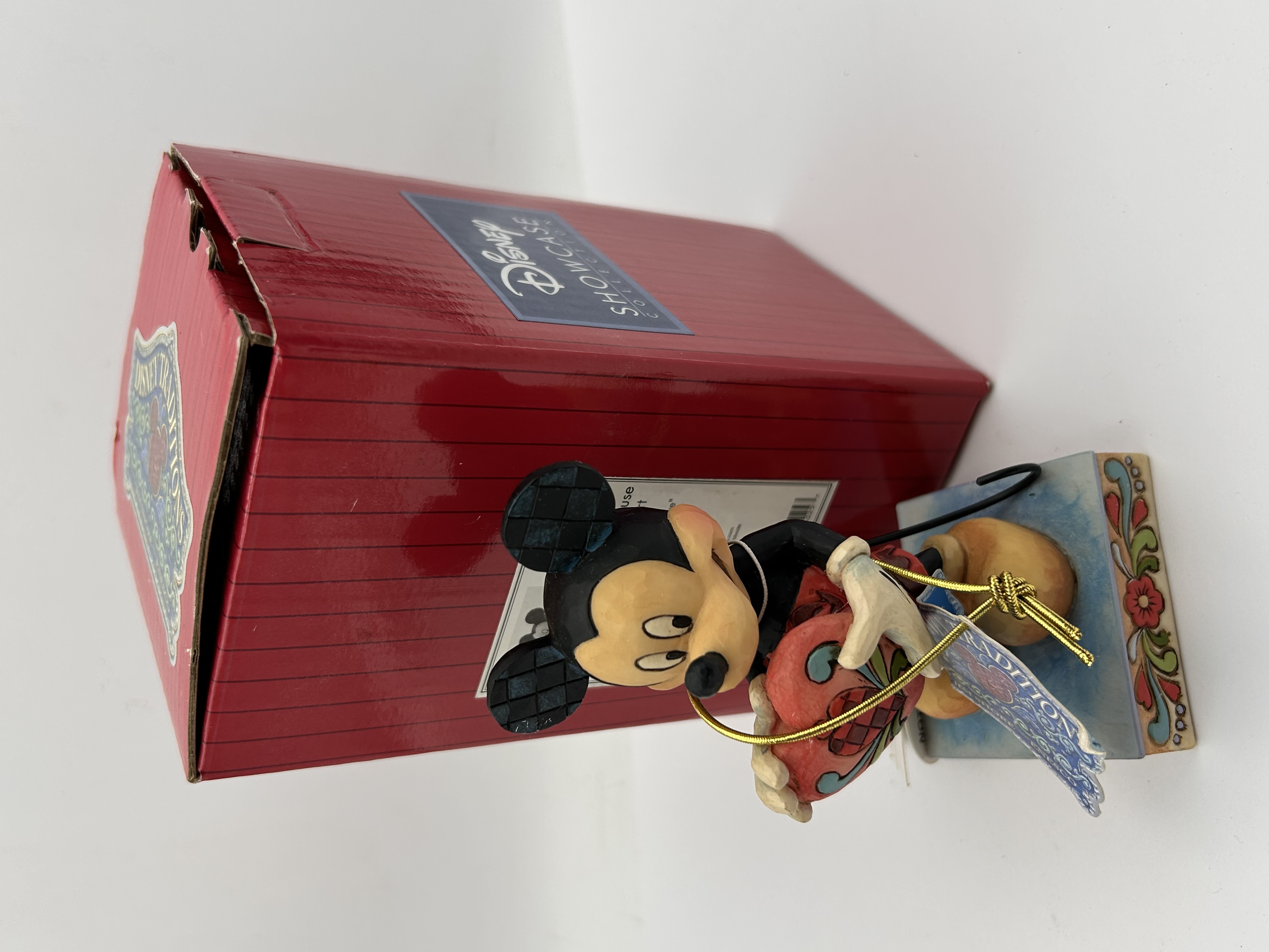 A single collectible figurine attributed to the Jim Shore Disney Traditions line. The figure depicts Mickey Mouse holding a patterned red heart, executed in a folk-art style characterized by etched patterns on the character’s ears and painted floral motifs on the base. The material is likely painted resin. The item is accompanied by its original red striped cardboard box and an attached tag confirming the “TRADITIONS” and “DISNEY SHOWCASE COLLECTION” branding.