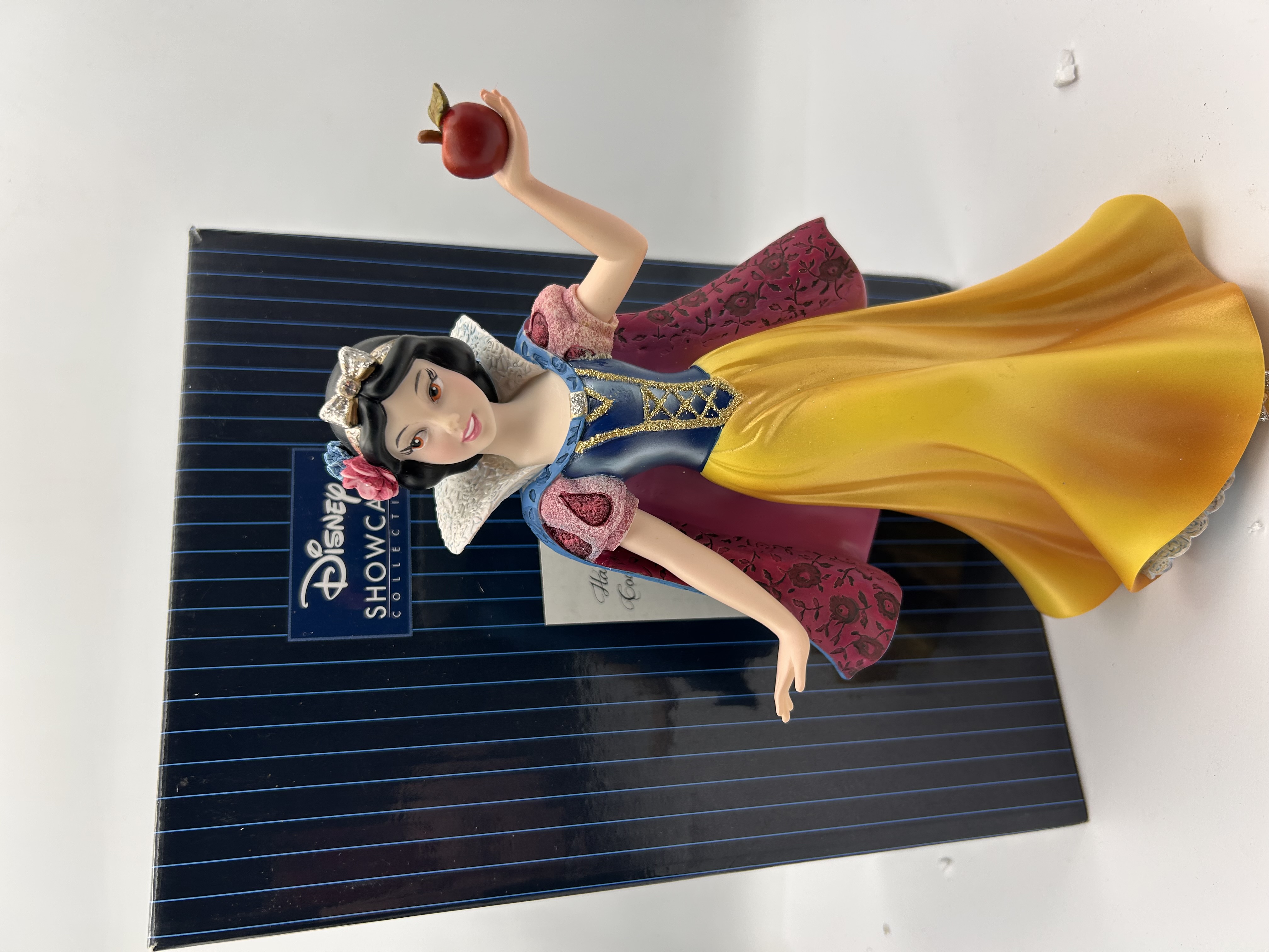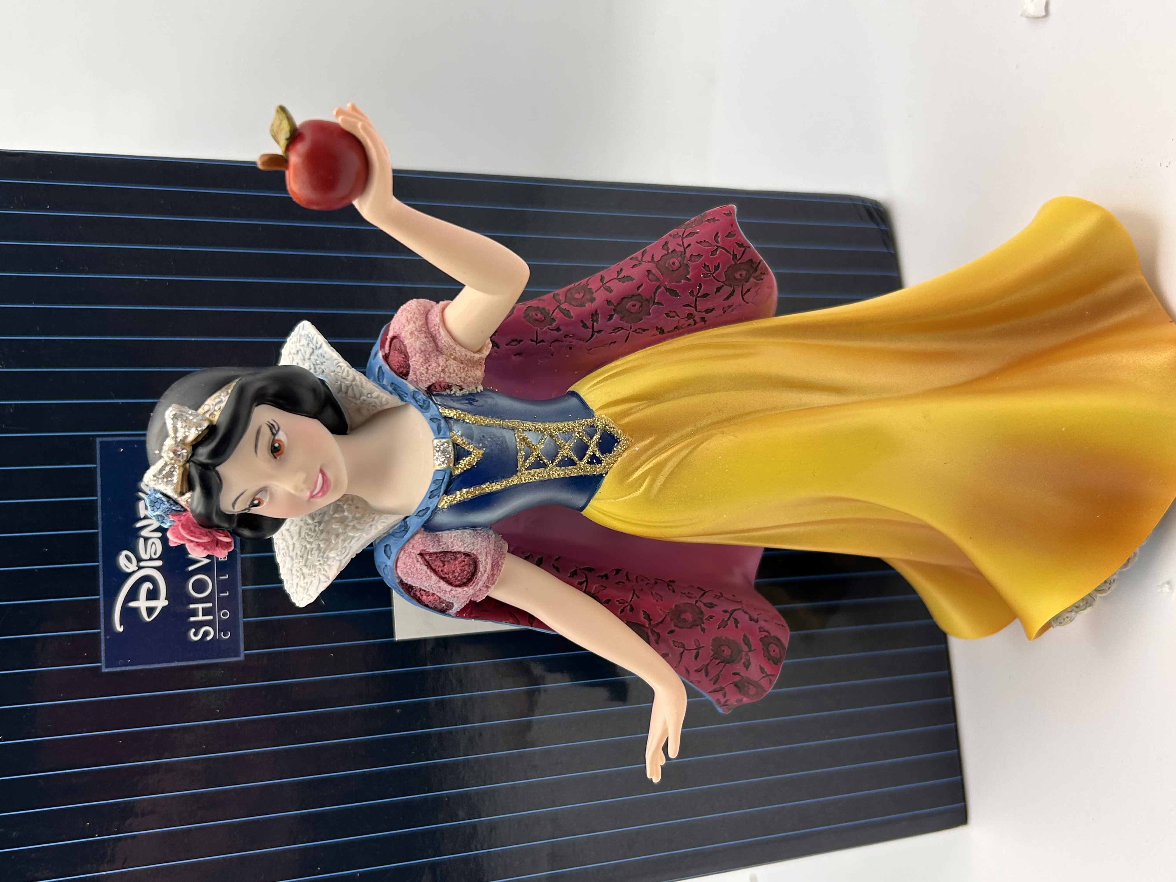 A modern collectible figurine from the Enesco Disney Showcase Couture de Force line, depicting the character Snow White. The figurine is crafted from painted material, likely resin or ceramic, featuring a high-gloss finish with subtle glitter detailing on the iconic blue, yellow, and red costume. Snow White is posed standing with her left arm raised, holding a bright red apple accented with gold leaf detail. She wears a jeweled bow and flower hair accessory. The figurine is accompanied by its original dark blue presentation box, marked “Disney SHOWCASE COLLECTION.” The collection consists of two items: the figurine and the box.