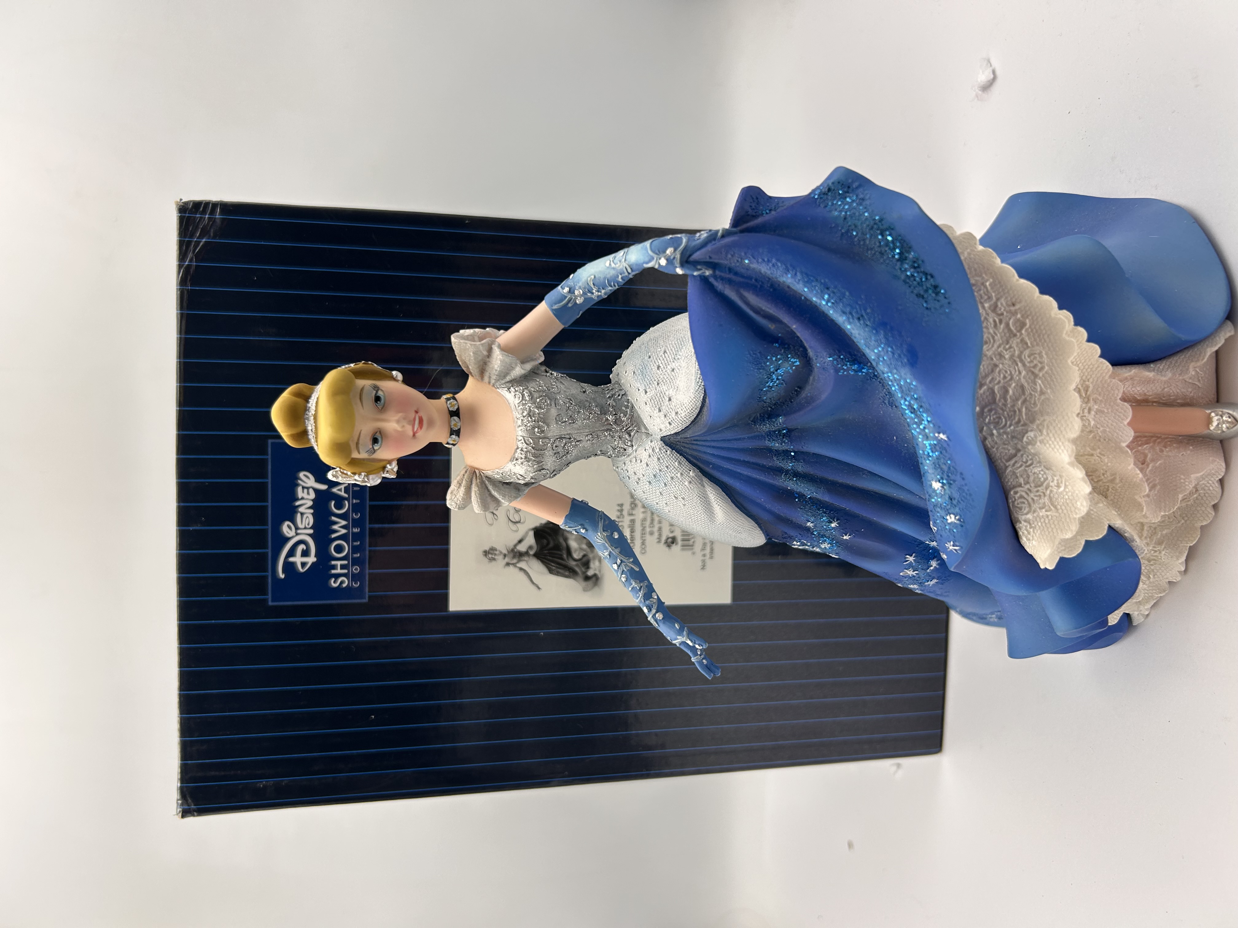 A single Enesco Disney Showcase Couture de Force figurine depicting the animated character Cinderella. The piece is constructed of painted resin or similar molded material. Cinderella is shown in her iconic ballgown, posed lifting the skirt of her dress. The gown features a silver bodice and a voluminous blue skirt, heavily detailed with applied blue and silver glitter accents. She wears long blue gloves, a blonde updo, and a simple black choker. The figurine is accompanied by its original dark blue box, labeled Disney SHOWCASE COLLECTION with product identification number 031544.