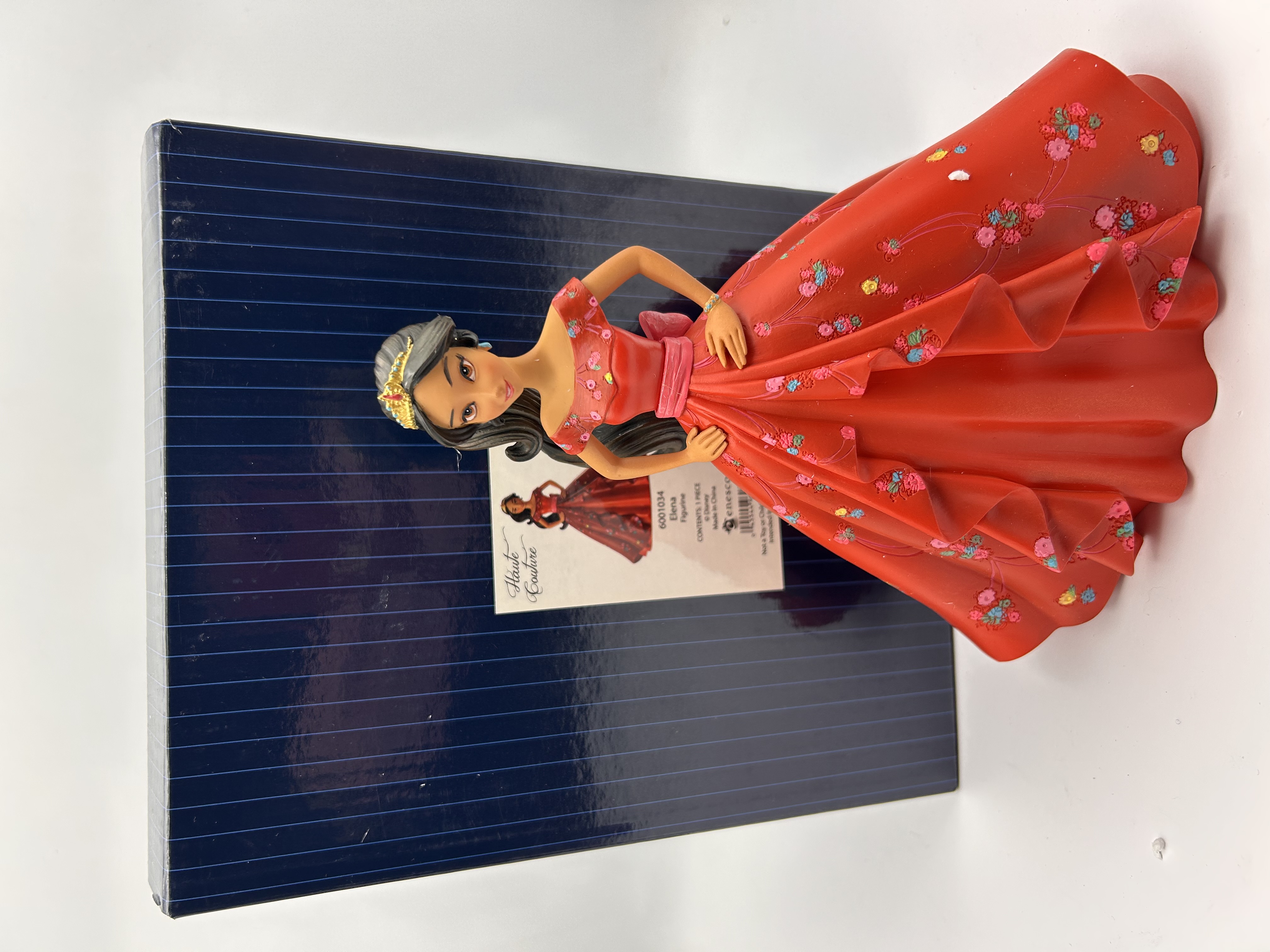 A single Enesco Disney Showcase “Haute Couture” collection figurine depicting the Disney character Elena of Avalor. Constructed from stone resin and hand-painted. The figure is modeled wearing a voluminous, off-the-shoulder red gown richly decorated with simulated floral embroidery in shades of pink, blue, and yellow. The figure is accessorized with a gold-toned tiara and bracelet. The item is presented with its original glossy, dark blue pinstriped packaging box. An affixed label on the box identifies the object as the “Elena Figurine,” stock number “6001034,” noting “CONTENTS: 1 PIECE,” “© Disney,” and “Made in China.”