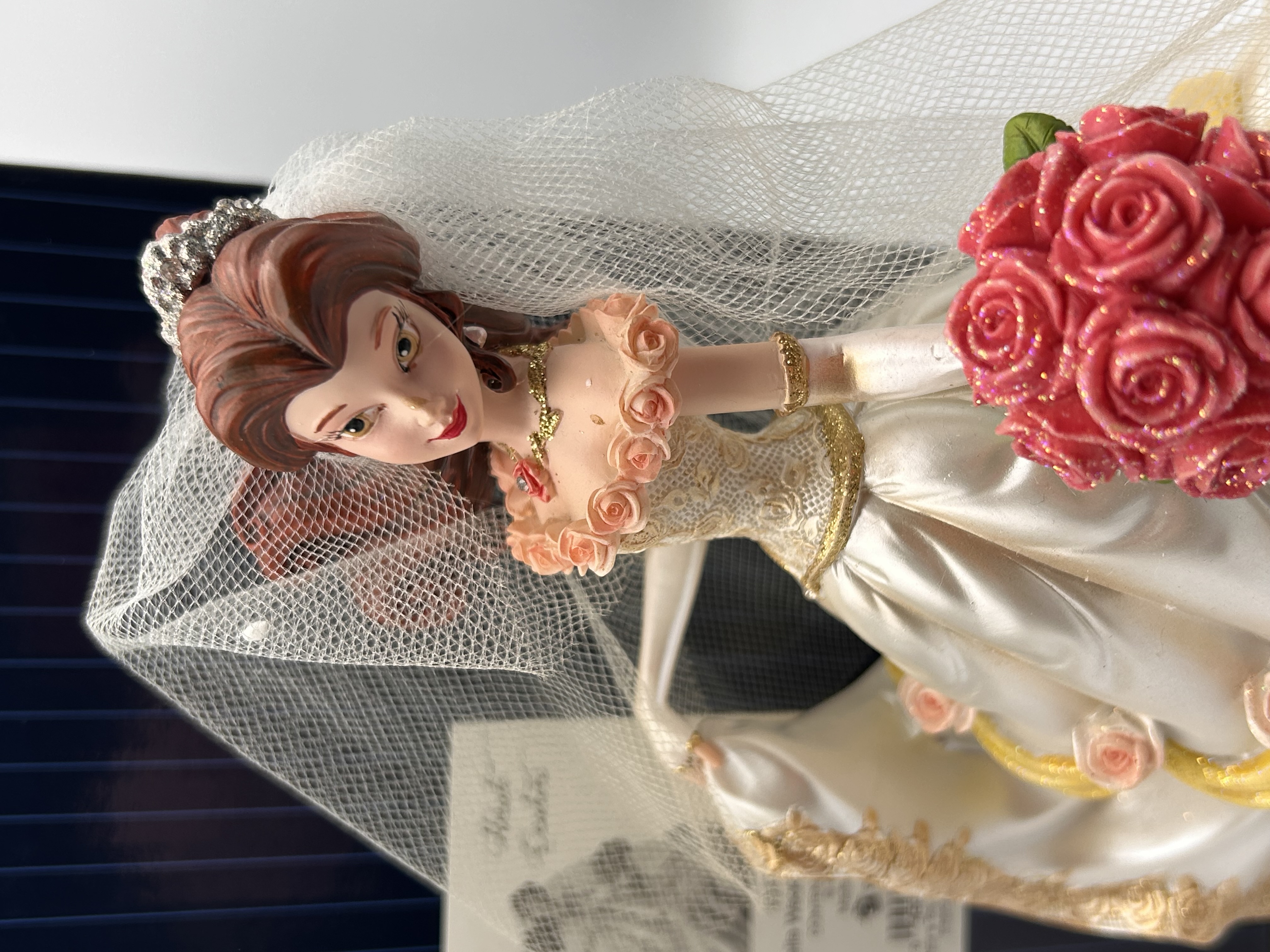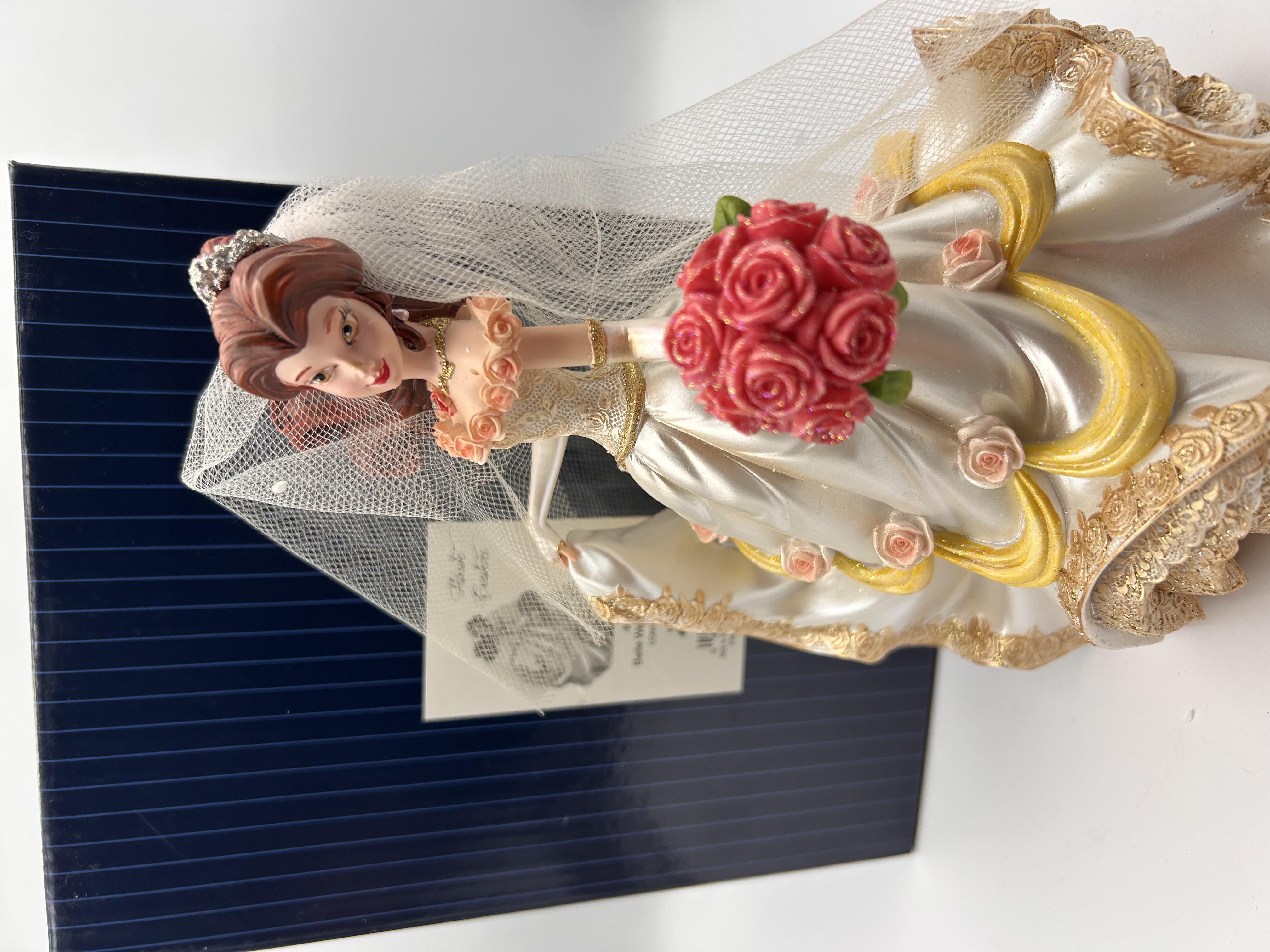 A single collectible figurine identified as the Enesco Disney Showcase Belle Wedding Collection Bride Figurine, sometimes referenced by the model number 4045444. This piece depicts the Disney character Belle from Beauty and the Beast dressed in an elaborate bridal gown. The figurine is constructed from painted stone resin or similar material. The gown is primarily white with a shimmering finish, detailed with extensive gold trim, sculpted yellow accents, and applied pink roses around the bodice and skirt. The figure holds a large bouquet of red roses accented with glitter. Belle wears a tiara and a translucent white netting veil. The figurine is accompanied by its original dark blue packaging box and a paper insert or certificate of authenticity, partially visible.