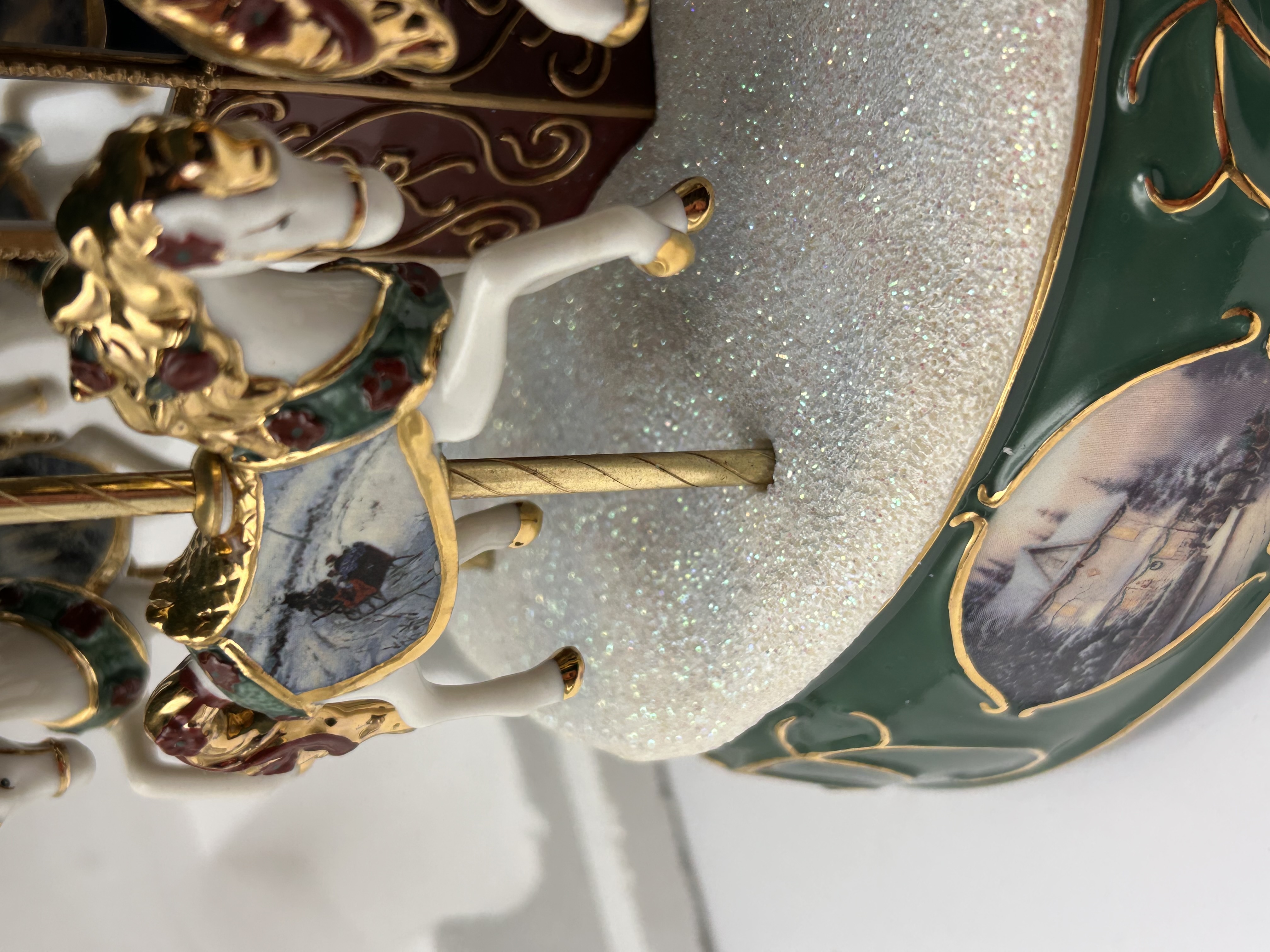 A single Thomas Kinkade musical carousel sculpture from the Heirloom Porcelain Collection, manufactured by Ardleigh Elliott. The figurine is executed in deep holiday colors of green, red, and gold, depicting a Victorian Christmas theme. The carousel structure features multiple white horses detailed with gold tack and winter scenic blankets. The horses are set upon a base covered in faux snow (glitter). The canopy and base are decorated with painted Victorian winter scenes and filigree accents. Small decorative faux jewels are integrated into the upper drum structure. The underside of the felted green base bears extensive markings identifying the piece as the Thomas Kinkade Victorian Carousel, noting it plays the melody of I’ll Be Home For Christmas. The base is further marked with Sculpture No. 46467, copyrighted ©2004 by Thomas Kinkade and manufactured by Ardleigh Elliott (Item No. 74500).