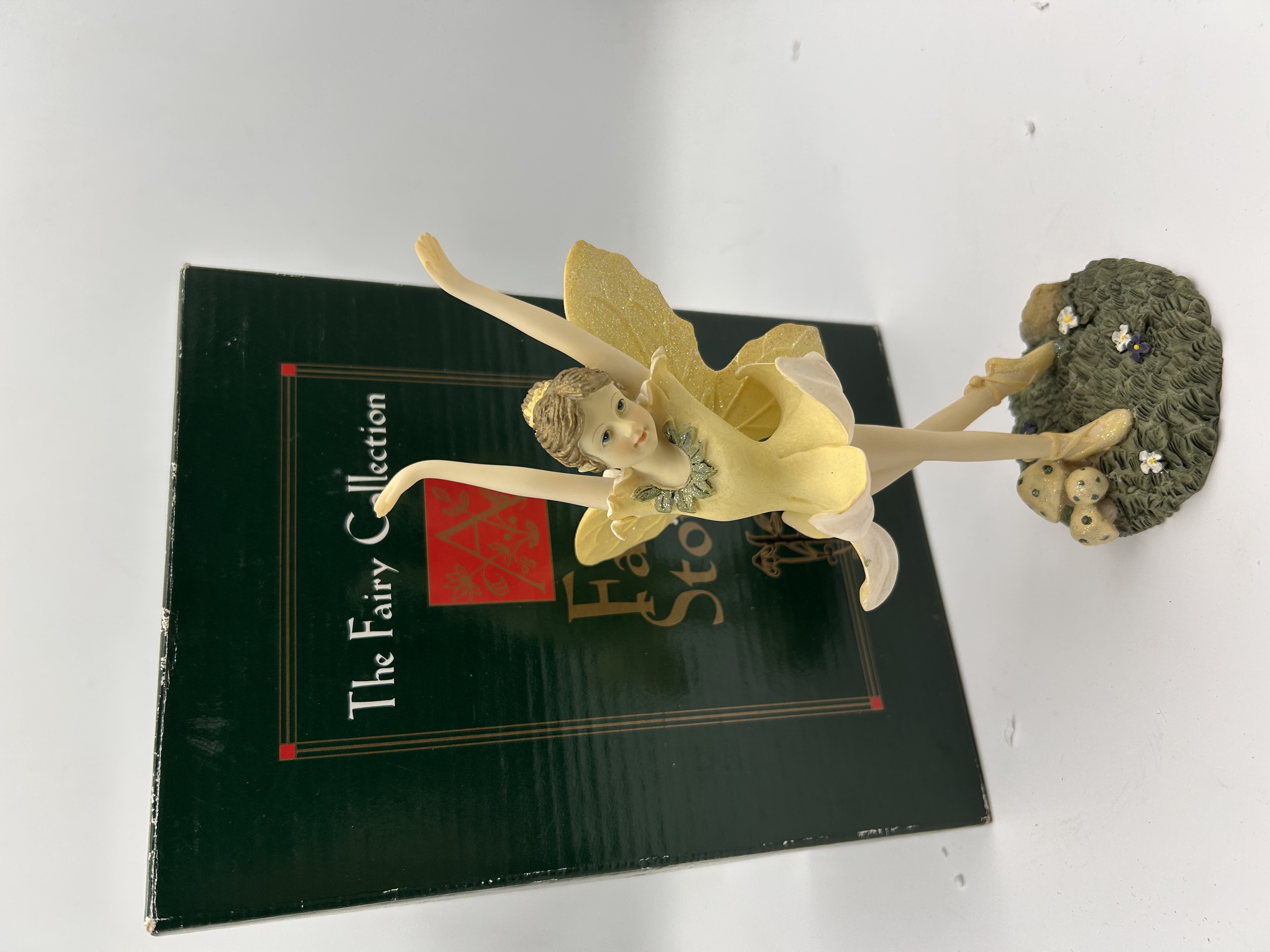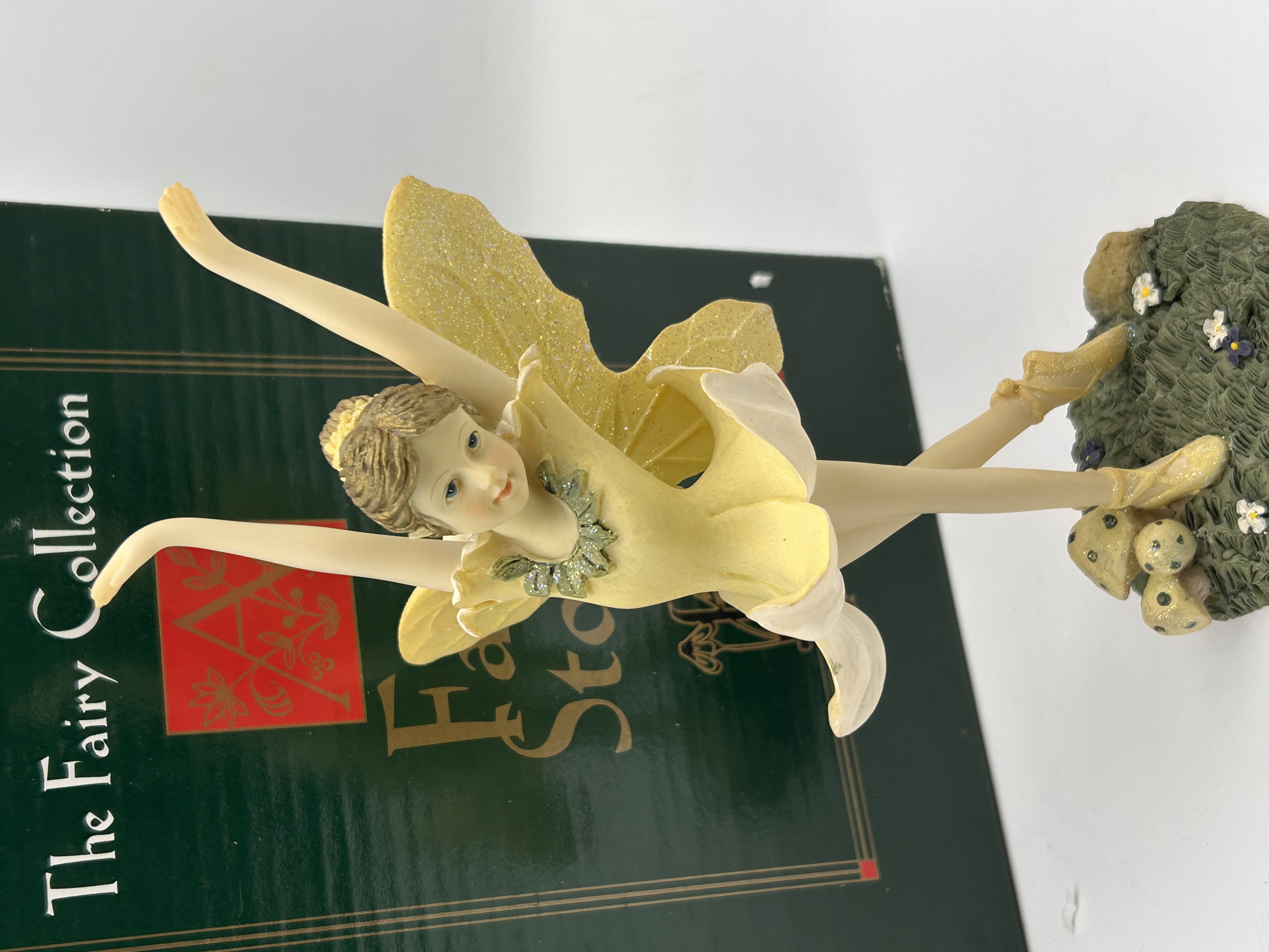 A figurine and its original packaging box from The Fairy Collection by Dezine. The figurine is crafted from hand-painted cast resin, depicting a fairy dancer in a ballet pose en pointe. The figure wears a yellow and white costume and features large, iridescent yellow wings dusted with glitter. The figure stands on a molded, naturalistic base detailed with green moss, three speckled mushrooms, and small white flowers. Research suggests this piece is part of the “Ballet Fairy” or “Honey Ballet” sub-series within the collection. The accompanying packaging is a tall, dark forest-green cardboard box bearing the text “The Fairy Collection” prominently on the front panel.