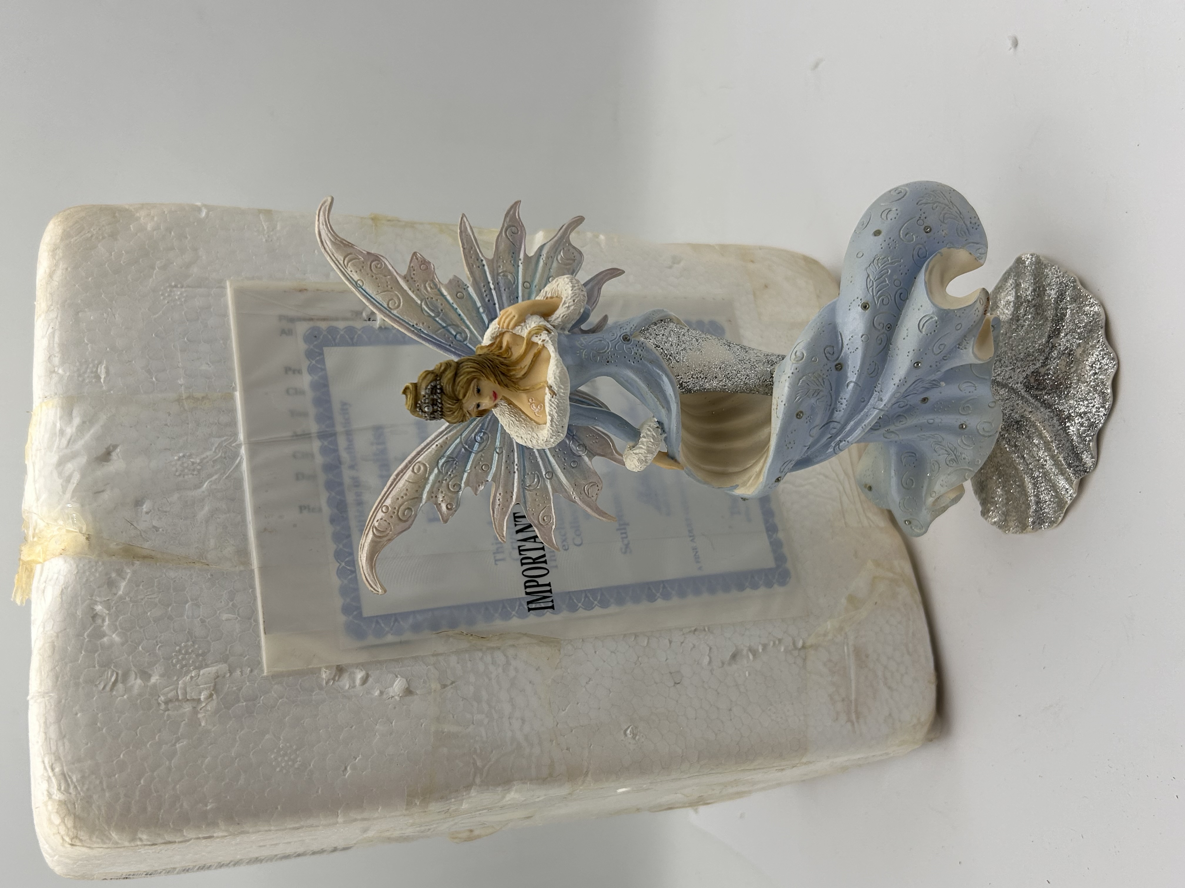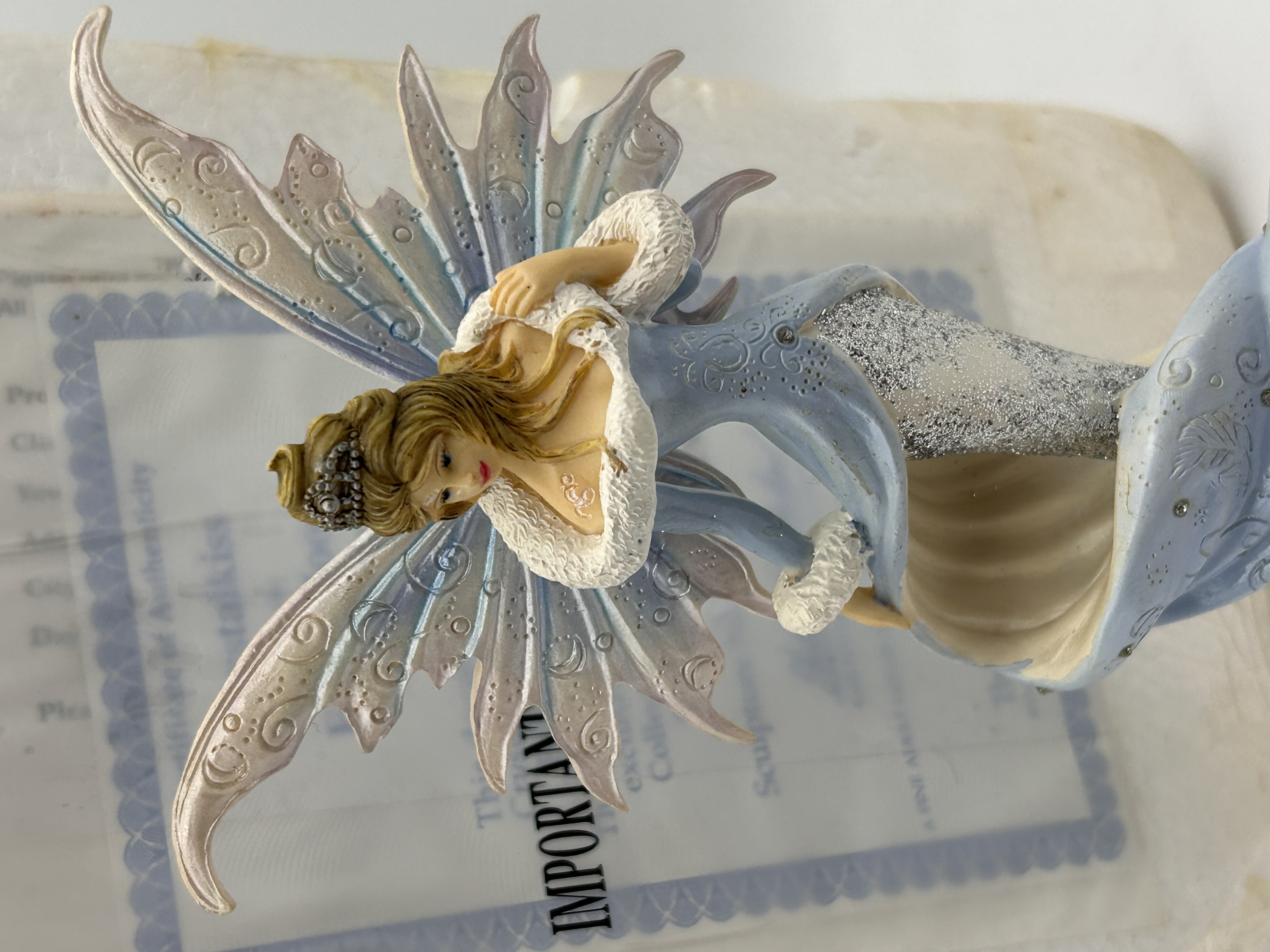 A single collectible figurine, likely composed of cold-cast resin or polystone, depicting a female fairy figure in a dramatic pose. The figure is styled with a romantic, winter theme, wearing a light blue gown trimmed with white faux fur. The bodice is detailed with silver glitter, and the skirt flows dramatically around the base. The figure wears a small crown or tiara and possesses large, iridescent wings detailed in pink and blue tones. The circular base is heavily decorated with silver glitter, suggesting a snowy landscape. The style is consistent with the Faerie Glen collection of fantasy collectibles. The item is accompanied by its original, yellowed white styrofoam packaging and a document, possibly a Certificate of Authenticity, which bears the large, capitalized text IMPORTANT and the partial word talkiss.