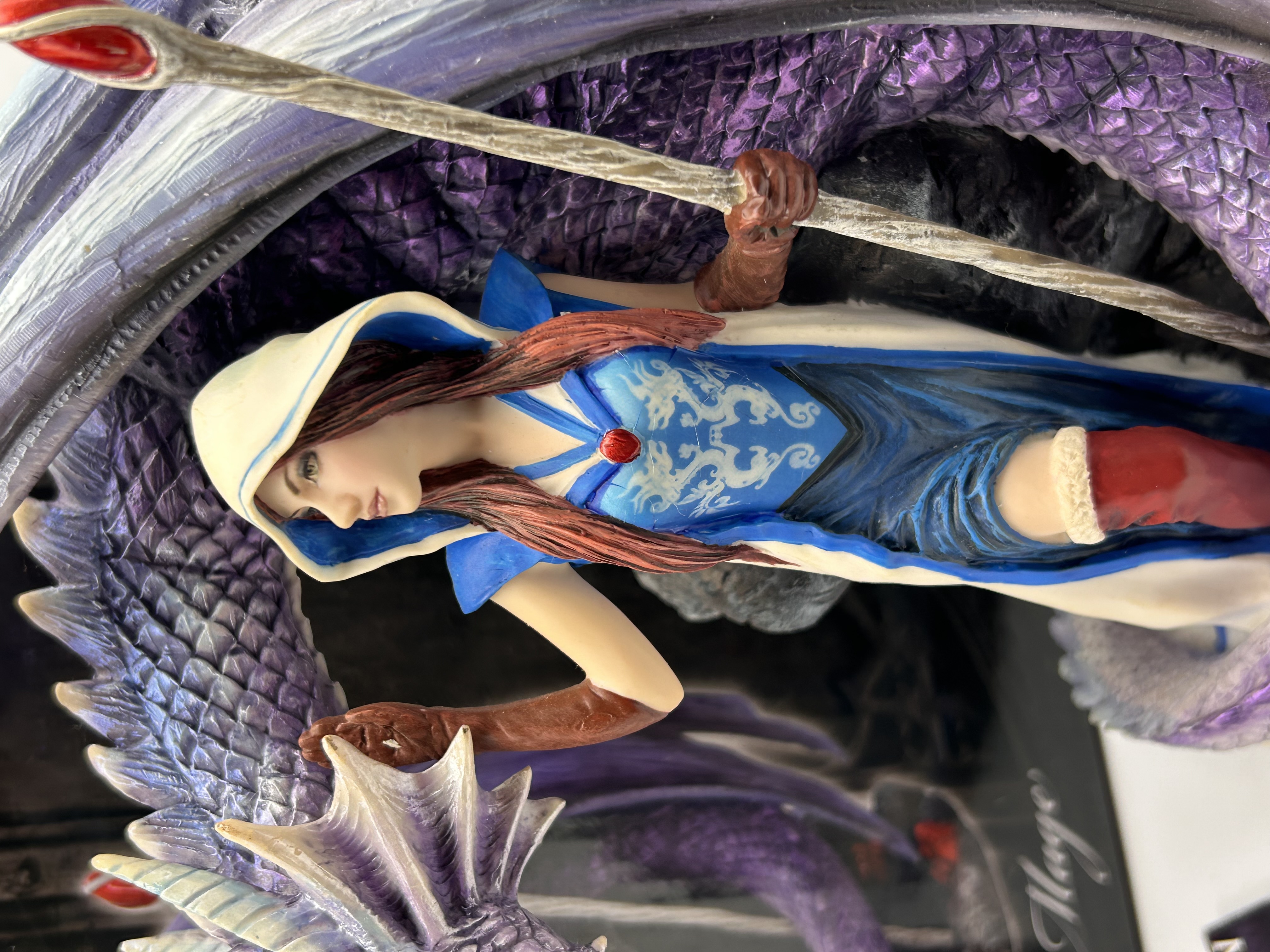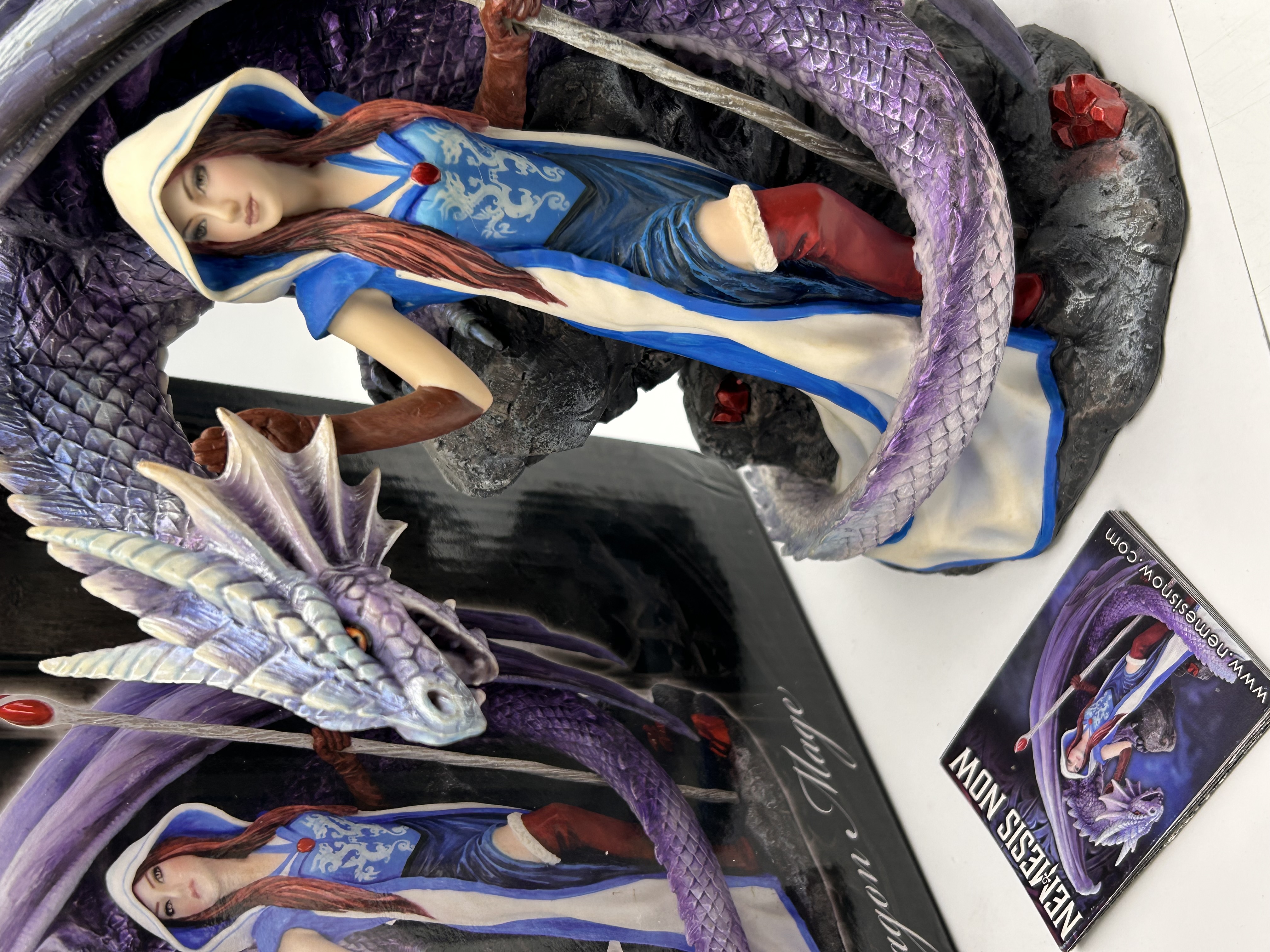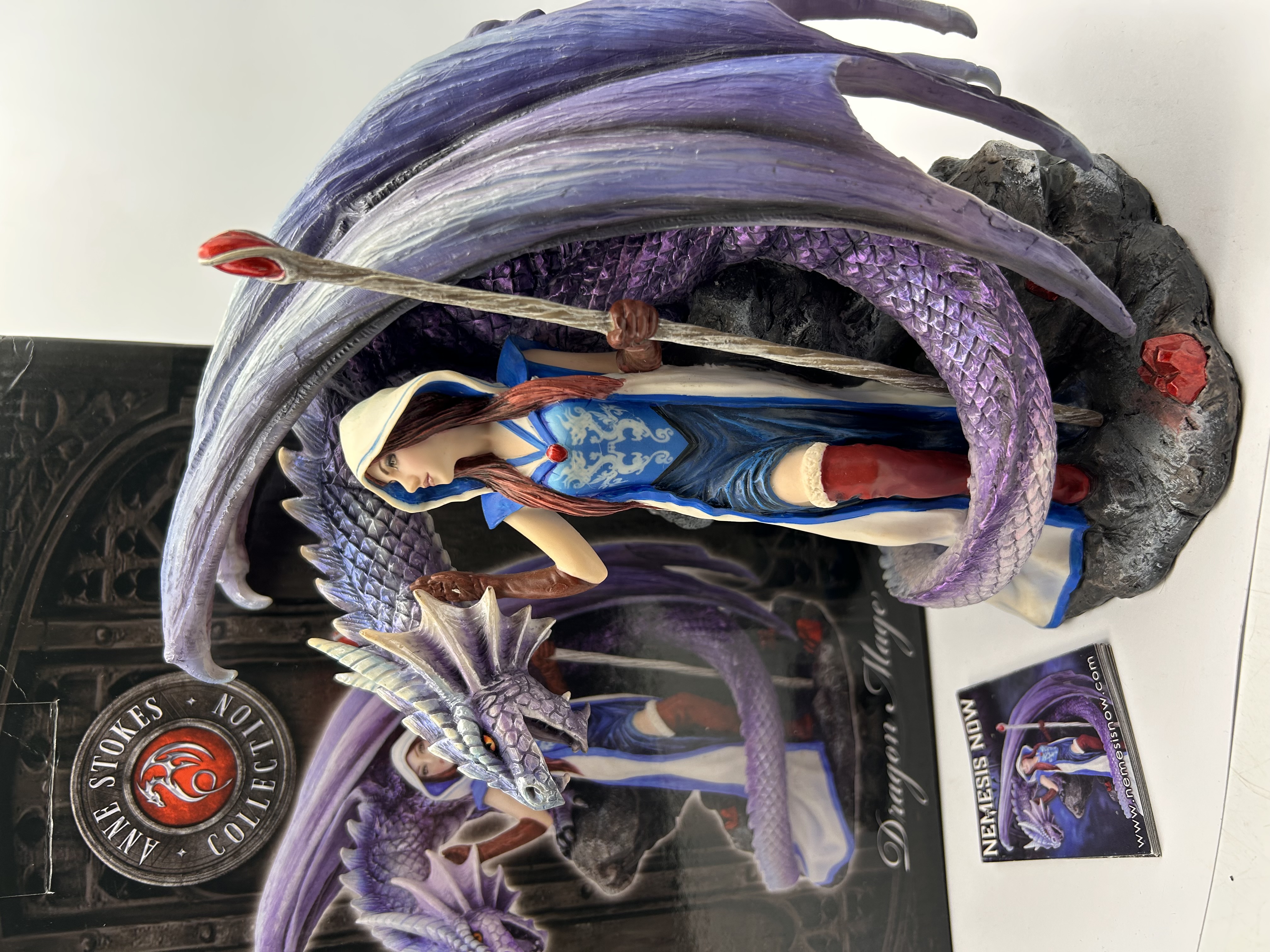 A fantasy figural sculpture titled ‘Dragon Mage,’ designed by Anne Stokes and produced by Nemesis Now. This lot consists of three items: the cold-cast resin statuette, its original packaging box, and a Nemesis Now promotional leaflet. The statuette features a detailed polychrome depiction of a woman, the Dragon Mage, wearing a blue and white hooded cloak and red boots, holding a staff topped with a red gem. She is intertwined with a large purple dragon, standing on a dark, rocky base. The statuette is constructed from cold-cast resin. The original black cardboard packaging is marked ‘ANNE STOKES COLLECTION’ and ‘Dragon Mage.’ The accompanying leaflet is marked ‘NEMESIS NOW’ and includes a website address.