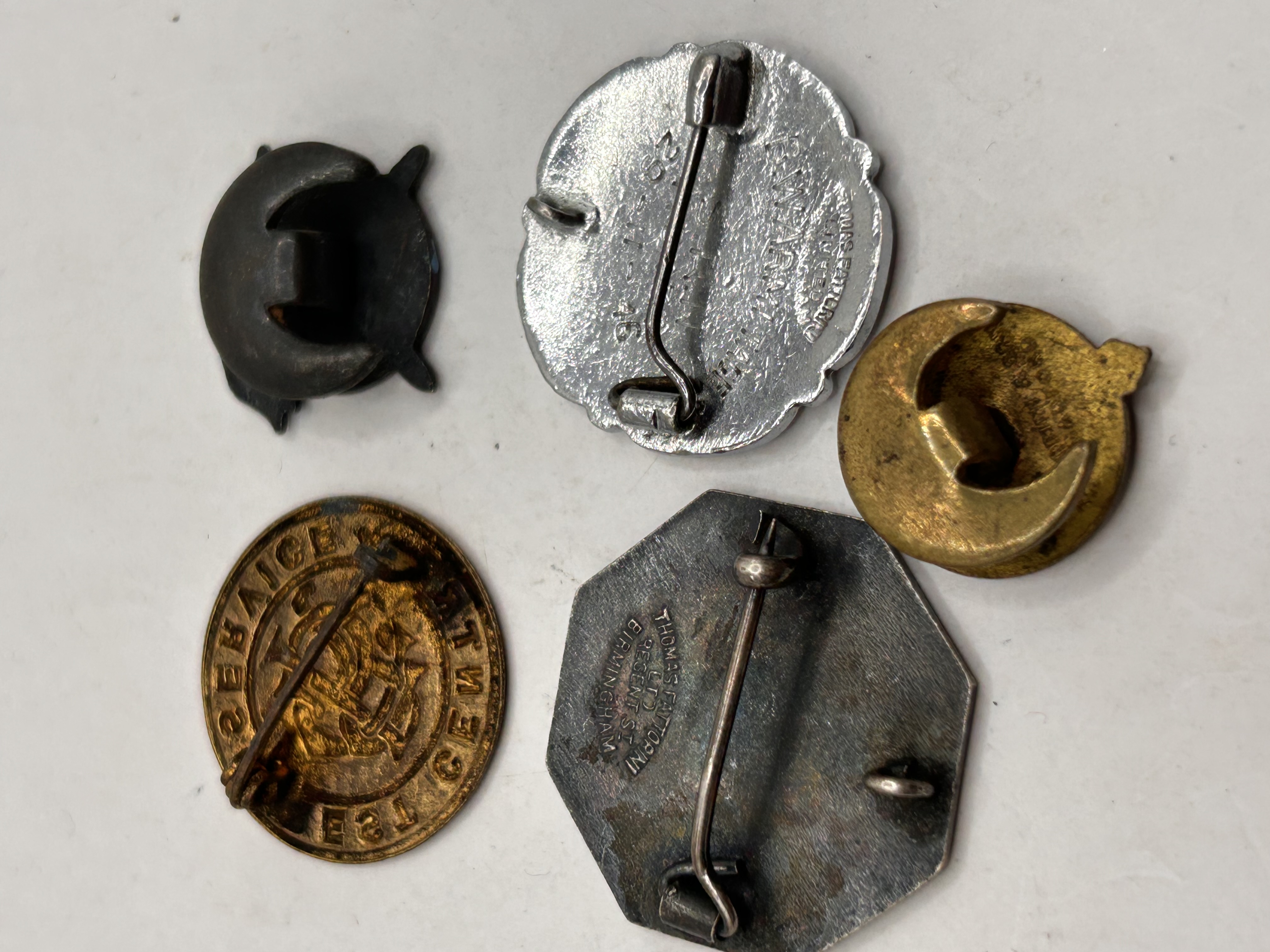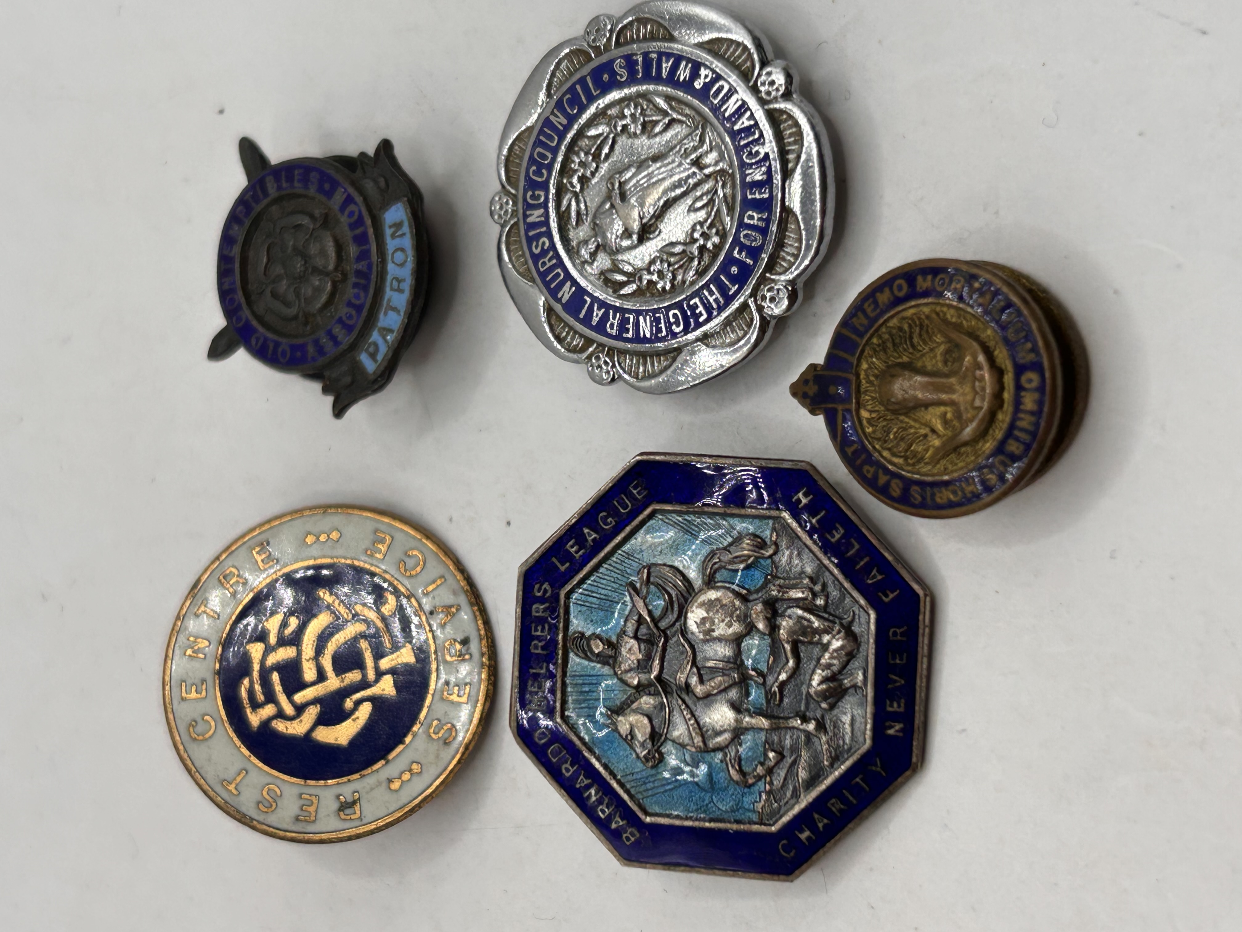 A collection of five vintage and antique commemorative and service badges constructed from mixed metals including brass, gilt, and silver-toned finishes, featuring hard fired enamel decoration primarily in shades of blue, white, and gilt. The collection includes a large octagonal blue enamel badge for the ‘Barnardo Helpers League’ featuring the motto ‘CHARITY NEVER FAILETH’ and a central equestrian figure, consistent with pieces identified as 1940s British Home Front items. The lot also contains a circular gilt-edged ‘WEST CENTRE SERVICE’ badge, a smaller, dark blue ‘PATRON’ badge, a scalloped badge for ‘THE GENERAL NURSING COUNCIL FOR ENGLAND & WALES,’ and a small circular stud featuring Latin mottos including ‘NEMO ME IMPUNE LACESSIT’ and ‘OMNIS SAPINTIA.’ The reverse of several pieces are marked by the manufacturer, ‘Thomas Fattorini Ltd. Birmingham,’ and feature standard pin or safety catch fittings.
