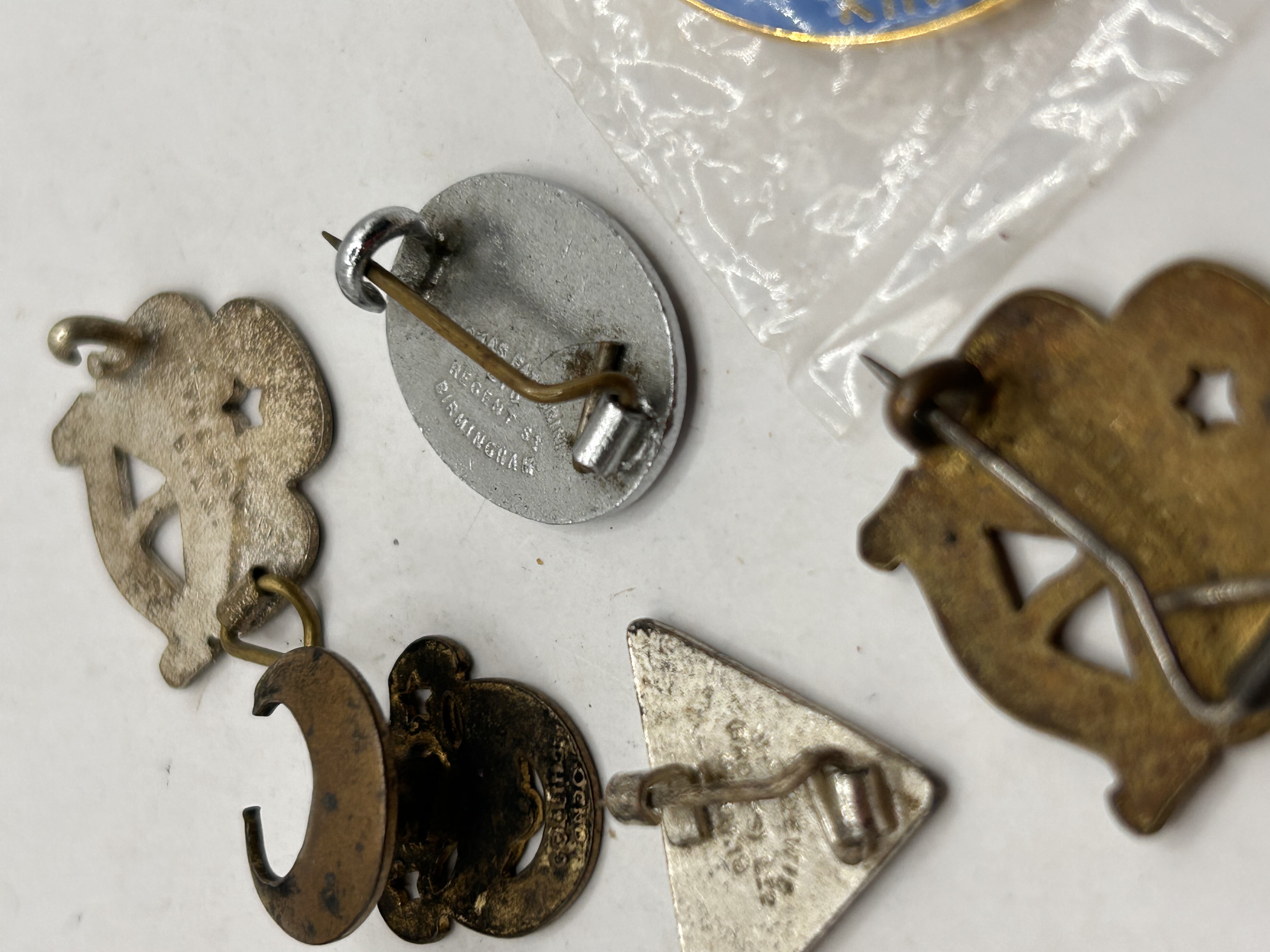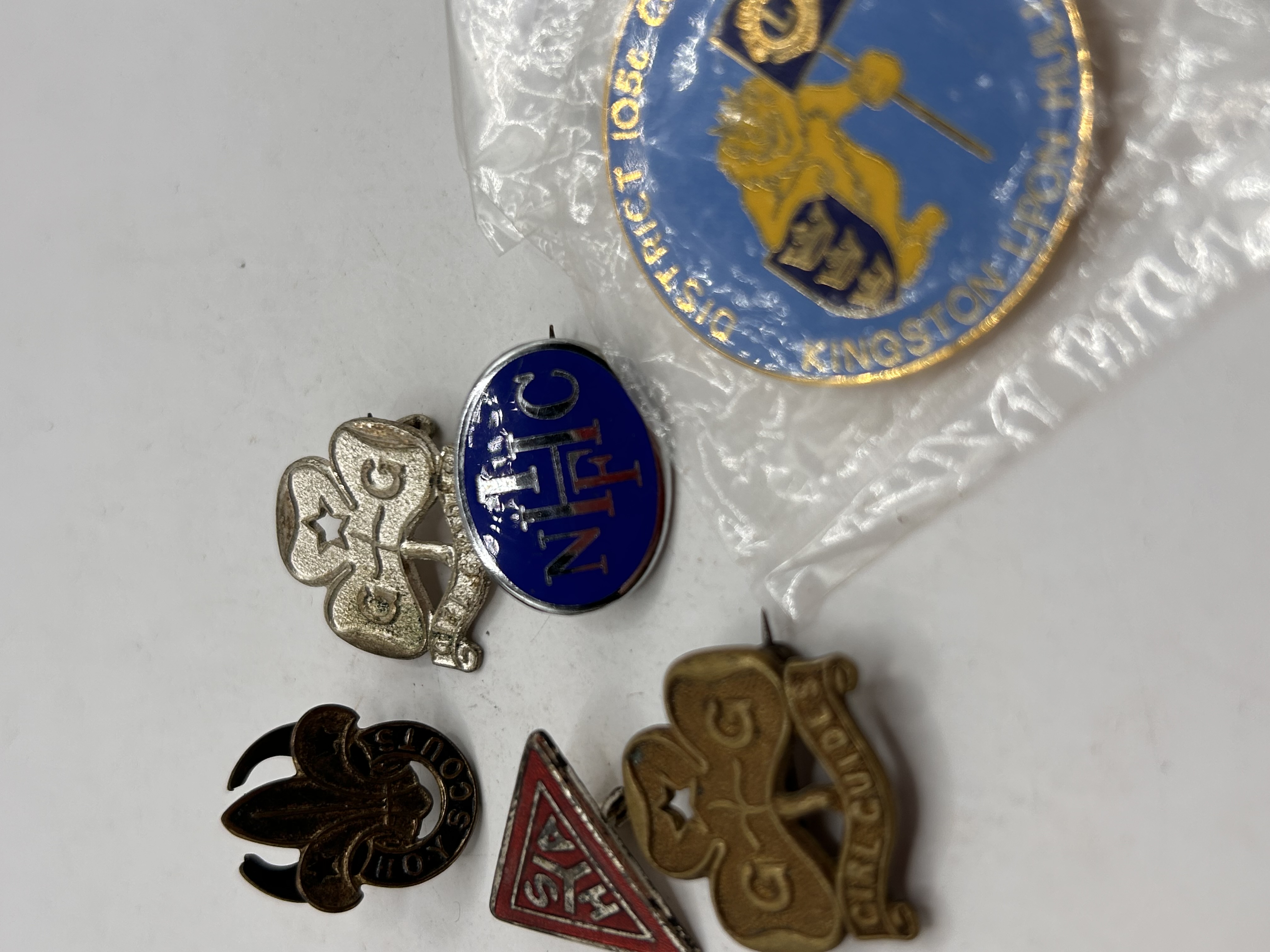 The collection consists of six vintage organizational pins and badges, primarily associated with scouting organizations. Construction materials include brass-tone, silver-tone, and dark metal alloys, accented with enamel detailing. Specific items identified are a black enamel Boy Scout fleur-de-lis pin marked BOY SCOUT, a brass-tone Girl Guides trefoil pin marked GIRL GUIDES, and a heavily tarnished silver/gold-tone trefoil pin featuring star cutouts. The lot also includes a small red and silver triangular pin, and a blue oval enamel pin featuring the capitalized letters NFHC. The sixth item is a large circular enamel pin, mostly enclosed within clear plastic packaging, featuring a blue background, gold lettering that includes DISTRICT 1950… and LIVINGSTON HURON MI, centered by a gold heraldic animal holding flags. Pin backs are present on all items.
