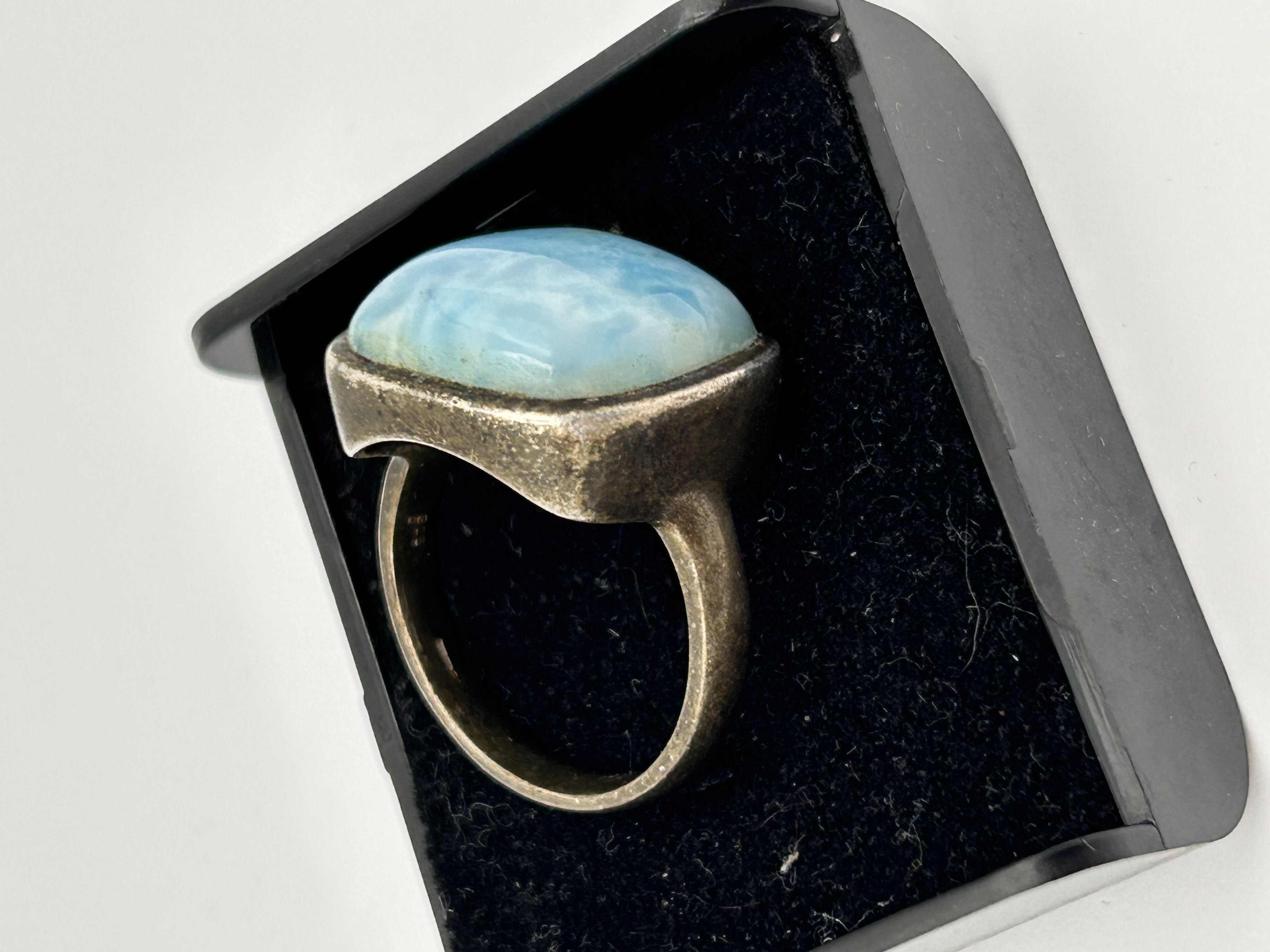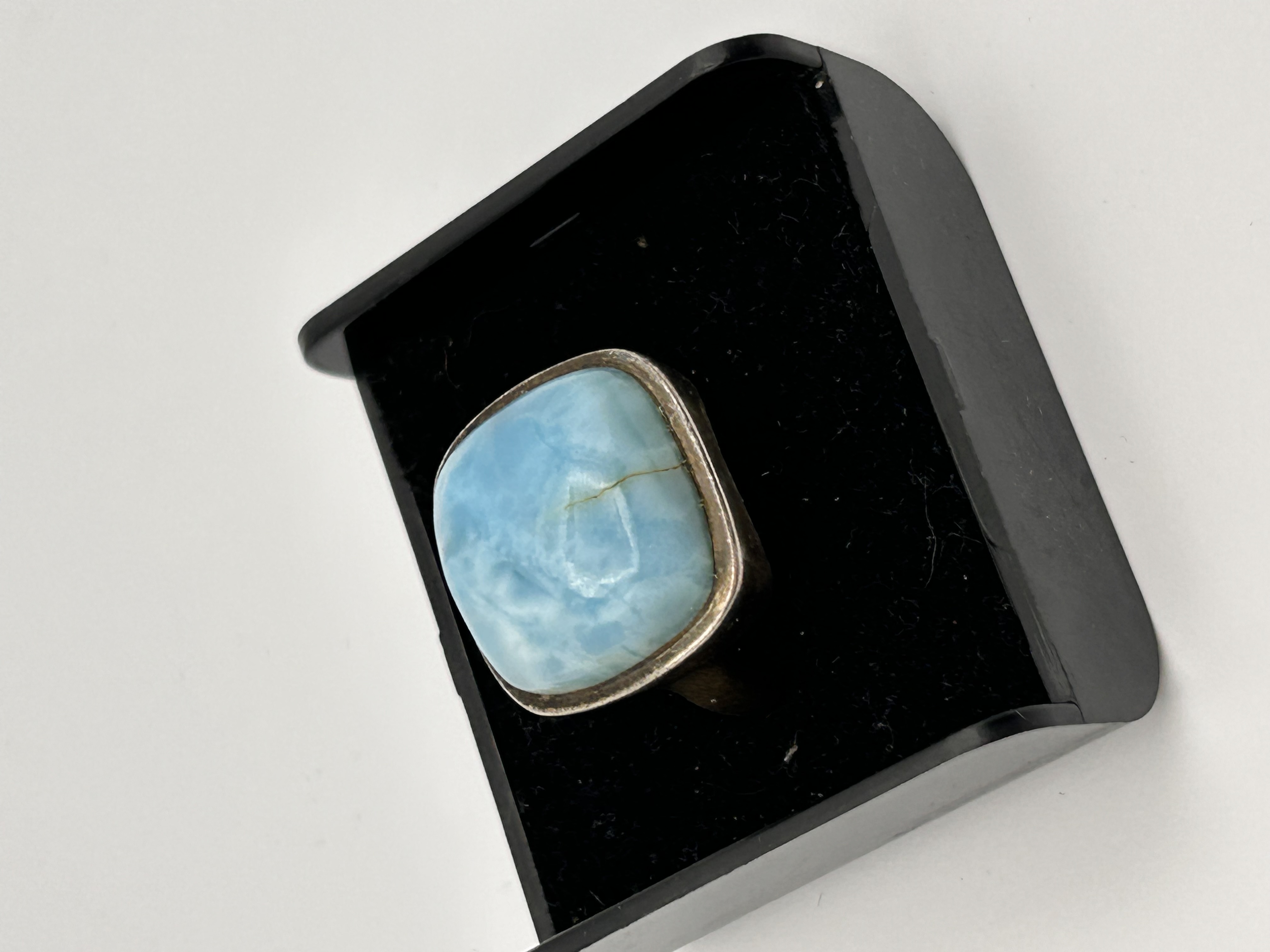 A substantial finger ring featuring a large, cushion-shaped cabochon Larimar gemstone, attributed to the Navajo style. The Larimar stone exhibits the characteristic sky-blue color with mottled white patterning and translucence. The gemstone is secured in a heavy, polished bezel setting crafted from Silver, with a wide shank. No visible hallmarks or maker’s marks are discernible on the metal surface.