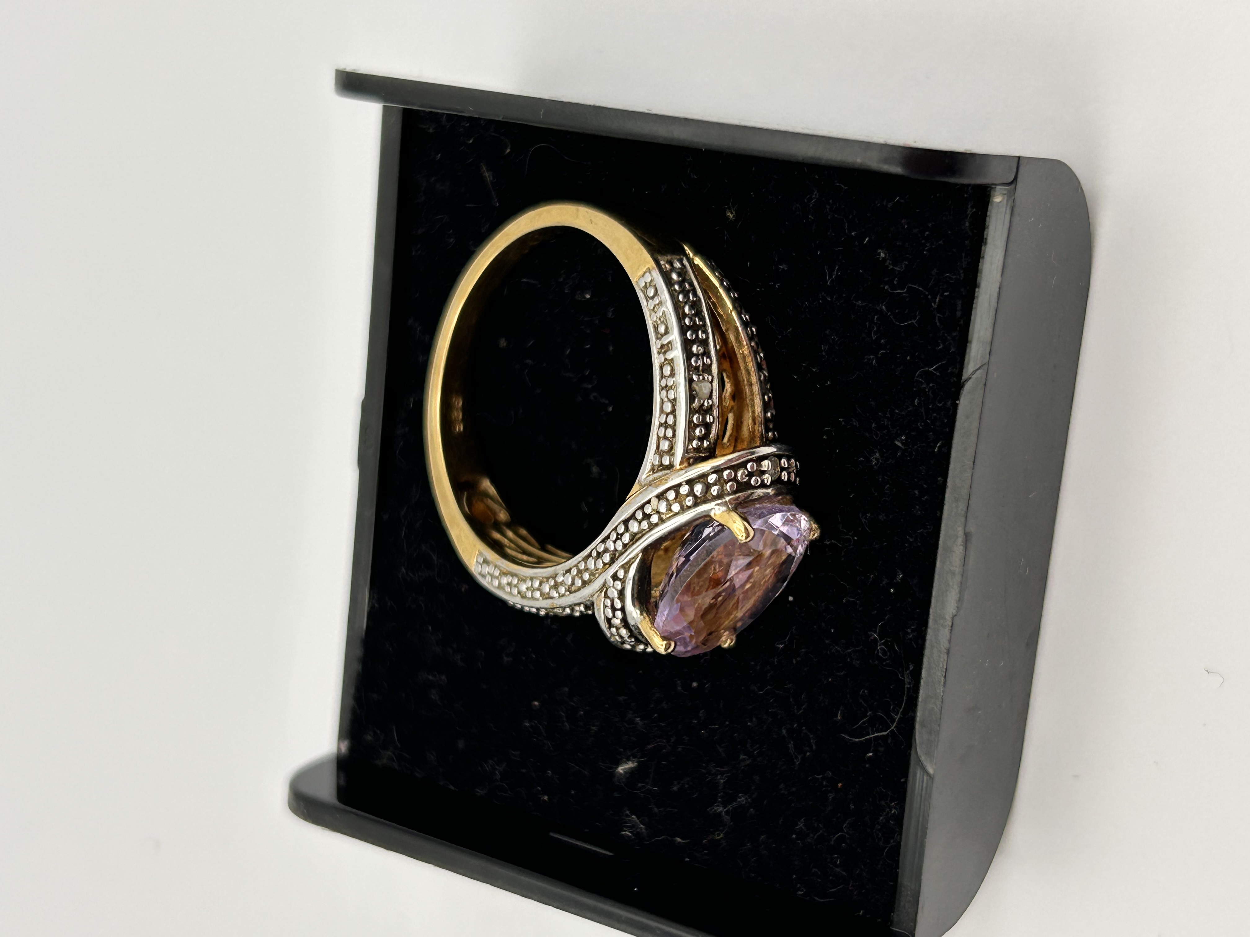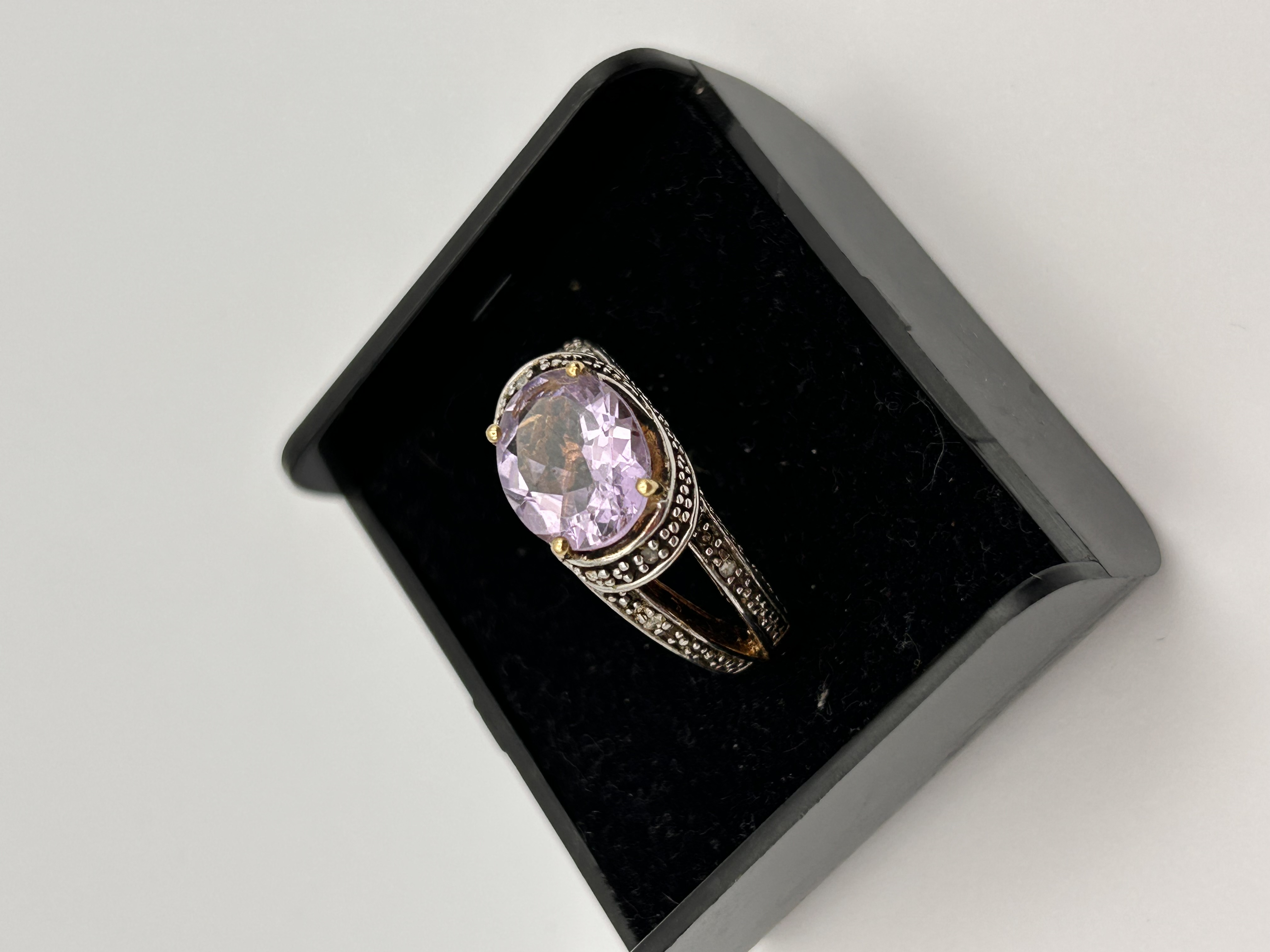 A single cocktail ring constructed of Silver, featuring a two-tone design achieved through plating or bi-metal construction. The ring is centered by a large, oval, faceted stone of a pale pinkish-purple hue, consistent with Kunzite, secured by four gold-toned prongs. The setting utilizes a gold-toned metal for the inner band and accents, contrasting with silver-toned metal forming the textured, bifurcated shoulders. The shoulders are detailed with numerous small, round, colorless accent stones, set in a pave or beadwork style. The overall design is typical of contemporary jewelry often marketed as Gold Over Sterling Silver. No legible hallmarks or inscriptions are visible on the shank.
