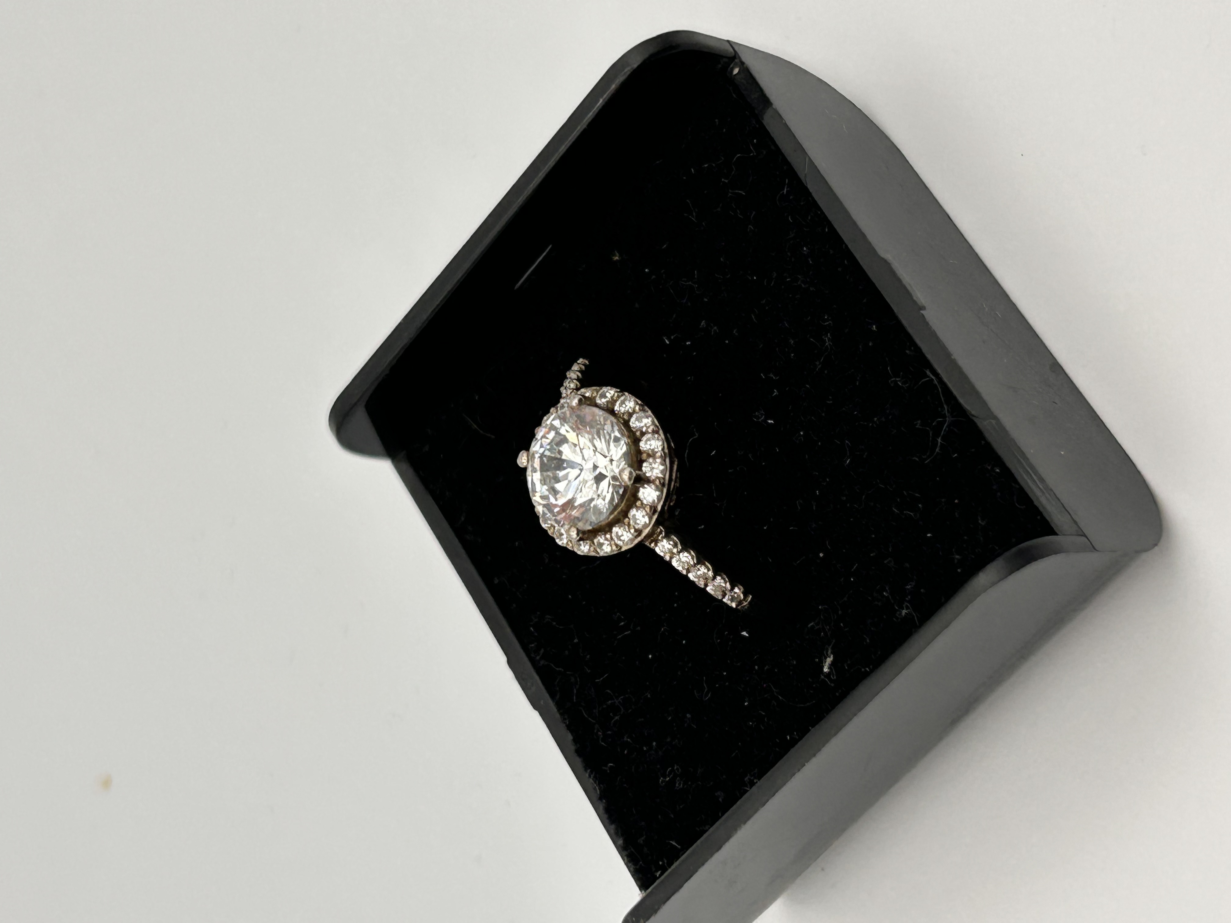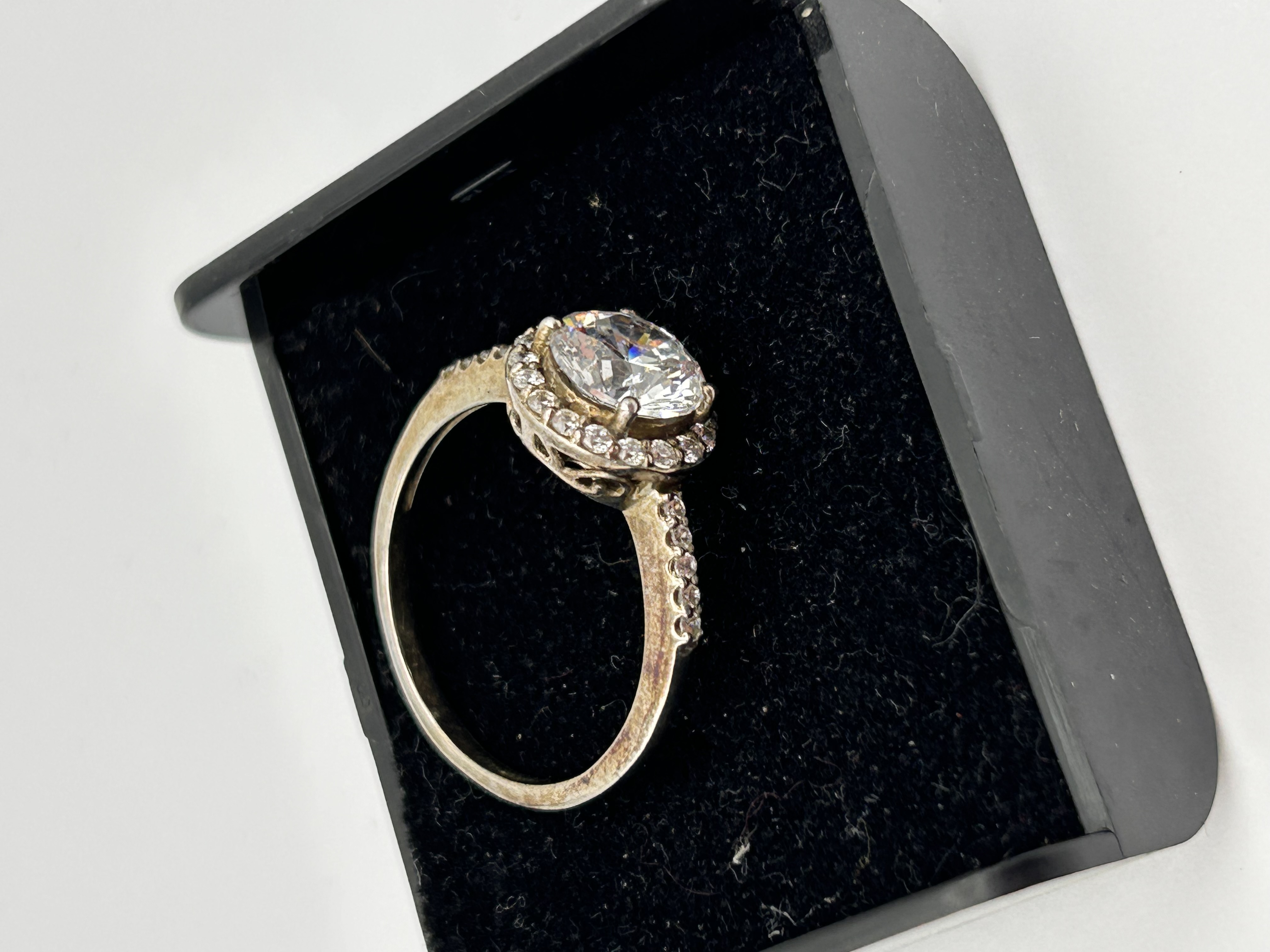 A single finger ring constructed of Silver, featuring a contemporary halo setting style. The ring is set with a large, round brilliant-cut central colorless stone, which is encircled by a halo of smaller colorless accent stones. Additional accent stones are pavé-set along the shoulders of the band. The style is consistent with modern engagement or dress rings featuring diamond simulants such as moissanite or cubic zirconia, as suggested by comparable market listings. No visible hallmarks or manufacturer markings were observed.