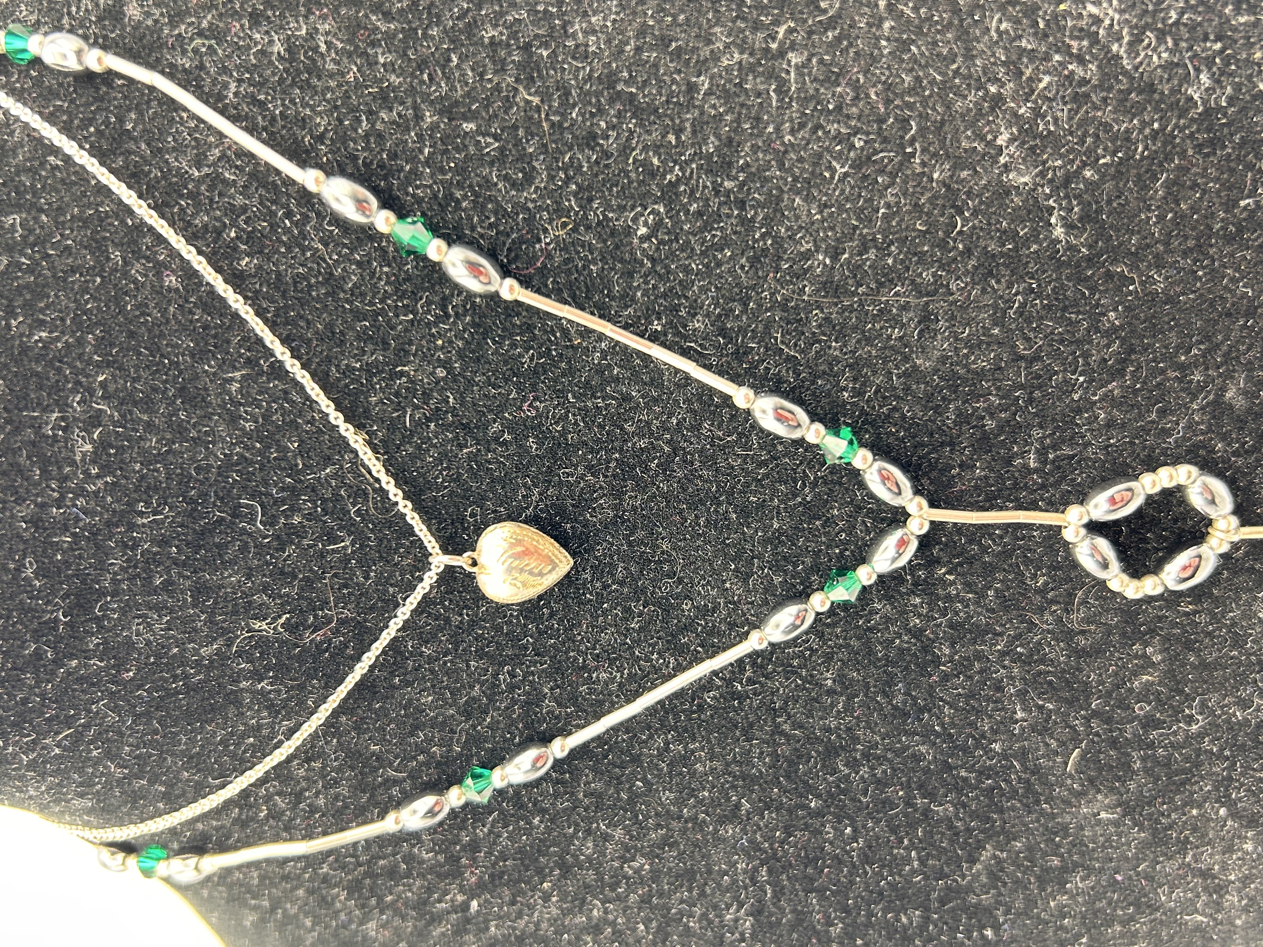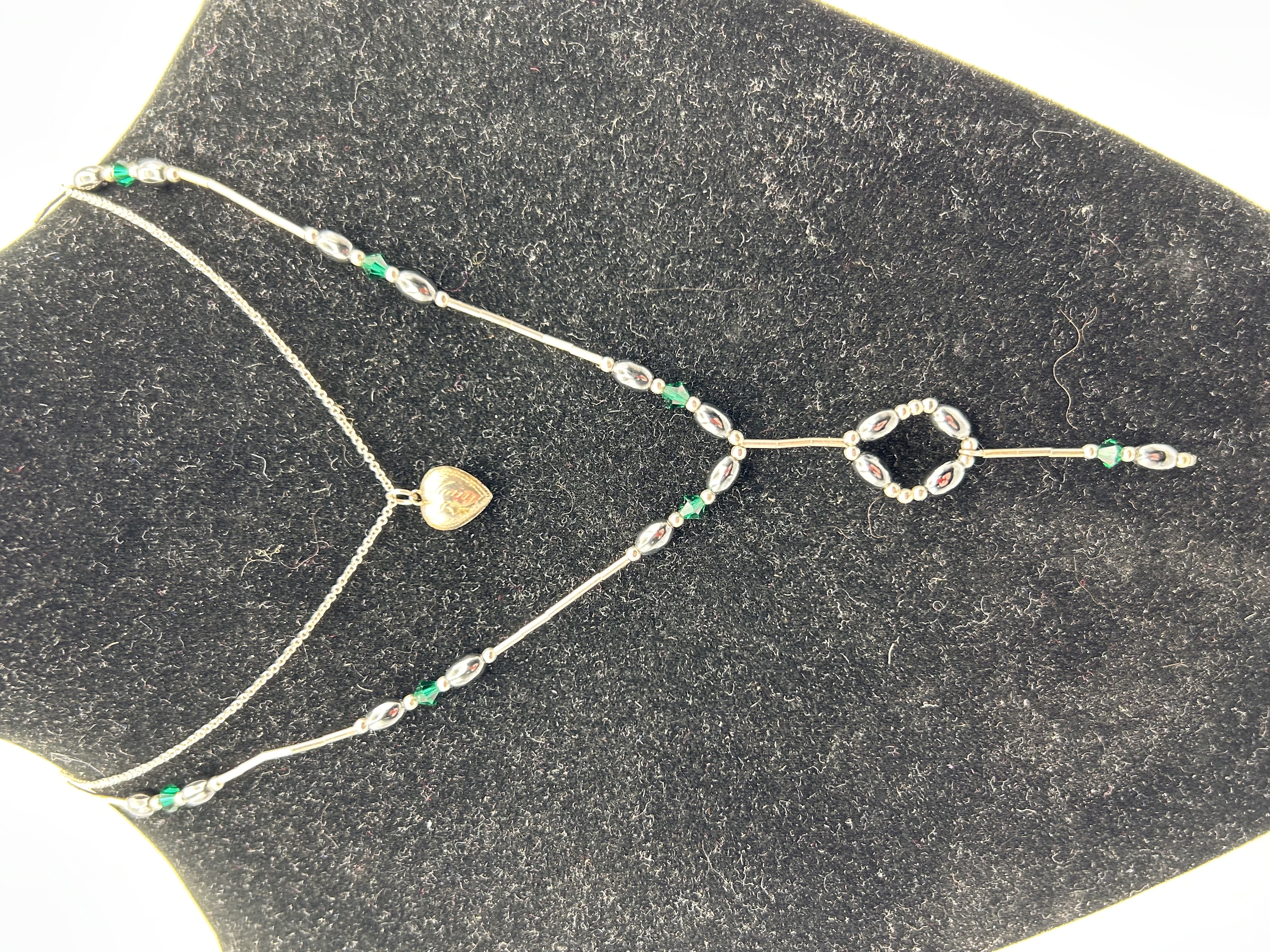 A pair of fashion necklaces displayed layered. The first necklace is a simple chain supporting a small, polished, gold-tone heart-shaped pendant, likely a locket. The second necklace is a beaded Y-style lariat crafted from silver-tone metal chains and findings. This longer piece is accented with alternating ellipsoid silver-tone beads, which resemble hematite, and small, faceted emerald green glass or crystal beads. The lariat terminates in a decorative drop featuring an open circular element formed by beads, culminating in a single linear drop. No hallmarks or maker’s inscriptions are visible. The materials suggest these are costume or fashion jewelry pieces.