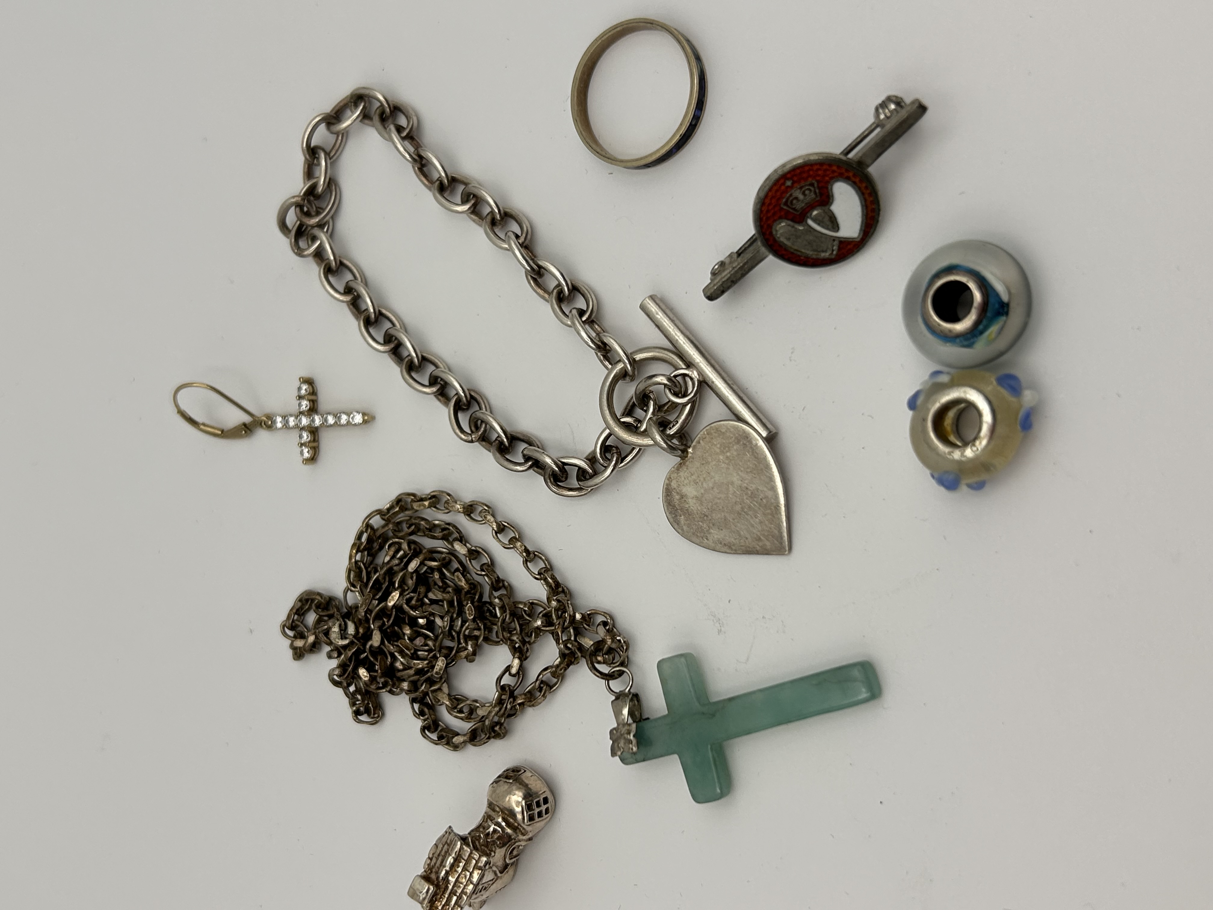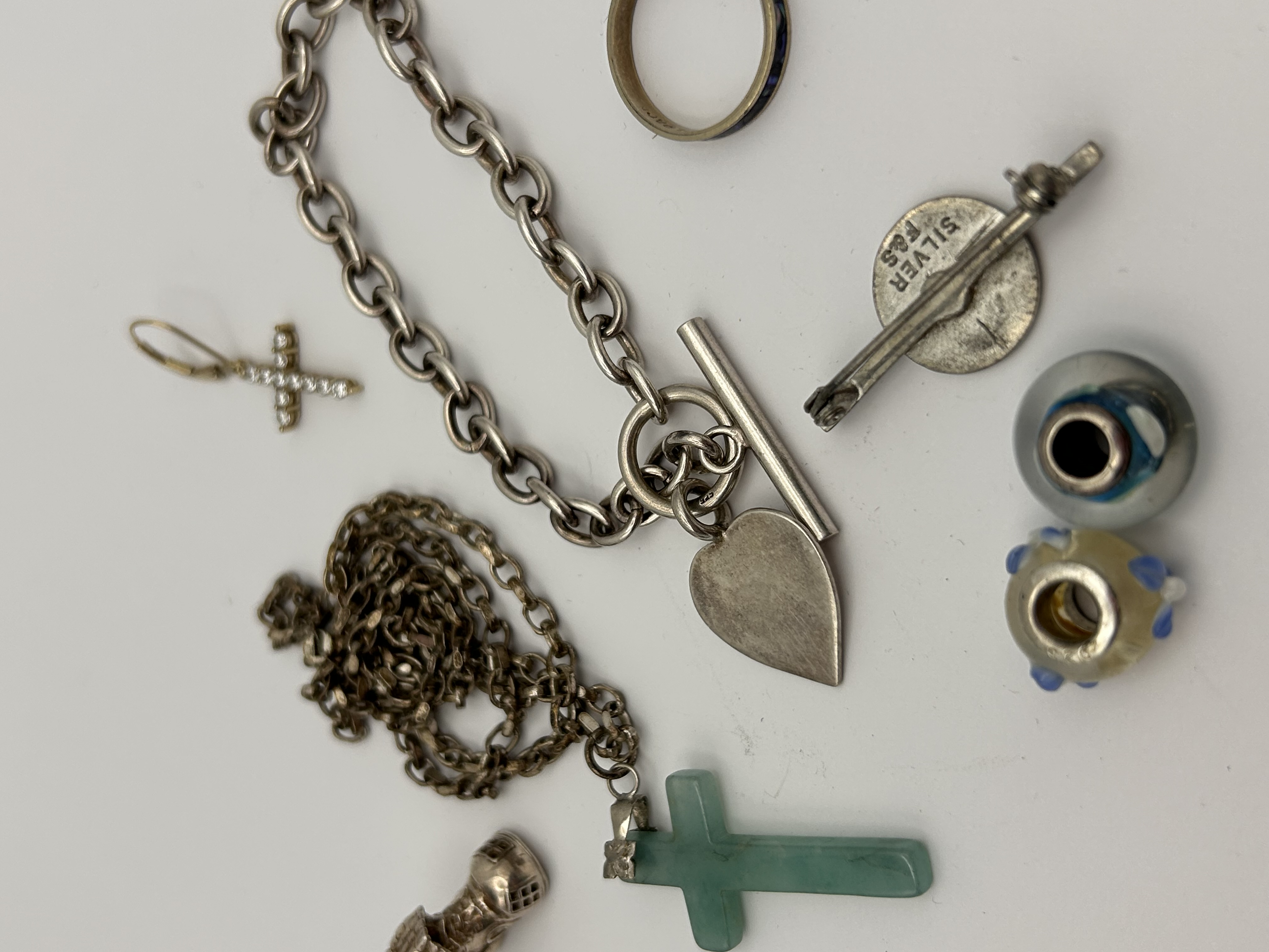 A collection of eight jewelry items and components, primarily executed in silver-tone metal. The most prominent piece is a heavy oval link bracelet secured by a heart-shaped toggle closure, consistent with designs commonly attributed to Vintage 925 Solid Sterling Silver cable link jewelry based on market comparisons. The lot also includes a separate tarnished fine link chain attached to a polished, solid green stone or jade cross pendant. Further items comprise a single small earring featuring a pave-set rhinestone cross dangle on a leverback hoop, two modular glass beads (one yellow/blue patterned, one grey/blue internal design), a simple metal band ring with dark blue inlay, and an ornate metal charm or fob. Also included is a metal key-shaped fob with a circular head featuring red and white enamel accents. The reverse side of this key-fob is visibly stamped with the text SILVER P&S.