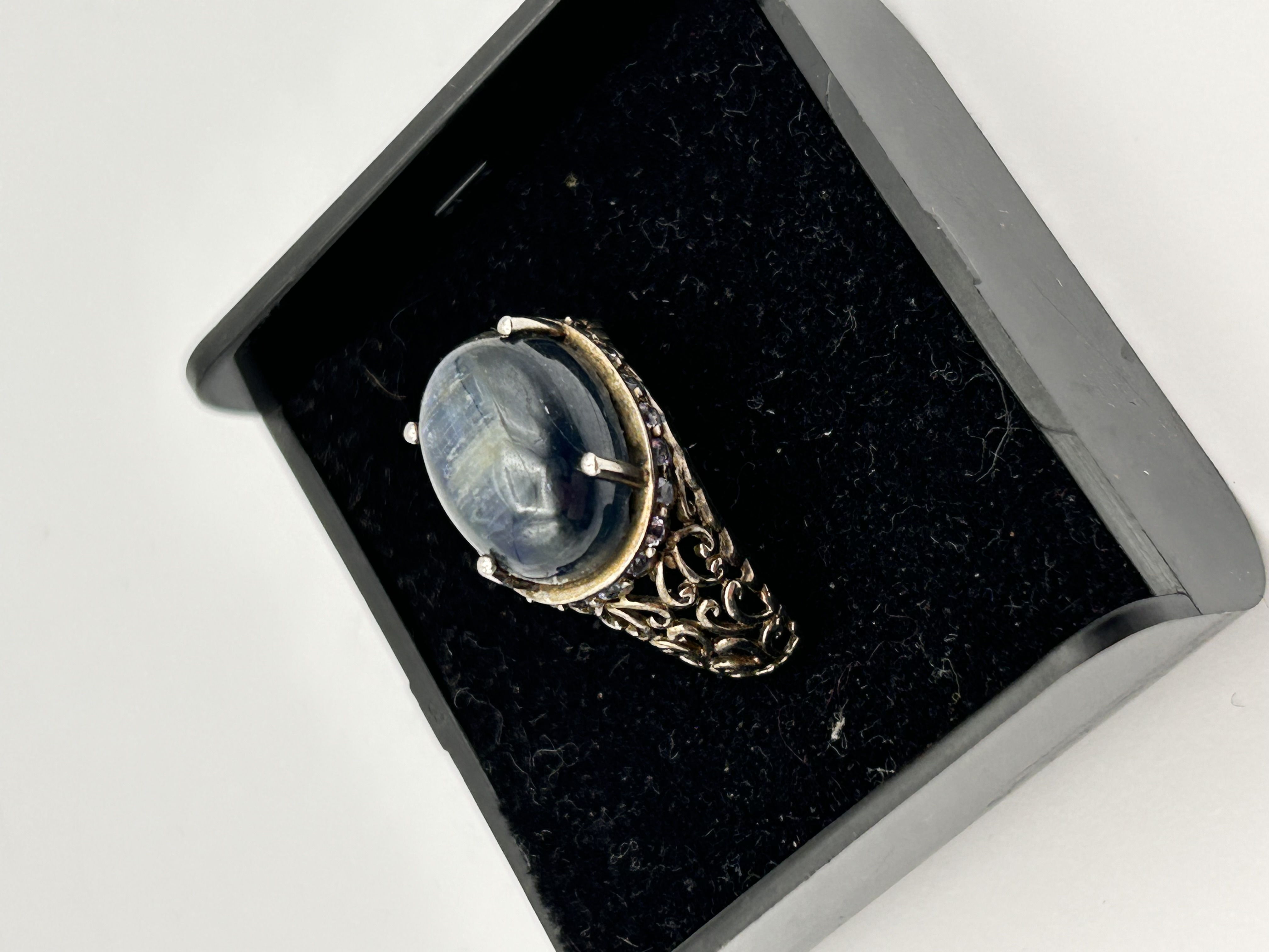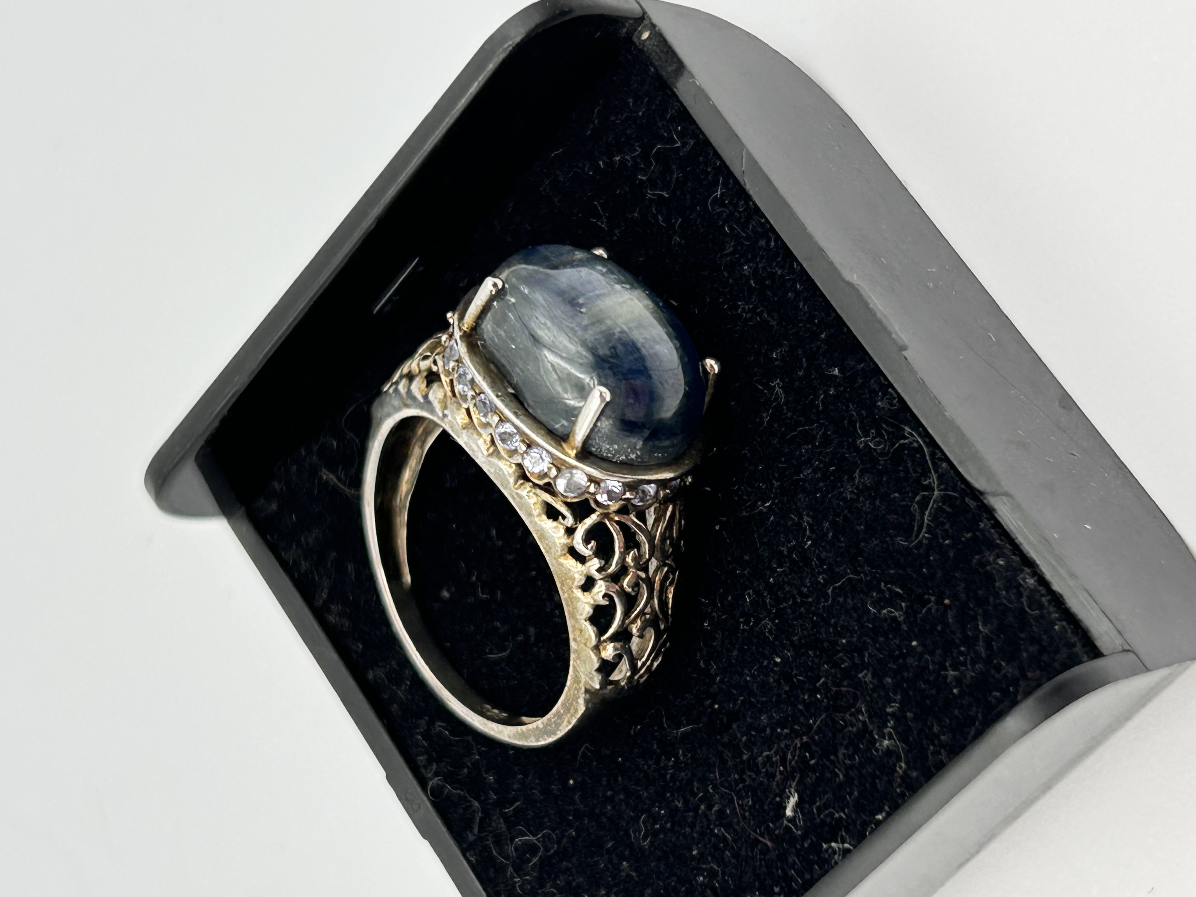 A single ring, identified by market consensus as a Sterling Silver piece set with a natural Labradorite stone, often marketed as a men’s style. The ring features a large, oval cabochon-cut Labradorite stone secured by a six-prong setting. The stone displays deep blue coloration and visible chatoyance (labradorescence). The white metal mount, consistent with Sterling Silver, features highly ornate, pierced, openwork, or filigree detailing on the shoulders and band. A row of approximately eight to ten small, round-cut accent stones, appearing pale blue or colorless, encircles the base of the main stone setting. The item is photographed displayed in a black velvet-lined presentation box.