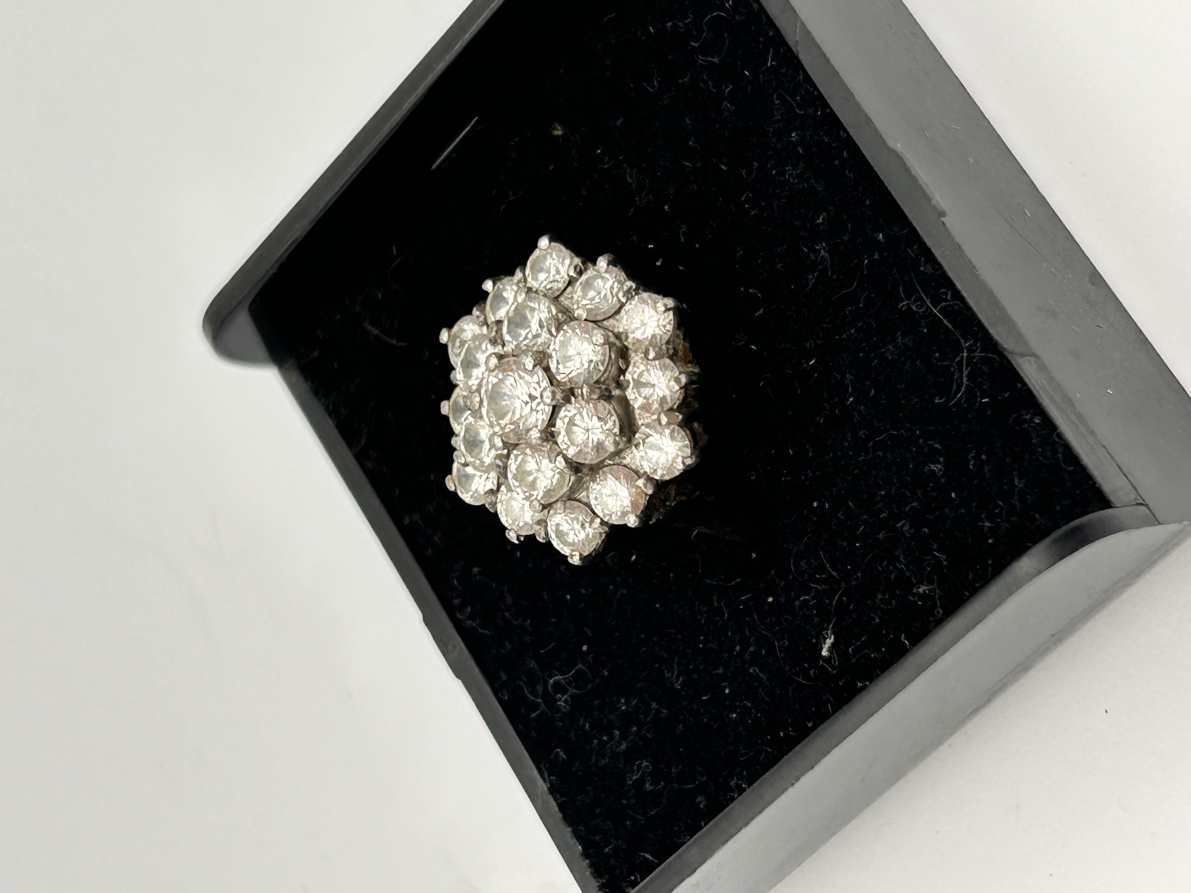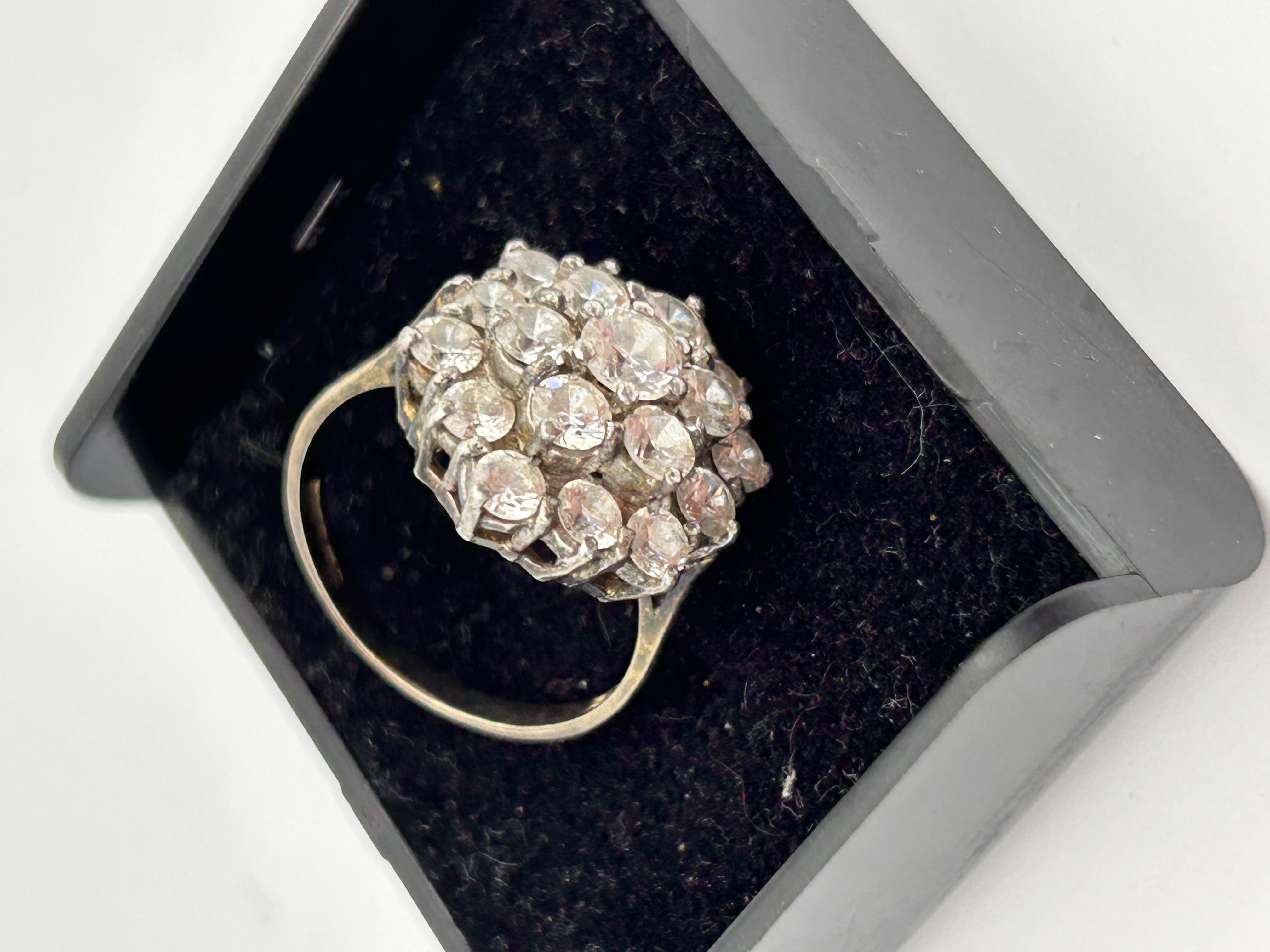 A vintage style cluster ring featuring a dense, dome-shaped (bombée) head set with 19 clear, brilliant-cut paste stones (rhinestones) of varying sizes. The stones are prong-set in a white metal setting, forming a complex floral cluster pattern. The design is highly reminiscent of mid-century costume jewelry, particularly the large domed cluster brooches attributed to makers such as Weiss, based on market comparisons. The ring shank is simple and the setting shows no visible hallmarks or maker’s marks. The piece is presented resting in a small, black plastic jewelry box lined with black velvet.