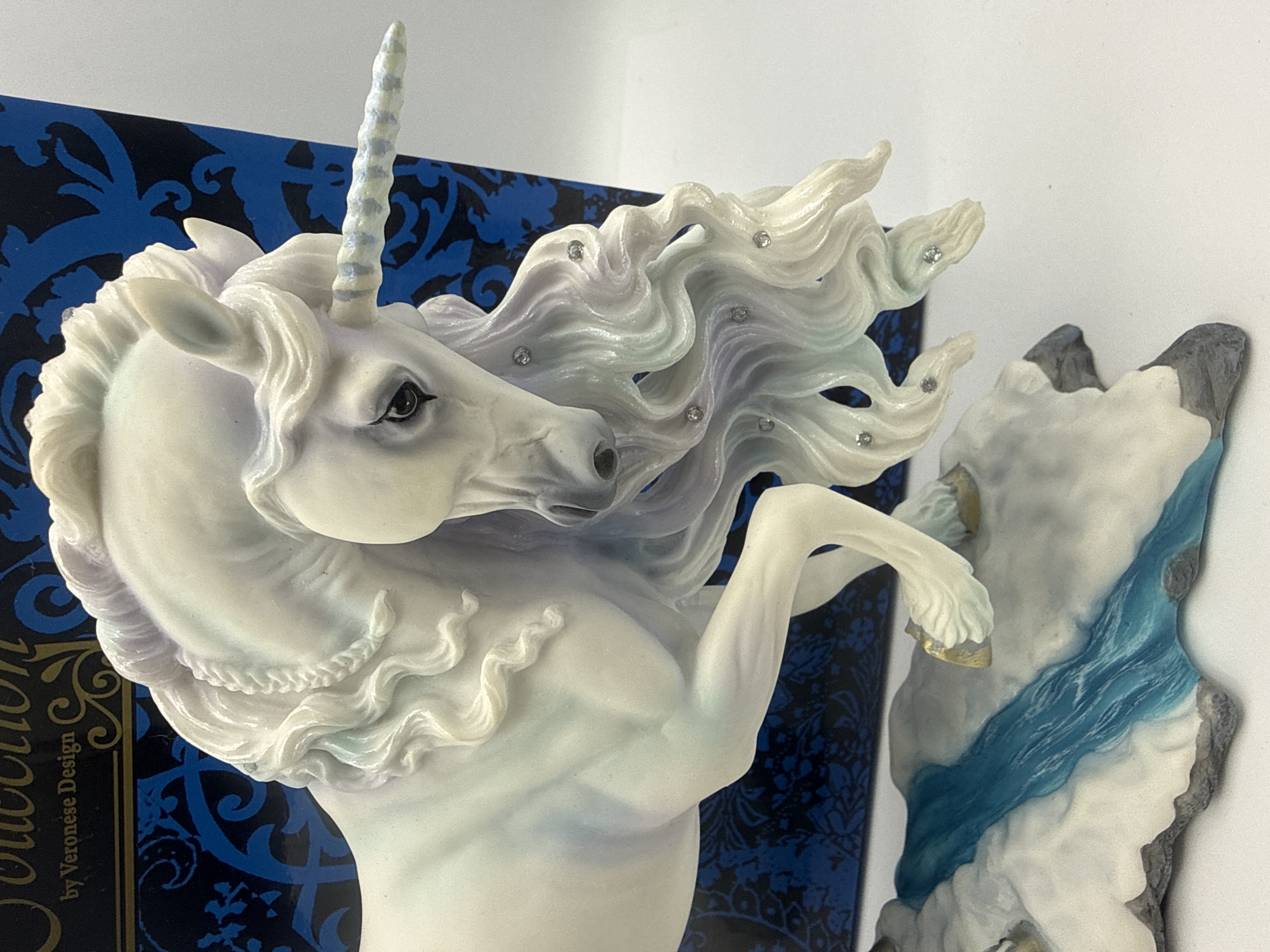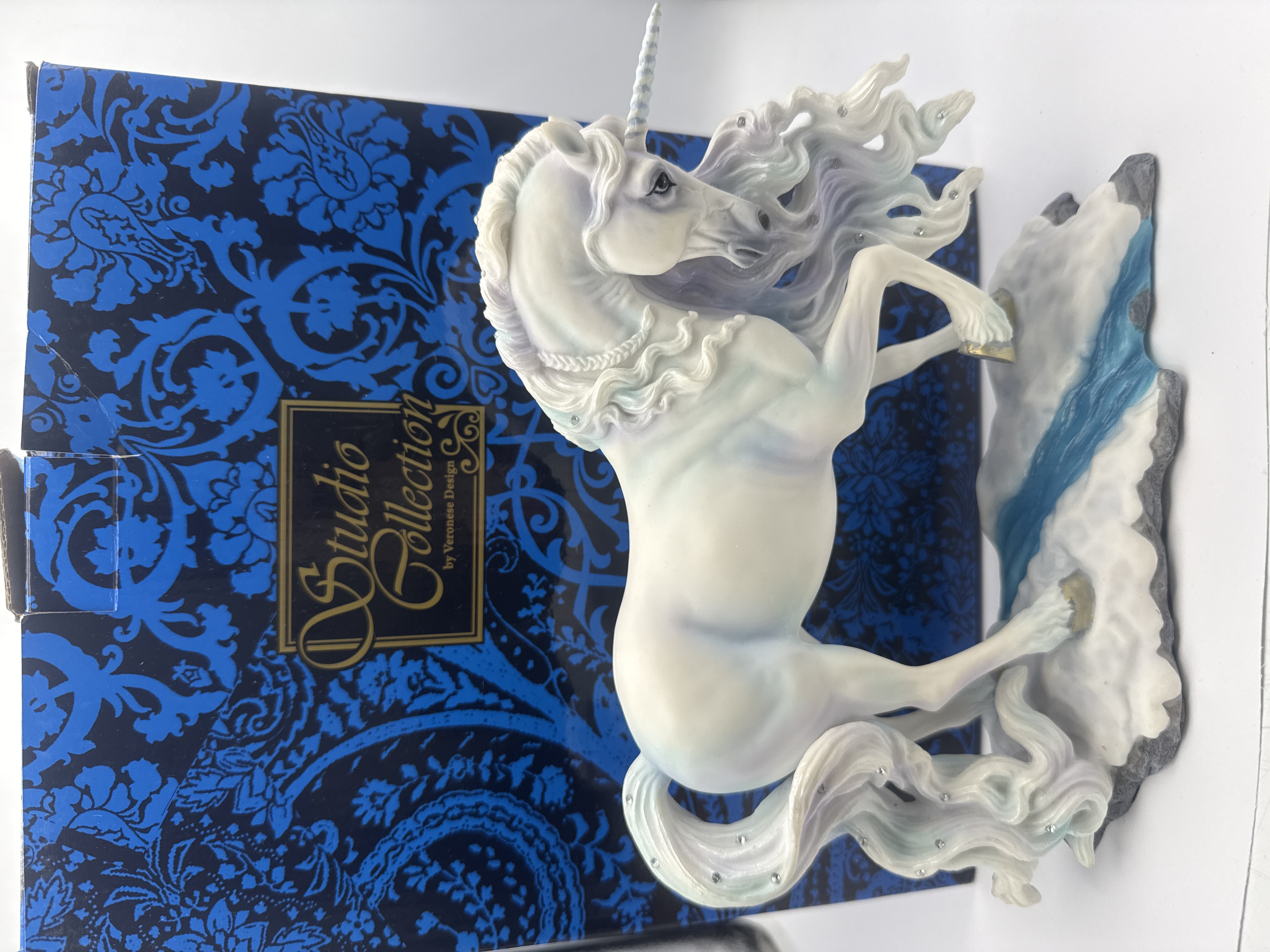 A fantasy figurine titled “Pure Spirit,” produced as part of the Studio Collection by Veronese Design. The lot includes the detailed figurine and its original packaging box. The sculpture depicts a standing unicorn crafted from painted cold-cast resin or similar composite material. The body is predominantly white, featuring iridescent washes of lavender and blue in the flowing mane and tail. The mane and tail are accented with small, embedded clear crystals or rhinestones. The unicorn is mounted on an integral base simulating gray, rocky terrain with a turquoise blue painted stream. The accompanying packaging is a deep blue cardboard box decorated with a black damask pattern and features the gold-bordered label “Studio Collection by Veronese Design.”