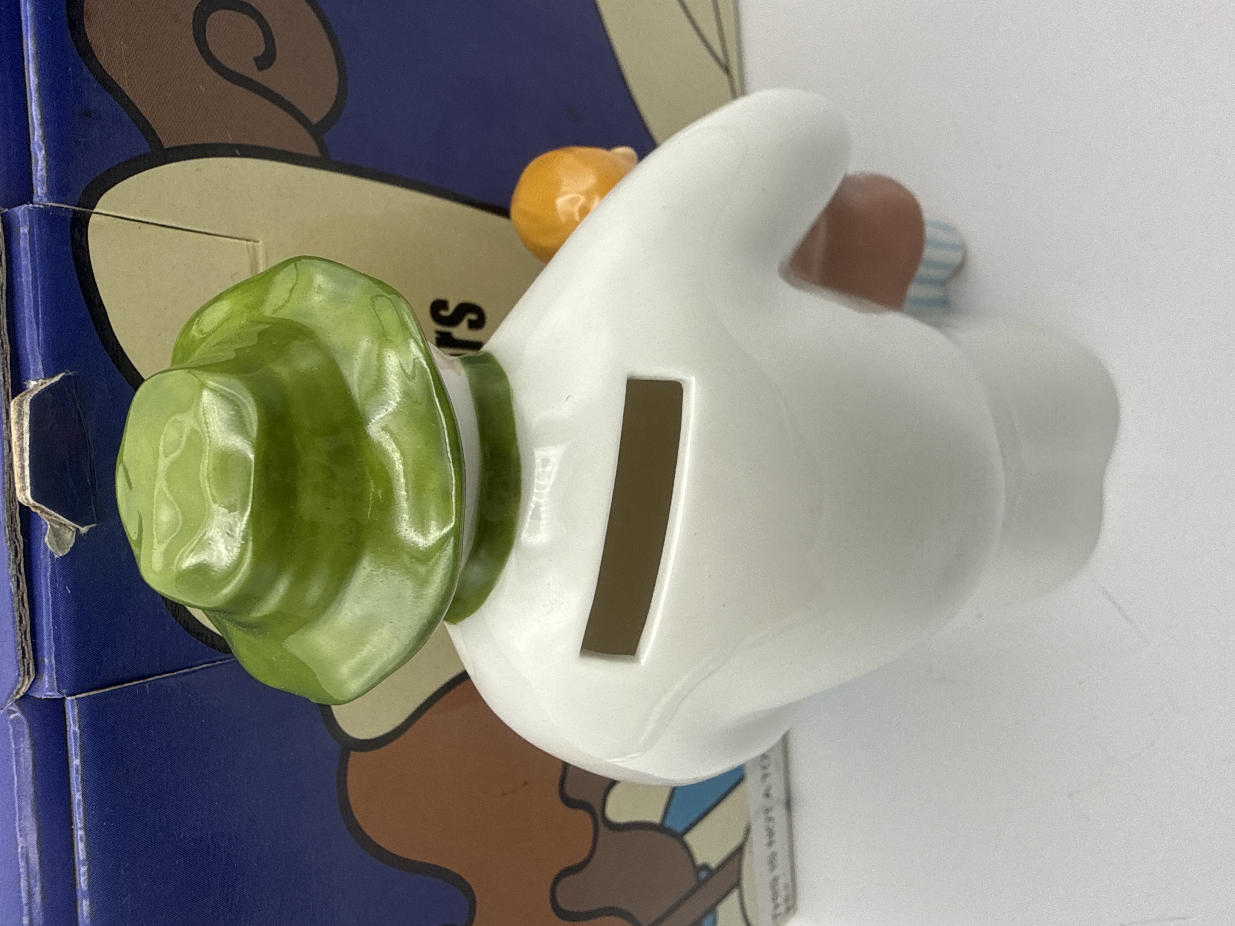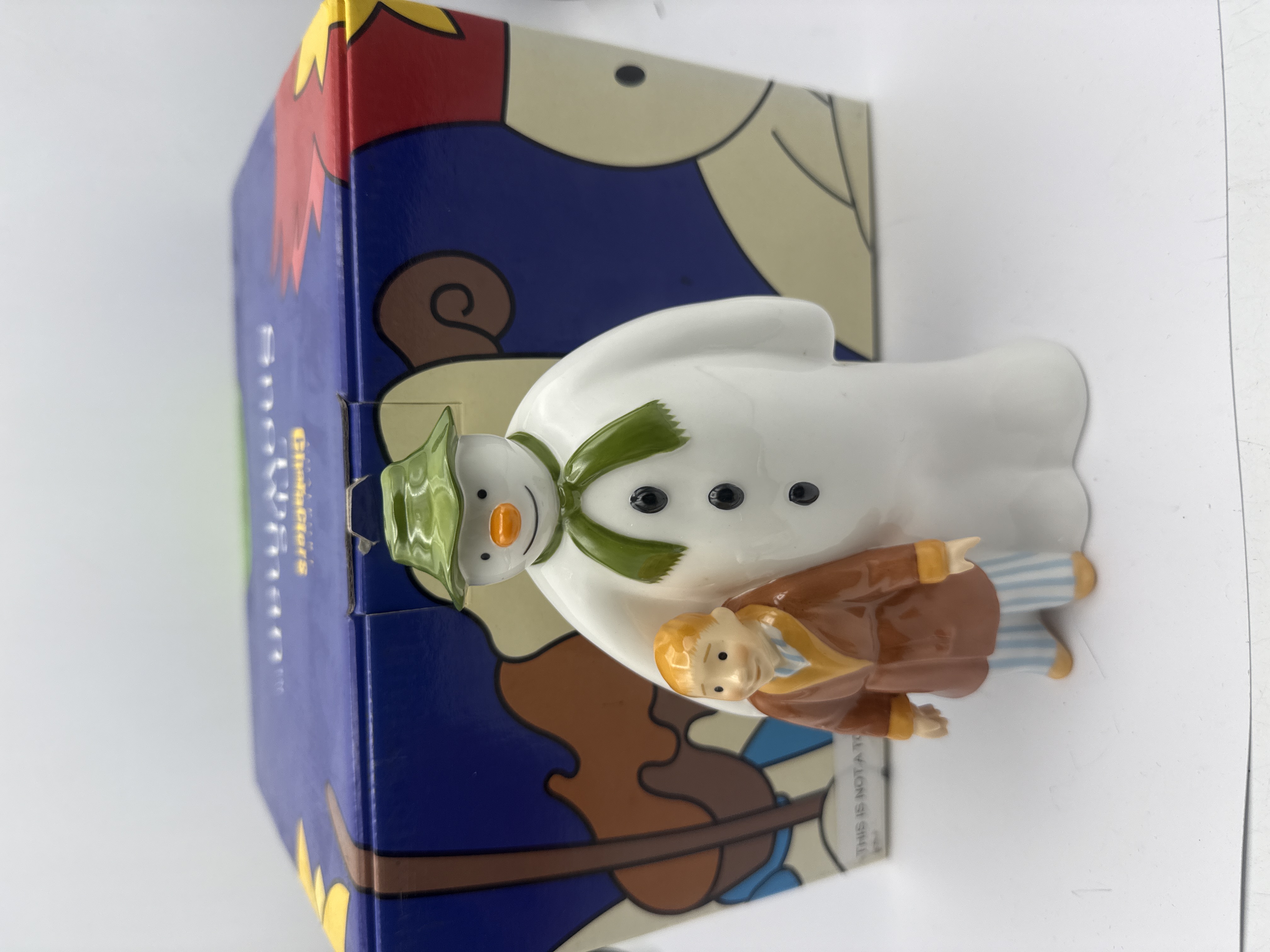 A Coalport Characters figural money box, depicting the Snowman character from the 1982 animated film, *The Snowman*. The piece is rendered in glazed porcelain or earthenware with bright coloration. The Snowman is shown wearing a green hat and scarf, standing next to the boy character, who is dressed in brown and striped pajamas. The reverse side of the Snowman features a rectangular coin slot, confirming its function as a savings bank. The piece is presented with its original blue packaging box, which features visible text identifying the theme as *The Snowman*.