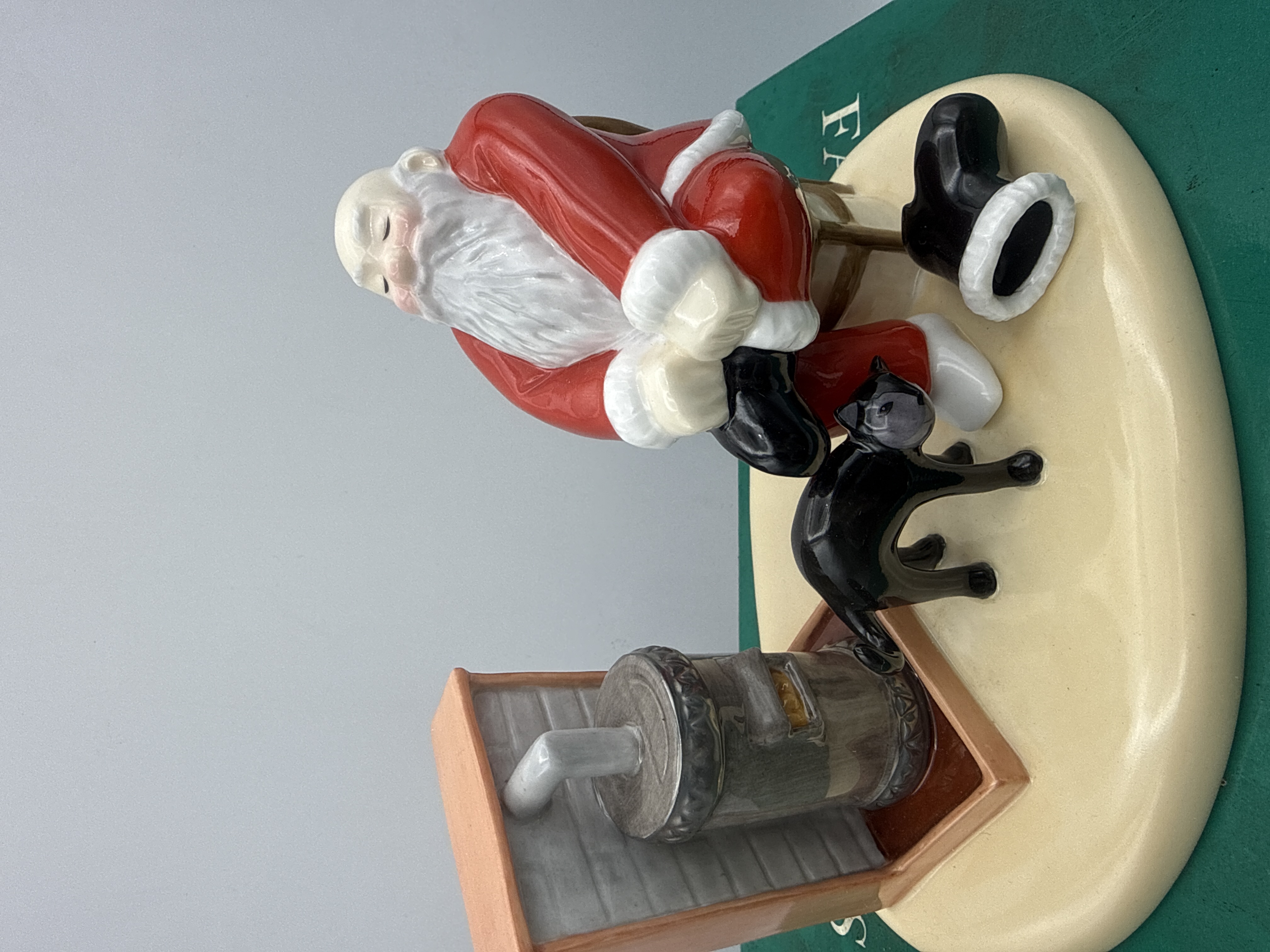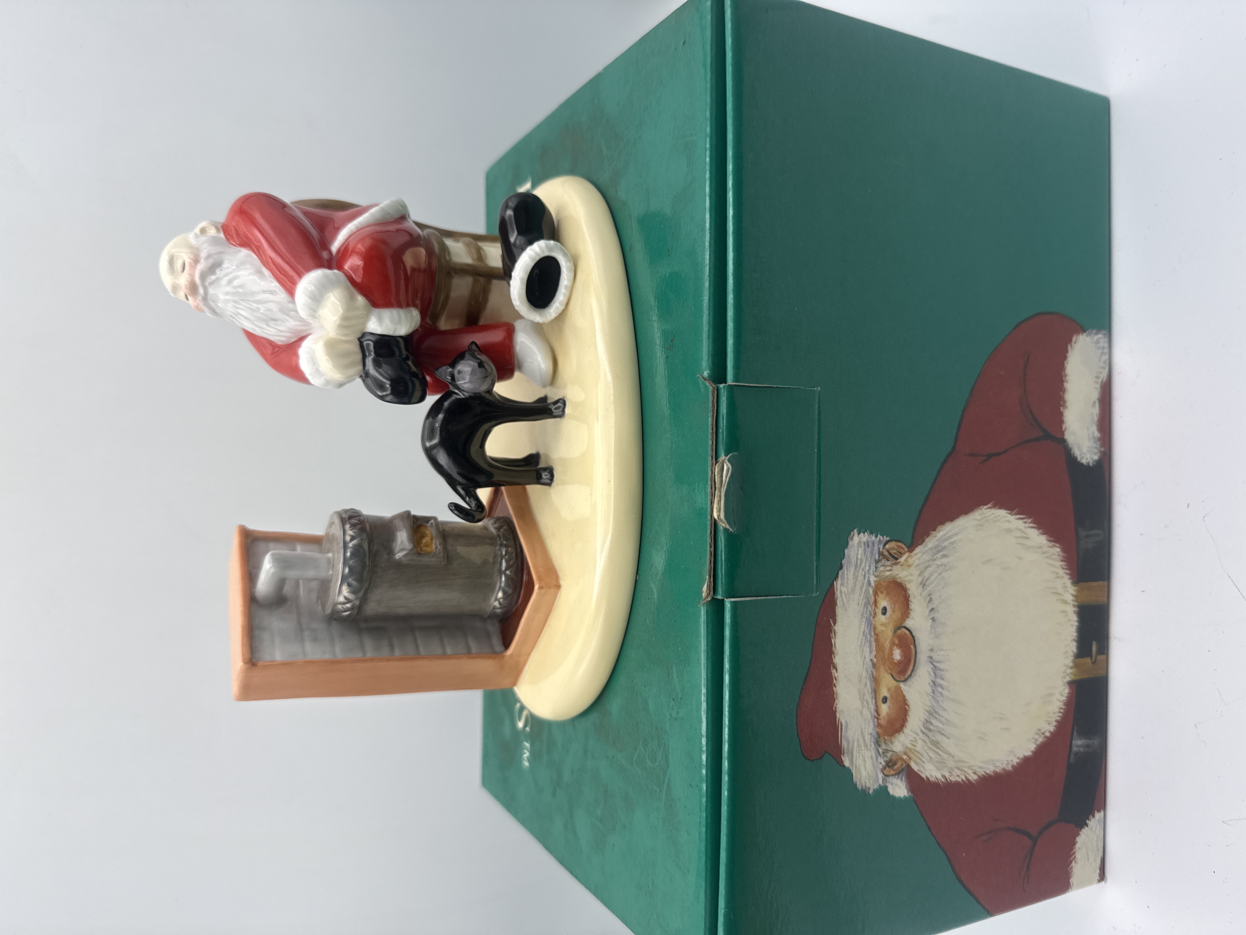 A single ERTL Coca-Cola Santa Claus Mechanical Bank figurine, dating circa 1993-1994. The collectible depicts Santa Claus seated and resting, dressed in his traditional red and white suit. He holds one black boot in his lap, while the second boot lies beside him on the cream-colored base. The scene includes a small black cat with an arched back and an old-fashioned potbelly stove housed within a decorative pink/salmon alcove structure. The item is identified through web intelligence as a mechanical bank, typically constructed from painted resin or ceramic. The figurine is presented with its original dark green cardboard presentation box, which features a large graphic illustration of Santa Claus on the front.