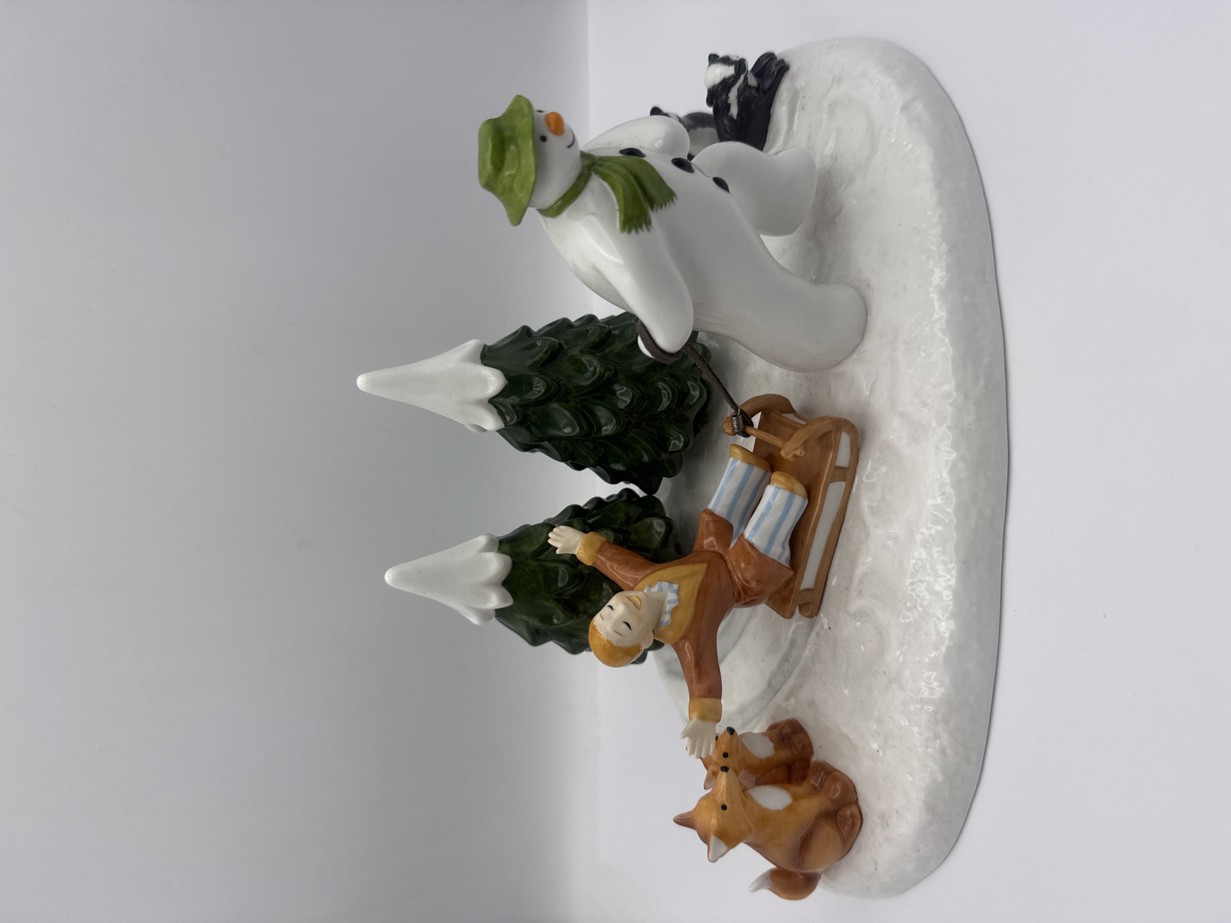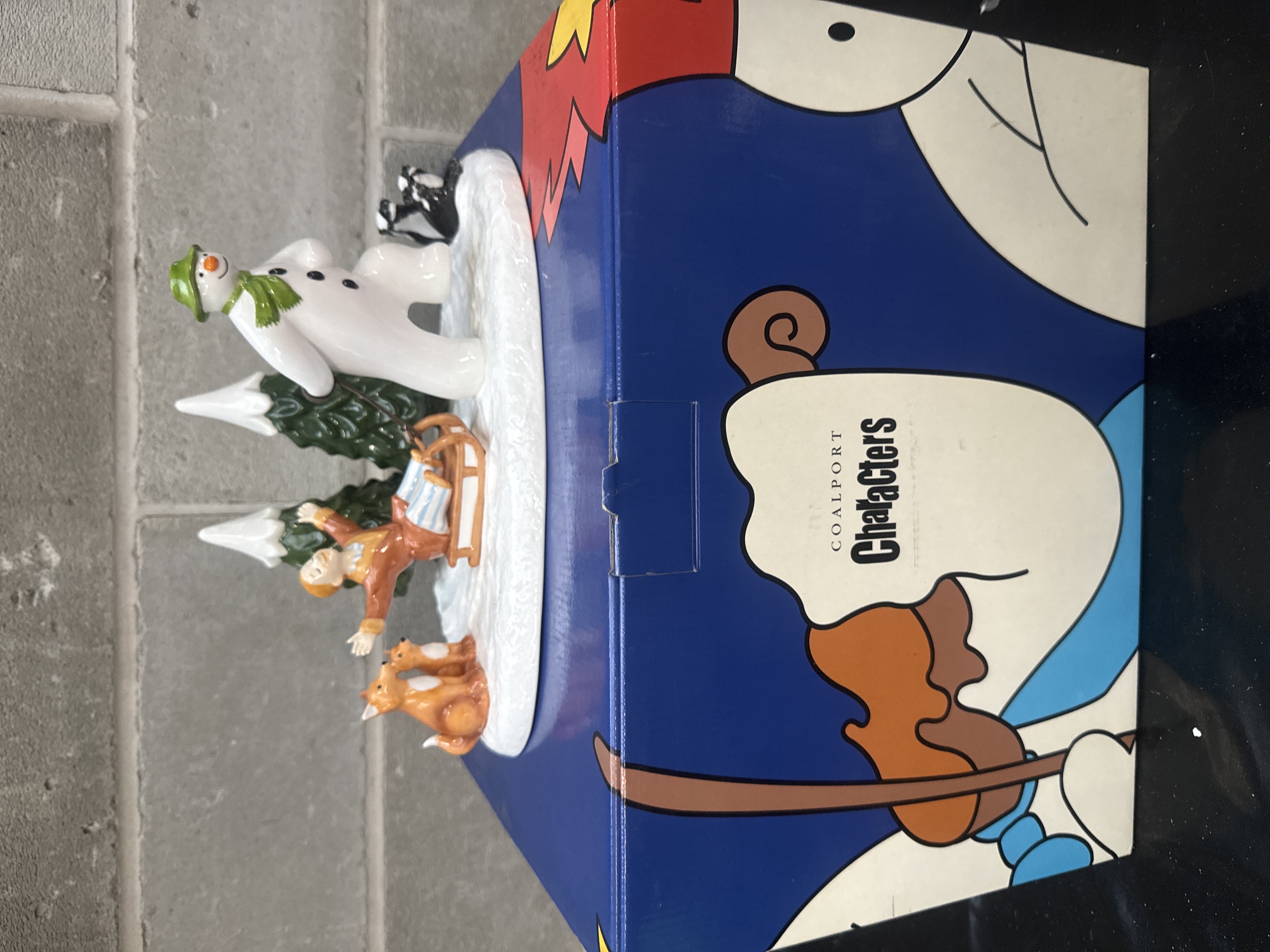 A single figural group crafted from glazed porcelain or ceramic, attributed to the Coalport Characters line. The piece depicts a whimsical winter scene featuring a central vignette where a snowman, wearing a green hat and scarf, pulls a small sled carrying a young person with outstretched arms. The scene is further populated by two small orange foxes and a black and white animal, set against two snow-capped pine trees on a white, textured base. The figurine is presented atop its original manufacturer packaging box, which is marked “COALPORT CHARACTERS.”