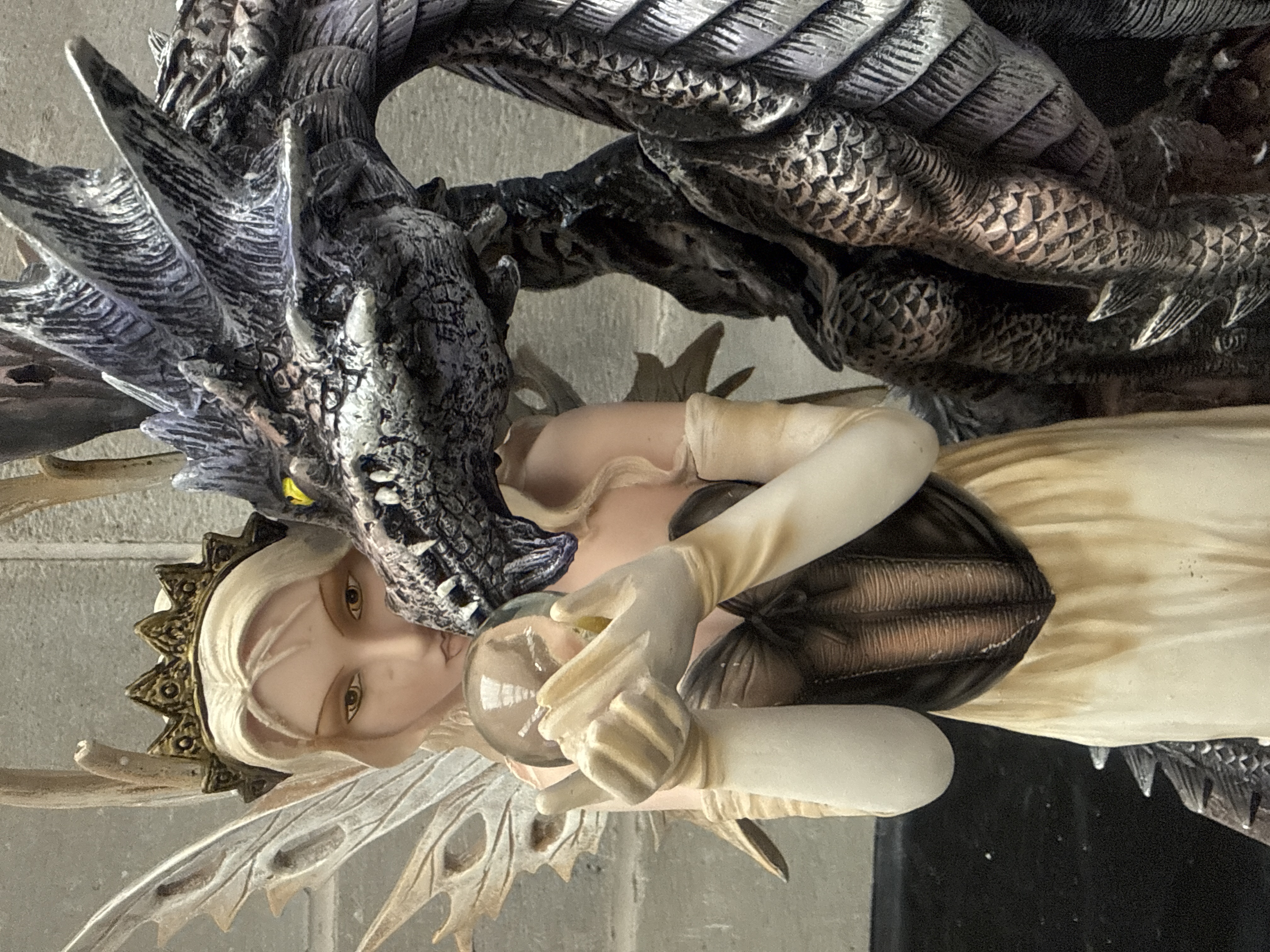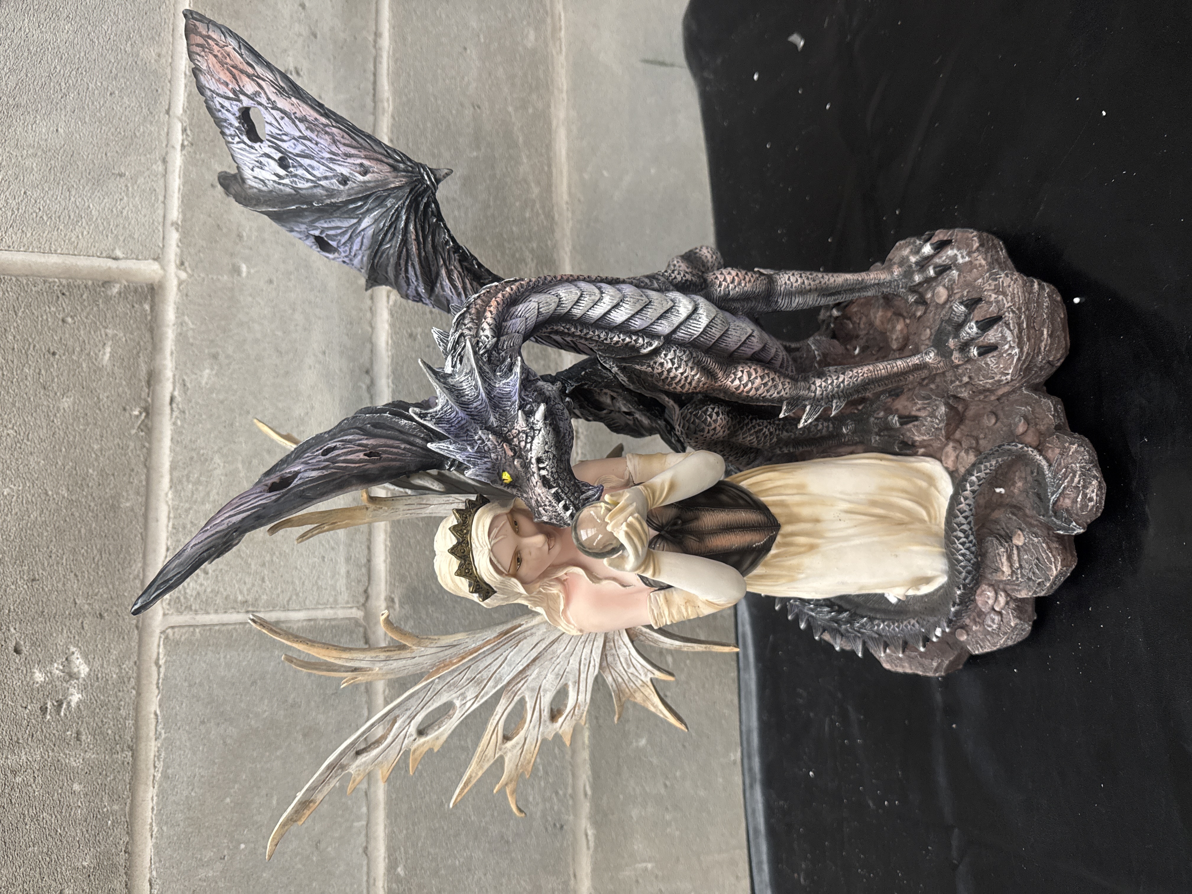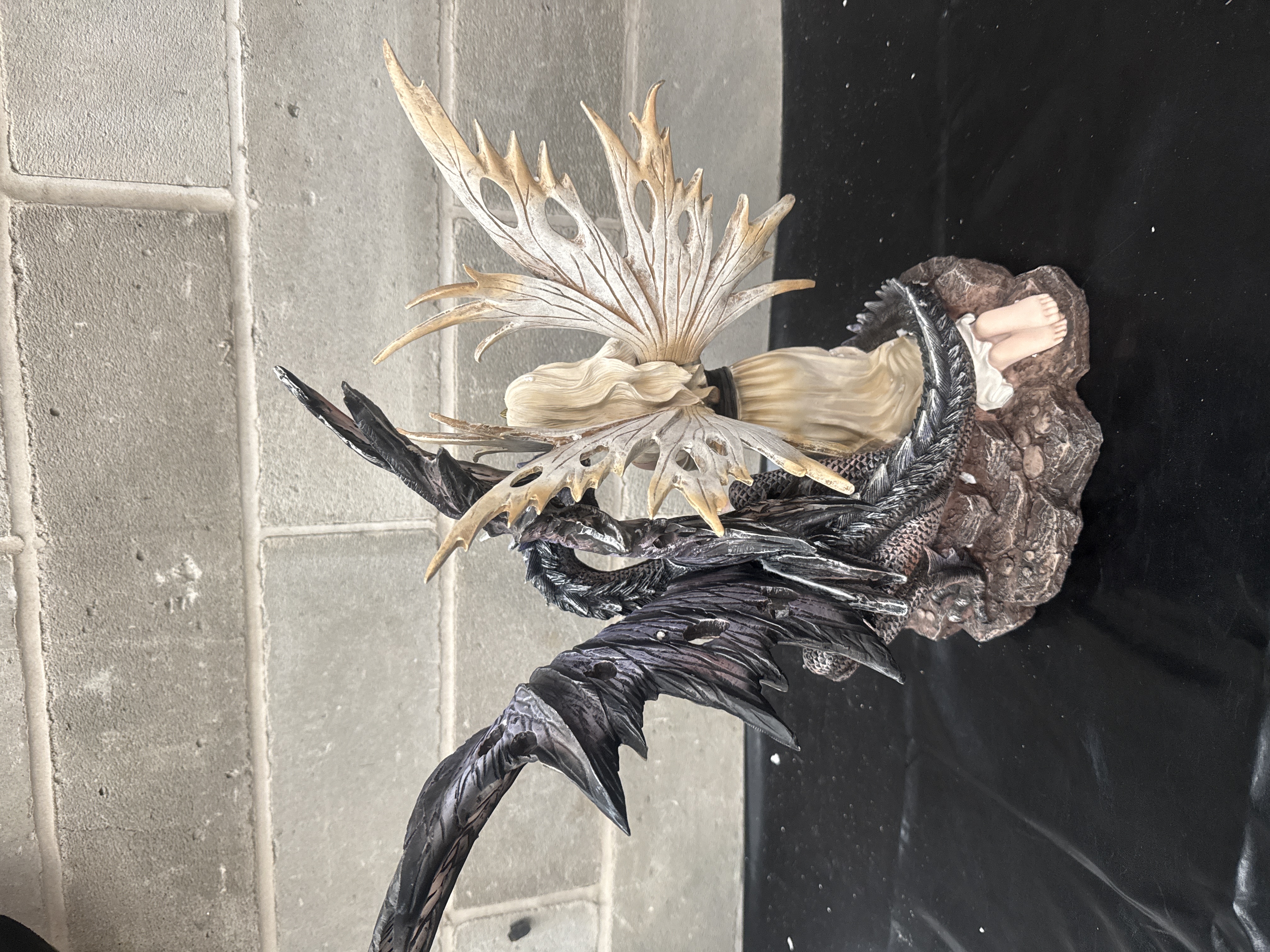 A single fantasy sculpture attributed to Ebros Gift, titled or marketed as the Large Ice Elemental Fairy with Night Fury Dragon Statue. The composition, executed in molded and polychrome-painted resin, depicts a kneeling blonde female figure, identified as the Ice Elemental Fairy, wearing a crown and corset-style bodice, holding a clear sphere or crystal ball toward a large, dark-scaled, winged dragon, identified as the Night Fury Dragon. The dragon features metallic dry-brushing and bright yellow eyes. The figure of the fairy has multi-lobed, tan-colored wings. The figures are mounted on an irregularly shaped, rock-like base painted in earth tones. This item is potentially supplied boxed, referencing the dimensions 19 X 17 inches.