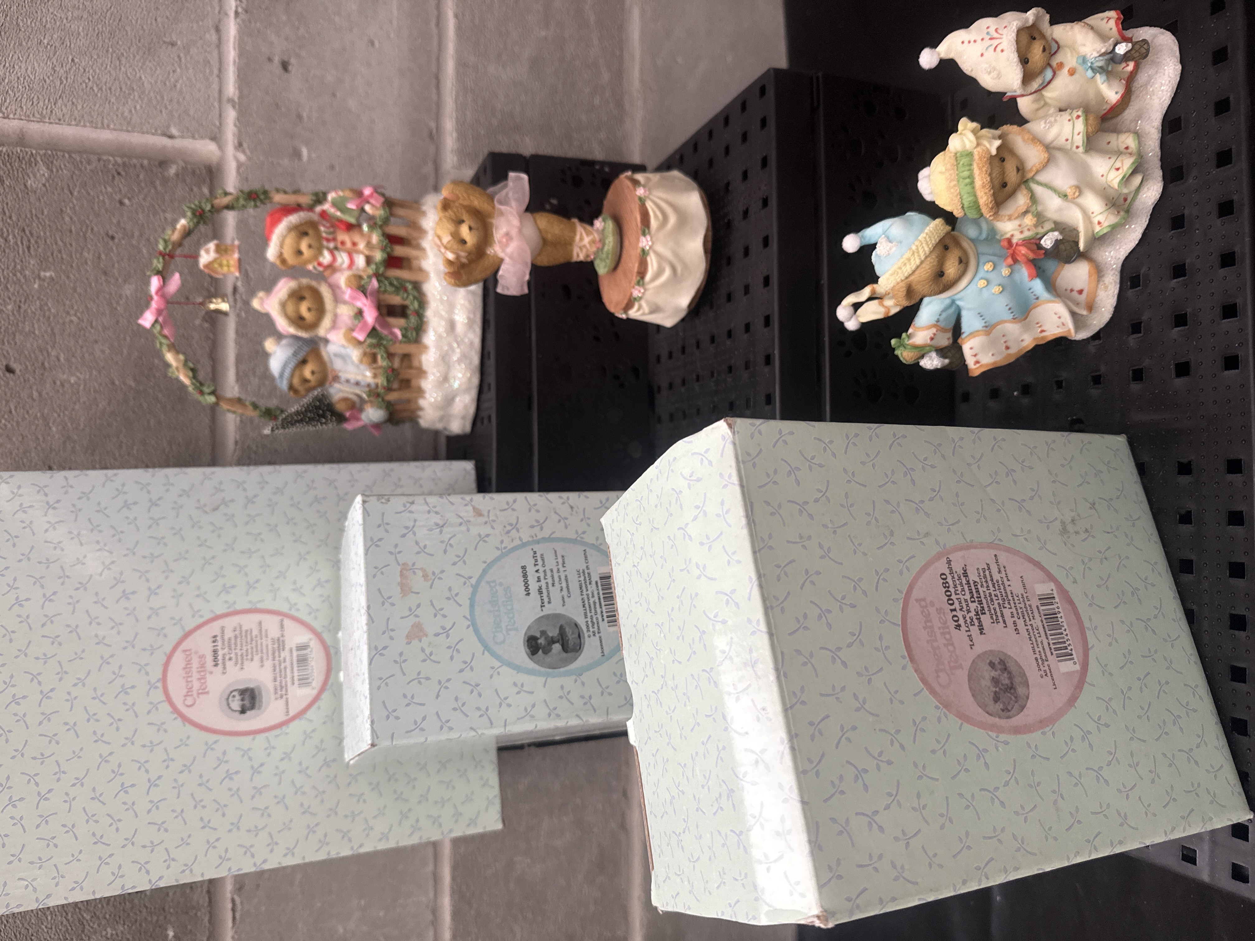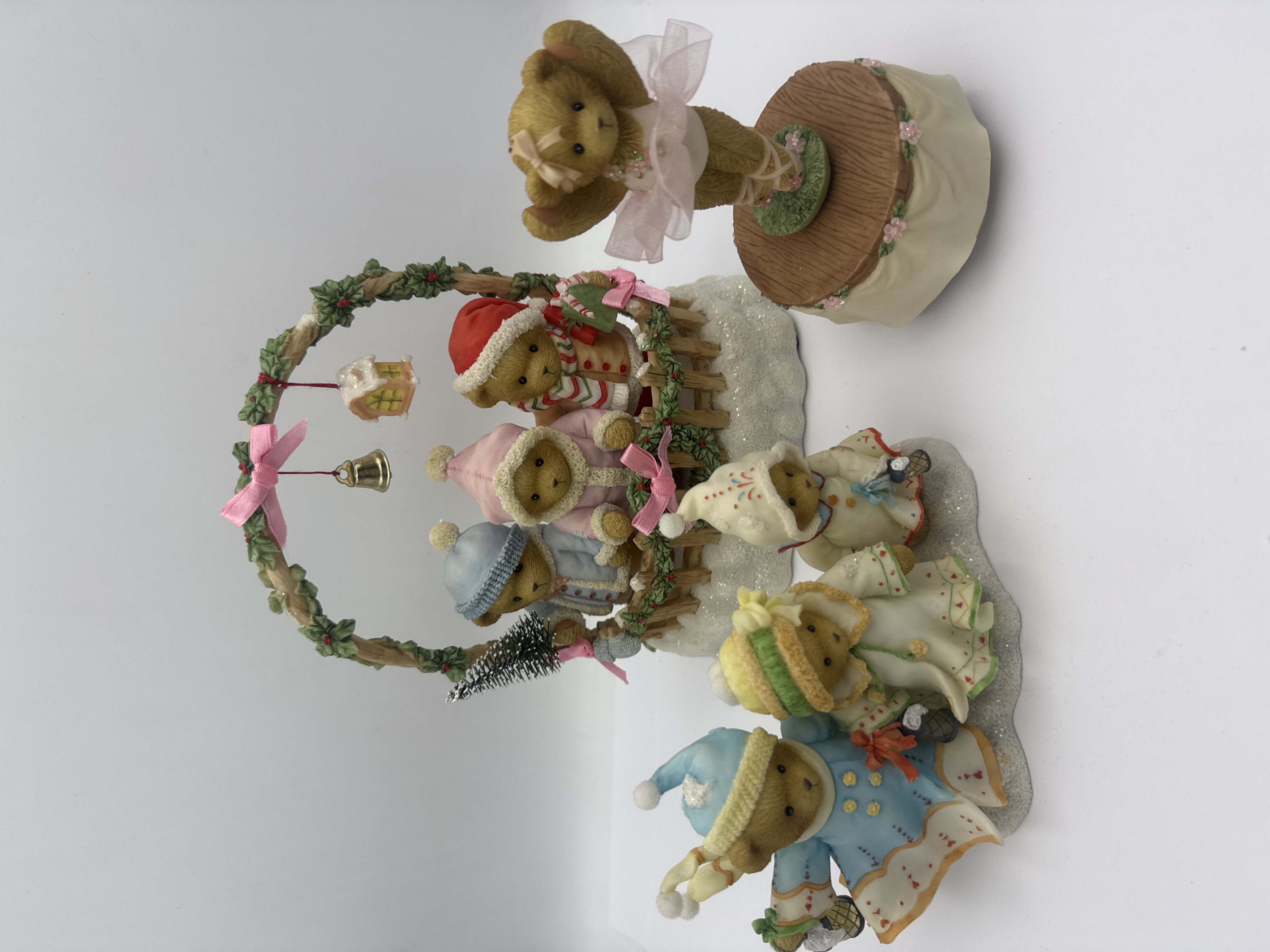A collection of three Enesco Cherished Teddies polychrome resin figurines. The group includes a ballerina bear titled Terrific In A Tutu on a circular wood-look base, a winter-themed grouping titled Let Love And Friendship Be Your Guide featuring bears in cold-weather attire on a snowy landscape, and a festive piece depicting bears framed by a decorative floral wreath with a hanging bell. The lot includes two musical pieces. Each figurine is accompanied by its original light blue patterned manufacturer box. Labels identify the items by numbers 4000808, 4010080, and 4008154, with copyright dates from the mid-2000s.