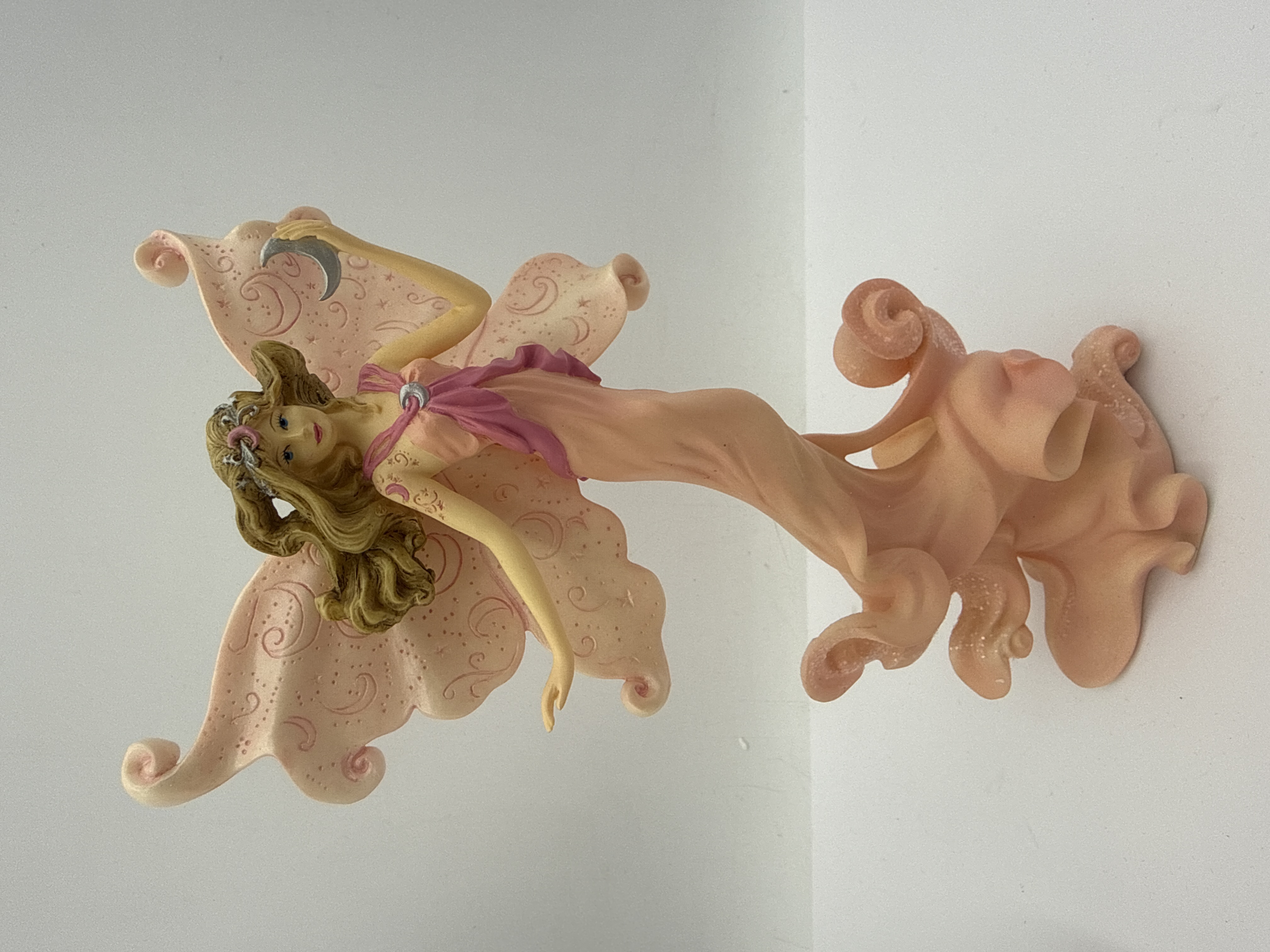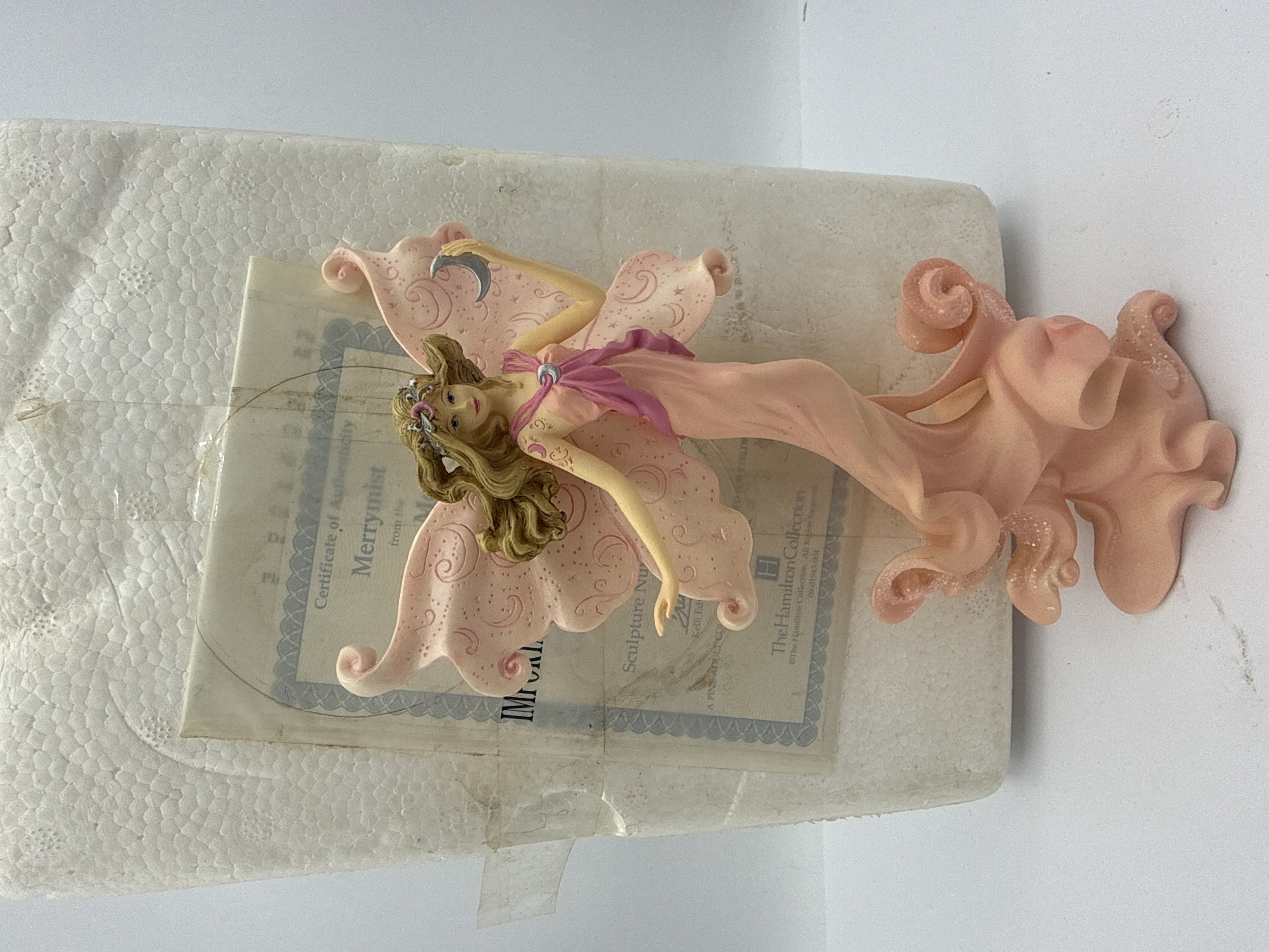 A Hamilton Collection hand-painted resin figurine titled Merrymist from the Thomas Kinkade Wings of Hope collection. The figure depicts a winged fairy in a peach-colored gown that forms a swirling base. The pale pink wings are decorated with celestial scrollwork and stars, and the figure holds a silver-toned crescent moon in her raised right hand. This lot includes the original Certificate of Authenticity and protective styrofoam packaging.