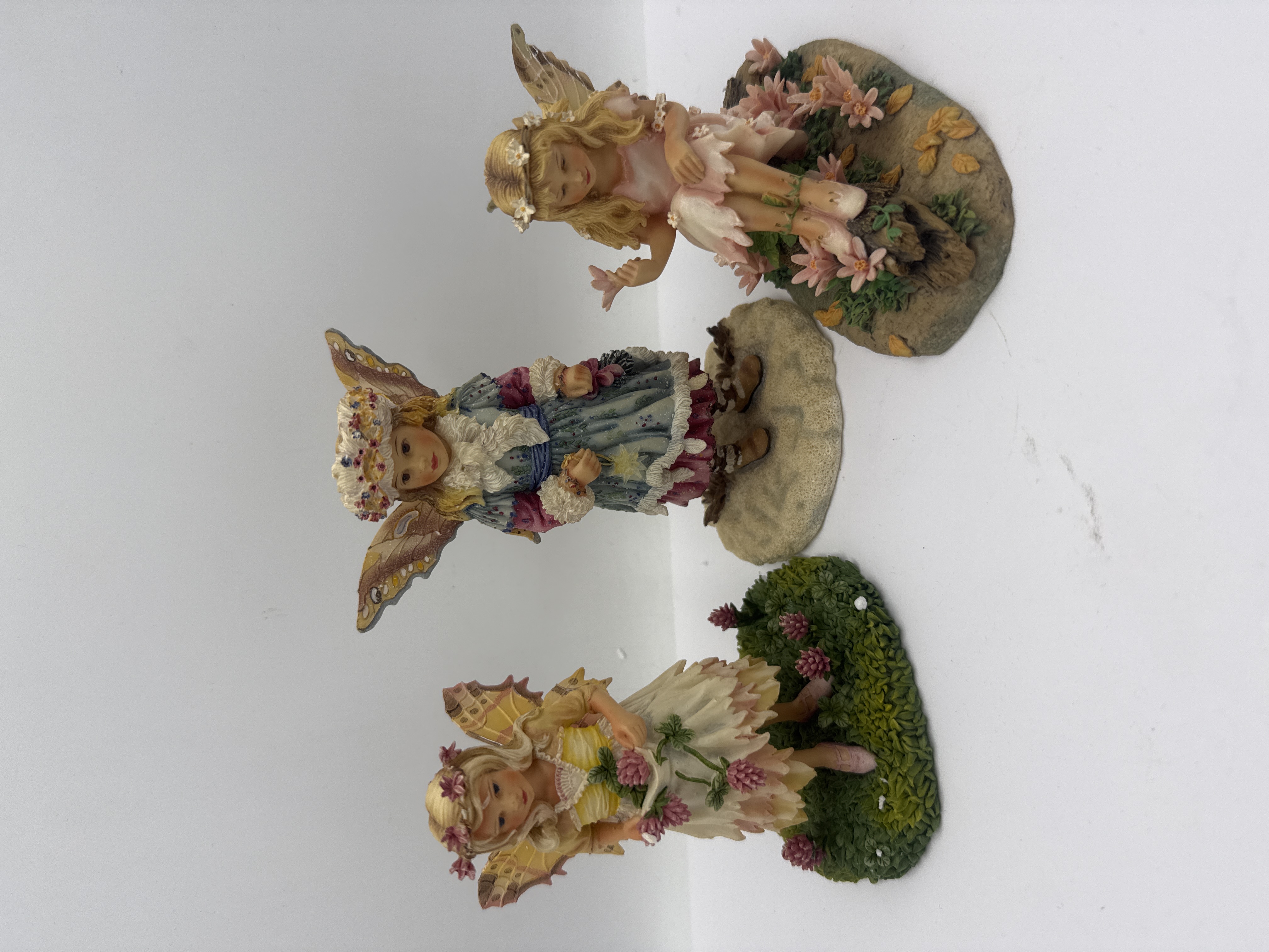 Three cast resin figurines from The Leonardo Collection, specifically the Faerie Poppets series designed by Christine Haworth for the Crisalis Collection. These hand-painted figures depict fairy characters in various poses, including standing and seated positions. Each figure features intricate wings and floral accents. One figure is depicted standing on a grassy base with pink flowers, another is seated on a woodland-style base with autumn leaves and flowers, and the third is a standing figure with a floral crown. The collection includes figures of varying sizes, with the tallest 5” in height. The lot includes three original pink decorative cardboard boxes. The packaging features character illustrations and is marked with The Leonardo Collection, Faerie Poppets, and Designed in England by Christine Haworth. One box is specifically labeled Secret Dell.
