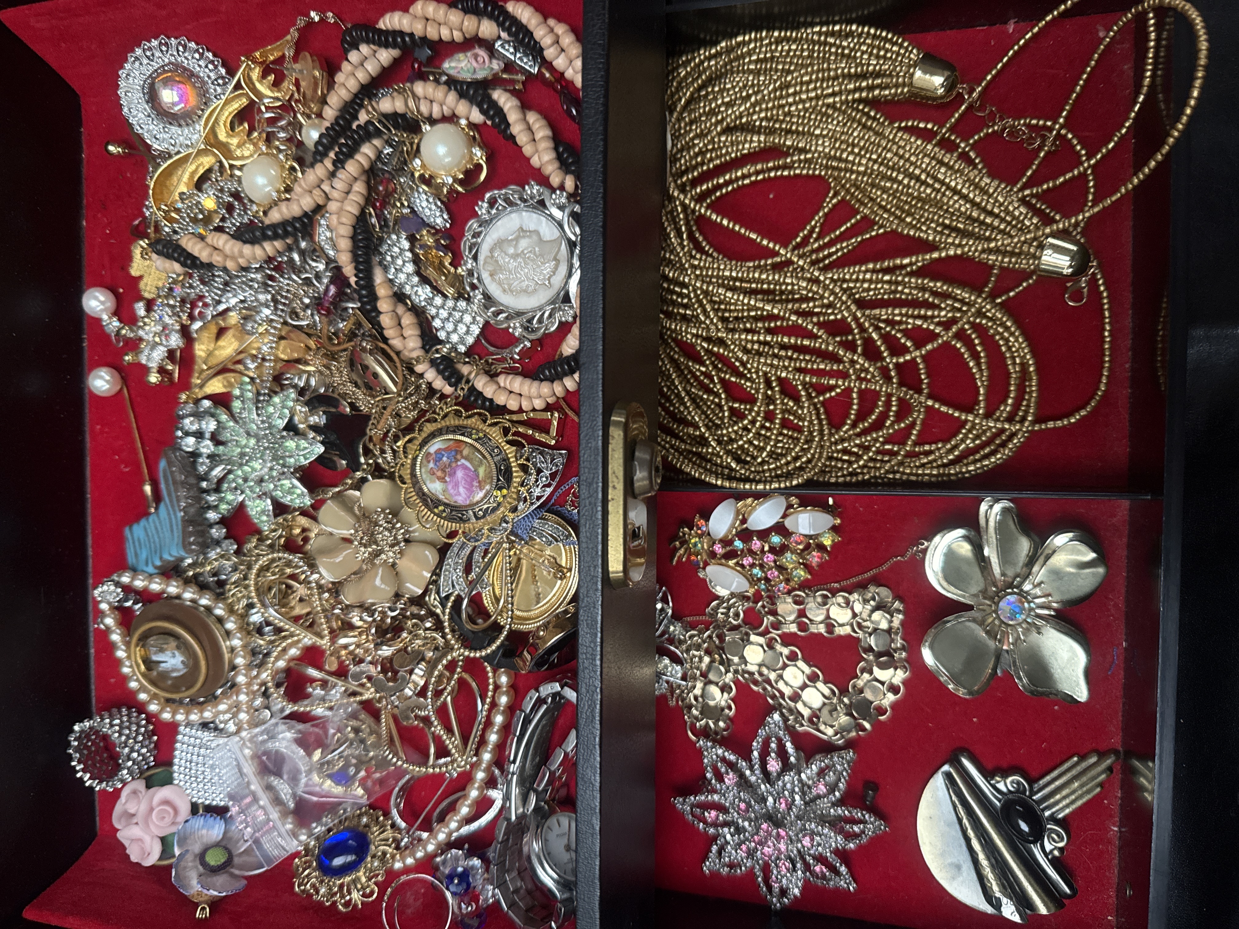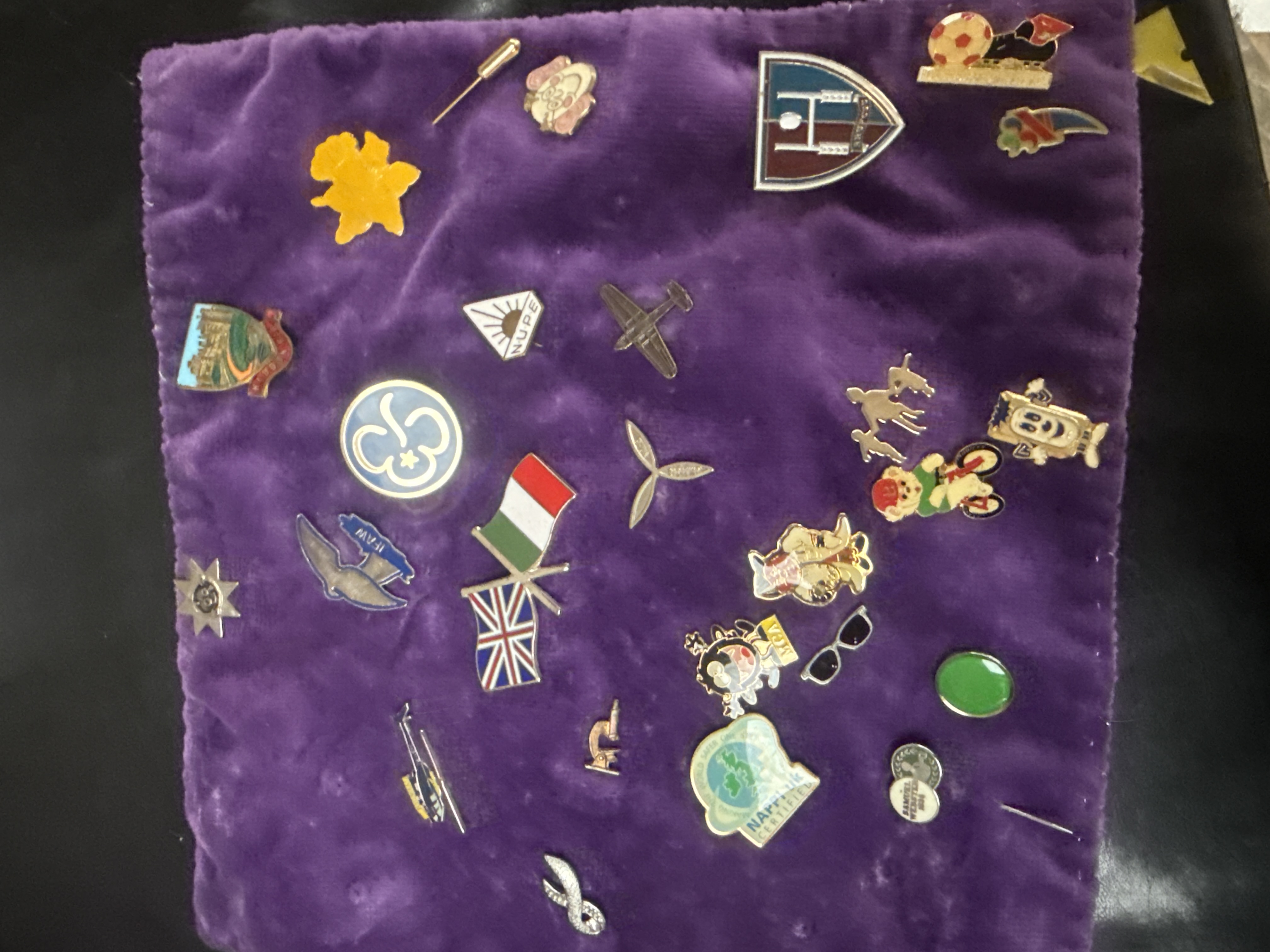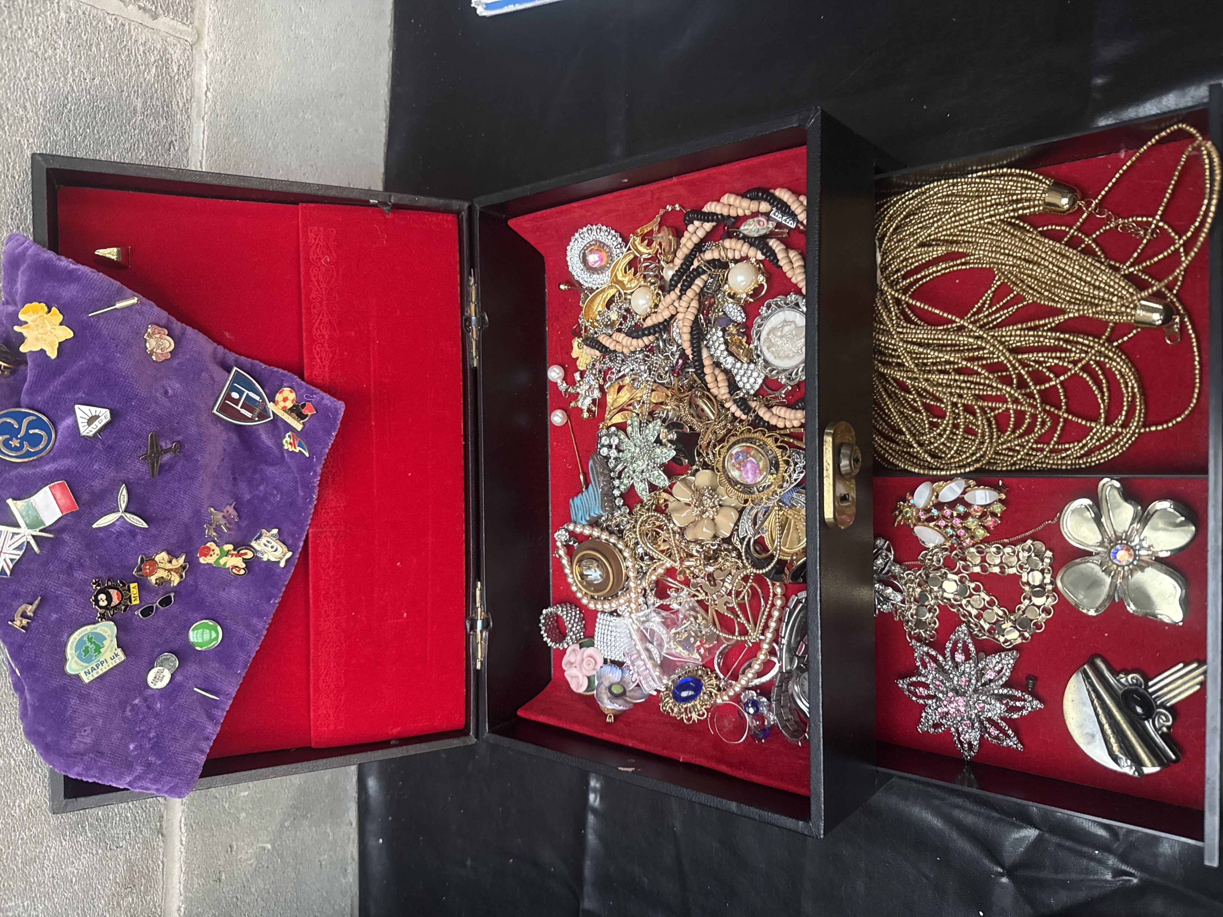 An assortment of vintage and contemporary costume jewelry and a collection of enamel lapel pins. The jewelry selection includes various necklaces, such as a multi-strand gold-tone seed bead strand and pink and black beaded strands. The group features an array of brooches in floral, starburst, and cameo designs, many accented with rhinestones and faux pearls. Also included are bracelets, rings, and a wristwatch. The collection is housed in a black jewelry box with a red velvet-lined interior. Accompanying the jewelry is a purple velvet display cloth featuring a group of enamel and lapel pins. These pins represent various organizations and interests, including national flags for the United Kingdom and Italy, animals, and logos such as NUPE, IFAW, and NAPPI uk. Materials across the collection include base metals, plastics, glass, and enamel.