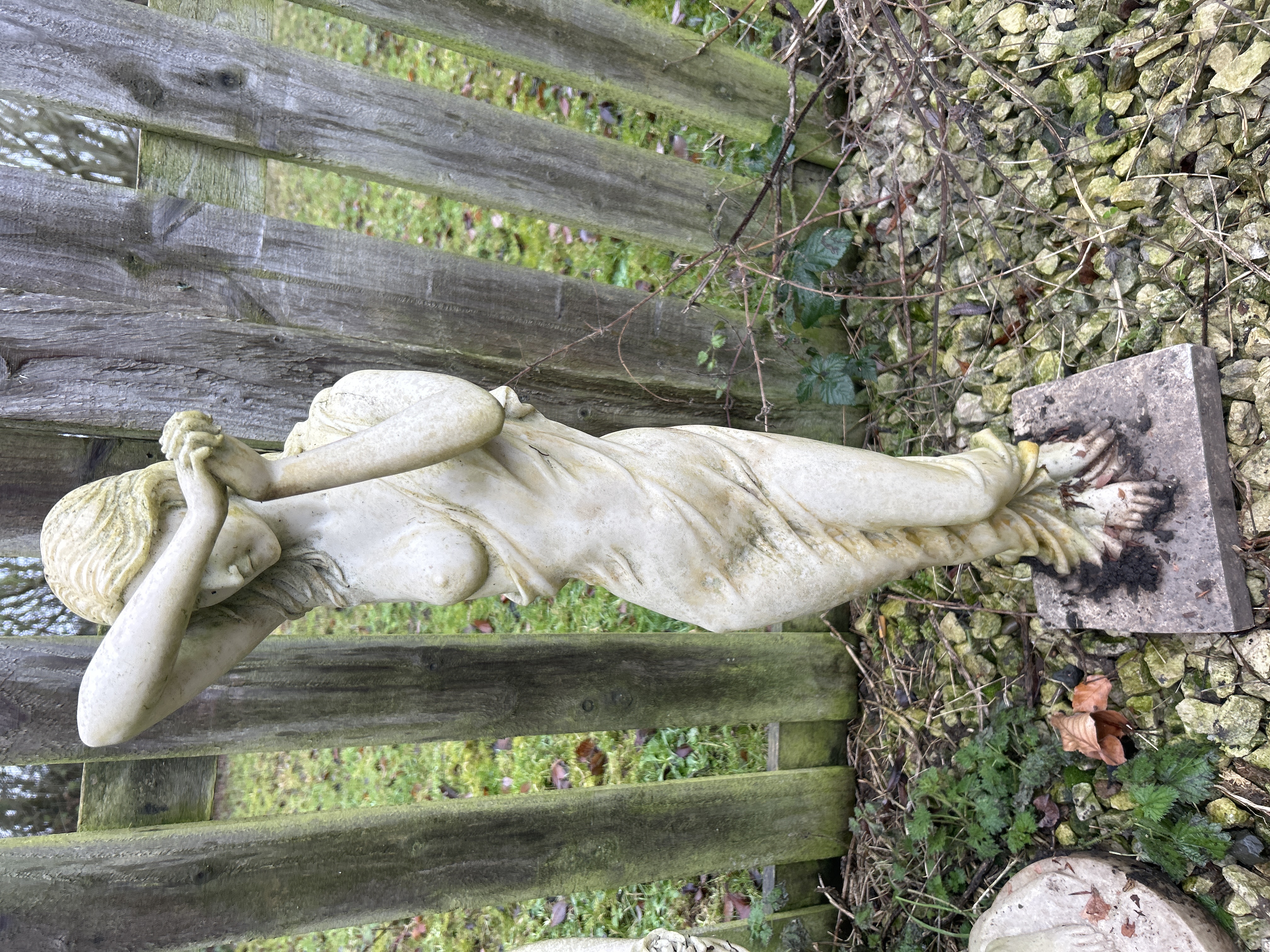 A large garden sculpture cast in reconstituted stone or concrete, designed in the neoclassical style. The figure depicts a standing female nude, often identified as a Nymph or Maiden, draped modestly below the waist. The figure uses both arms to cover or shield her eyes and face, a pose sometimes associated with figures like Venus or Harmonia. The material presents a pale, creamy yellow tone, consistent with imitation classical marble. The sculpture is mounted on a simple, rectangular grey stone or concrete plinth. This type of large-scale statuary is widely reproduced for outdoor display.