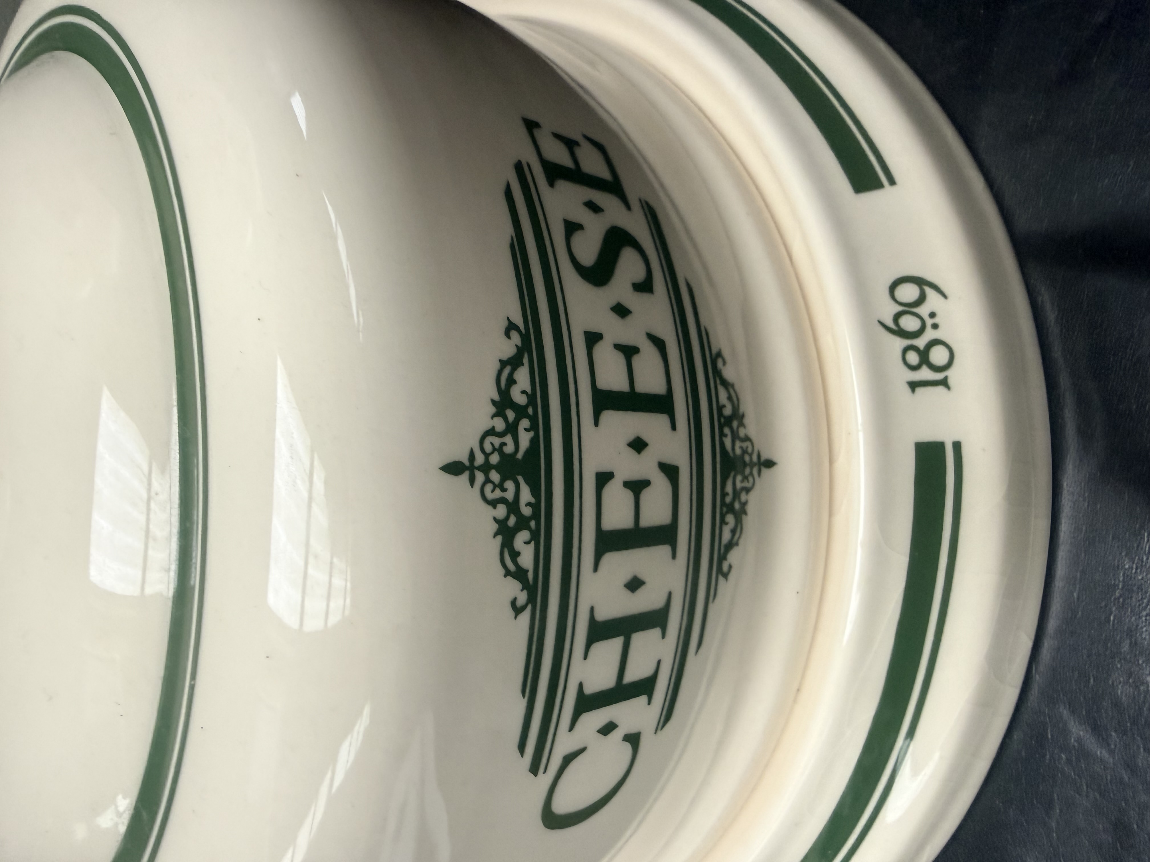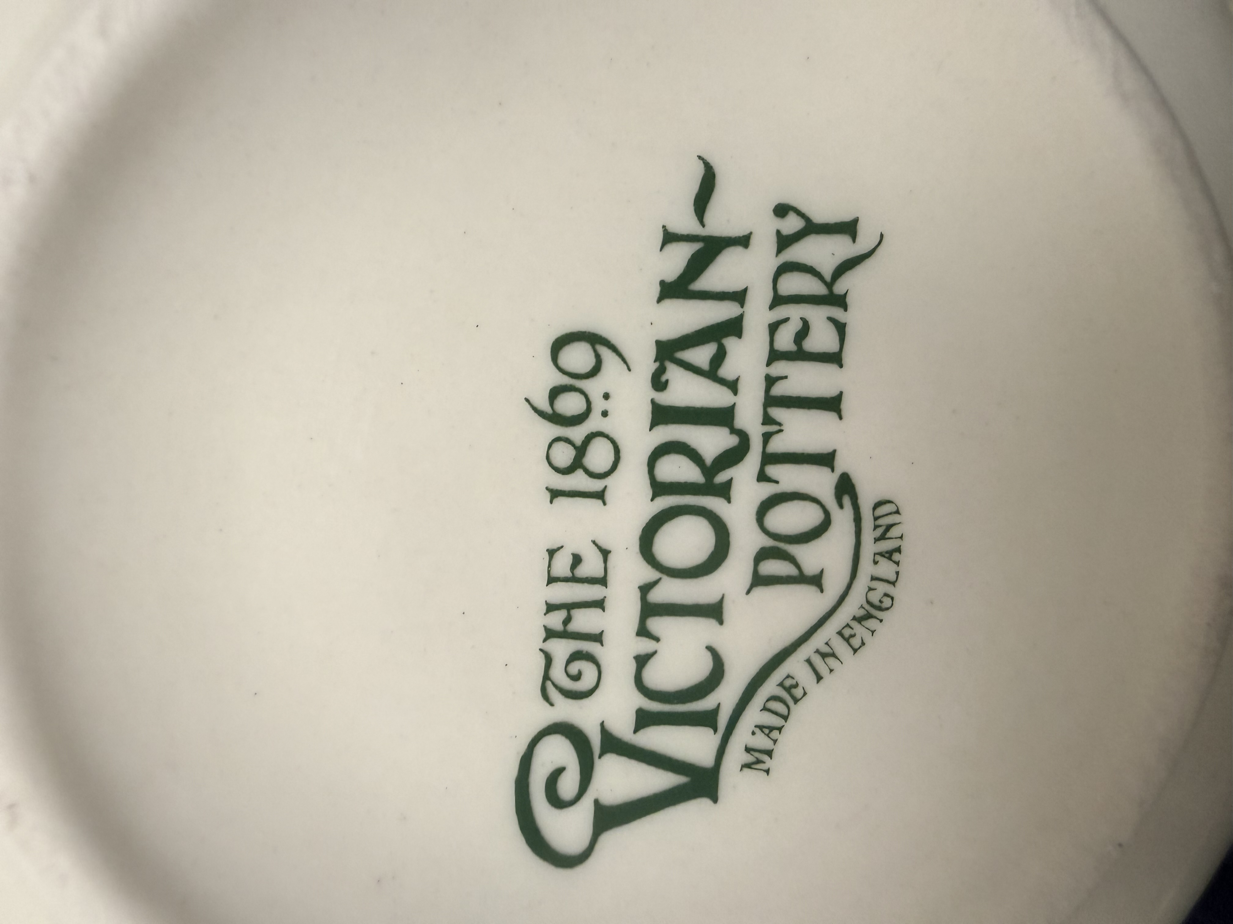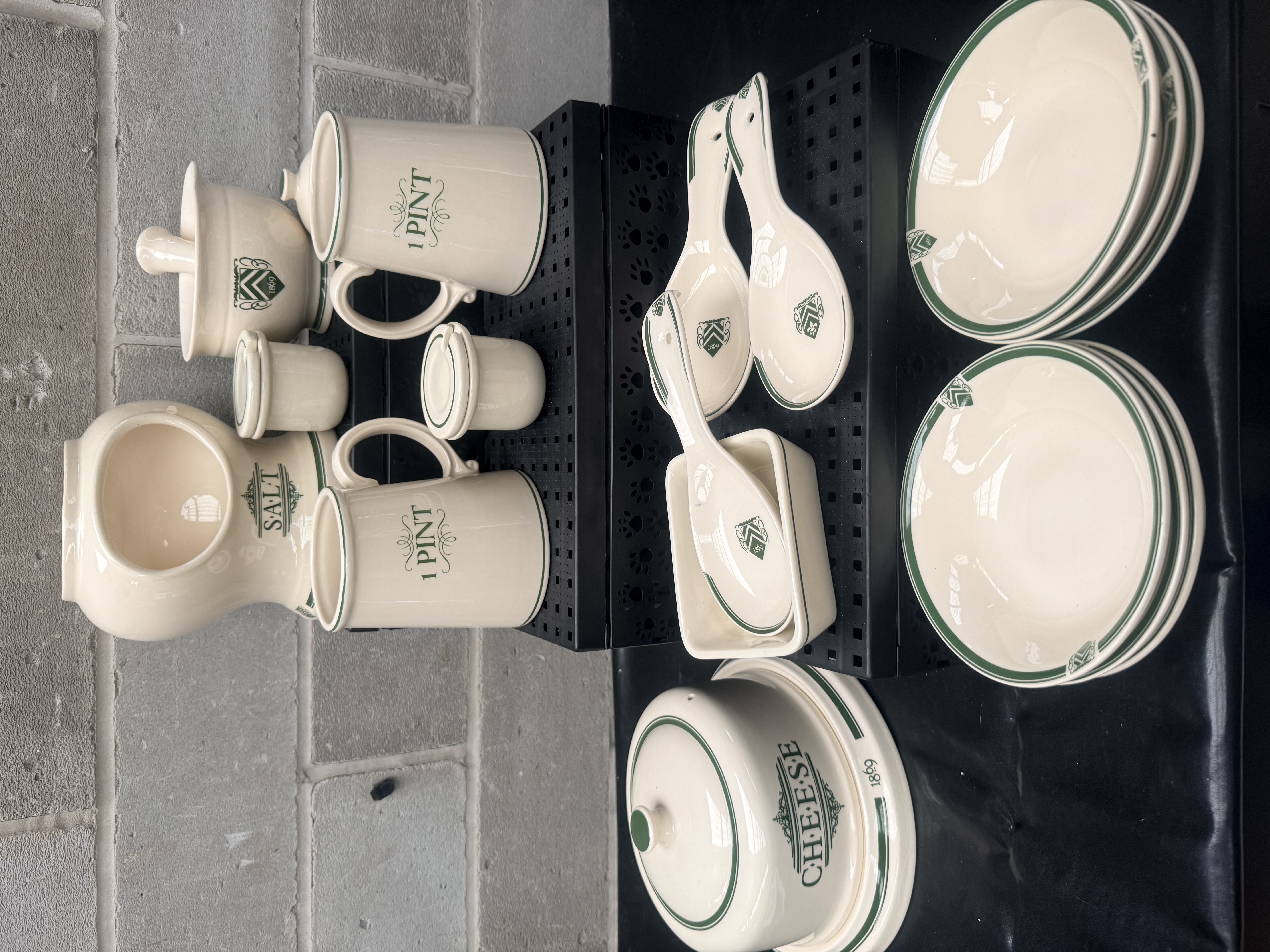 A collection of 17 ceramic items produced by The 1869 Victorian Pottery in England. The set is constructed from cream-colored glazed ceramic featuring dark green banded trim and decorative typography in a Victorian-revival style. The group includes mugs labeled 1 PINT, a salt pig marked SALT, a lidded cheese dome marked CHEESE, several bowls and plates, and small serving spoons or scoops. Many pieces feature a crest logo incorporating the year 1869. The underside of the items bears the printed maker mark reading THE 1869 VICTORIAN POTTERY MADE IN ENGLAND.
