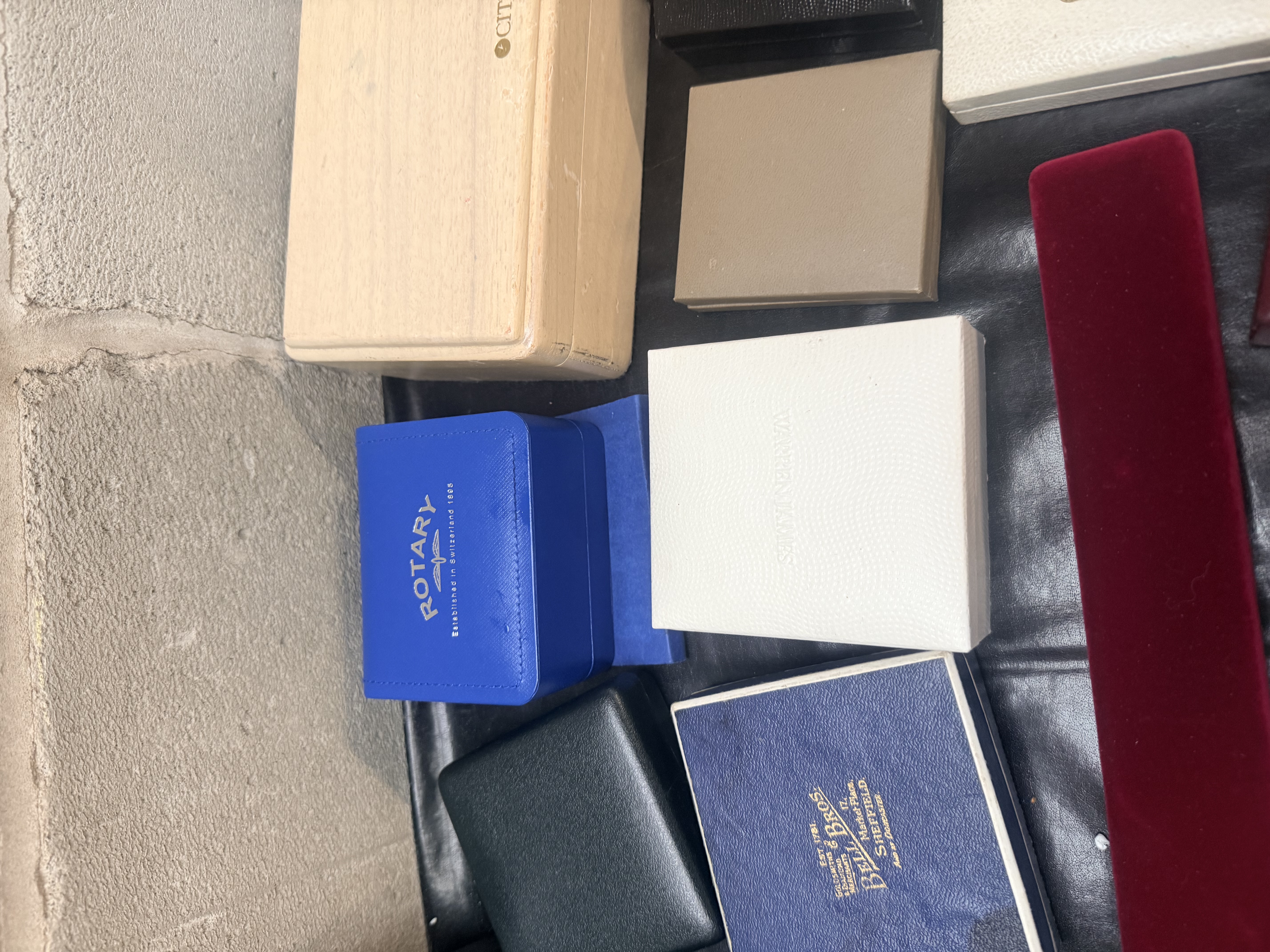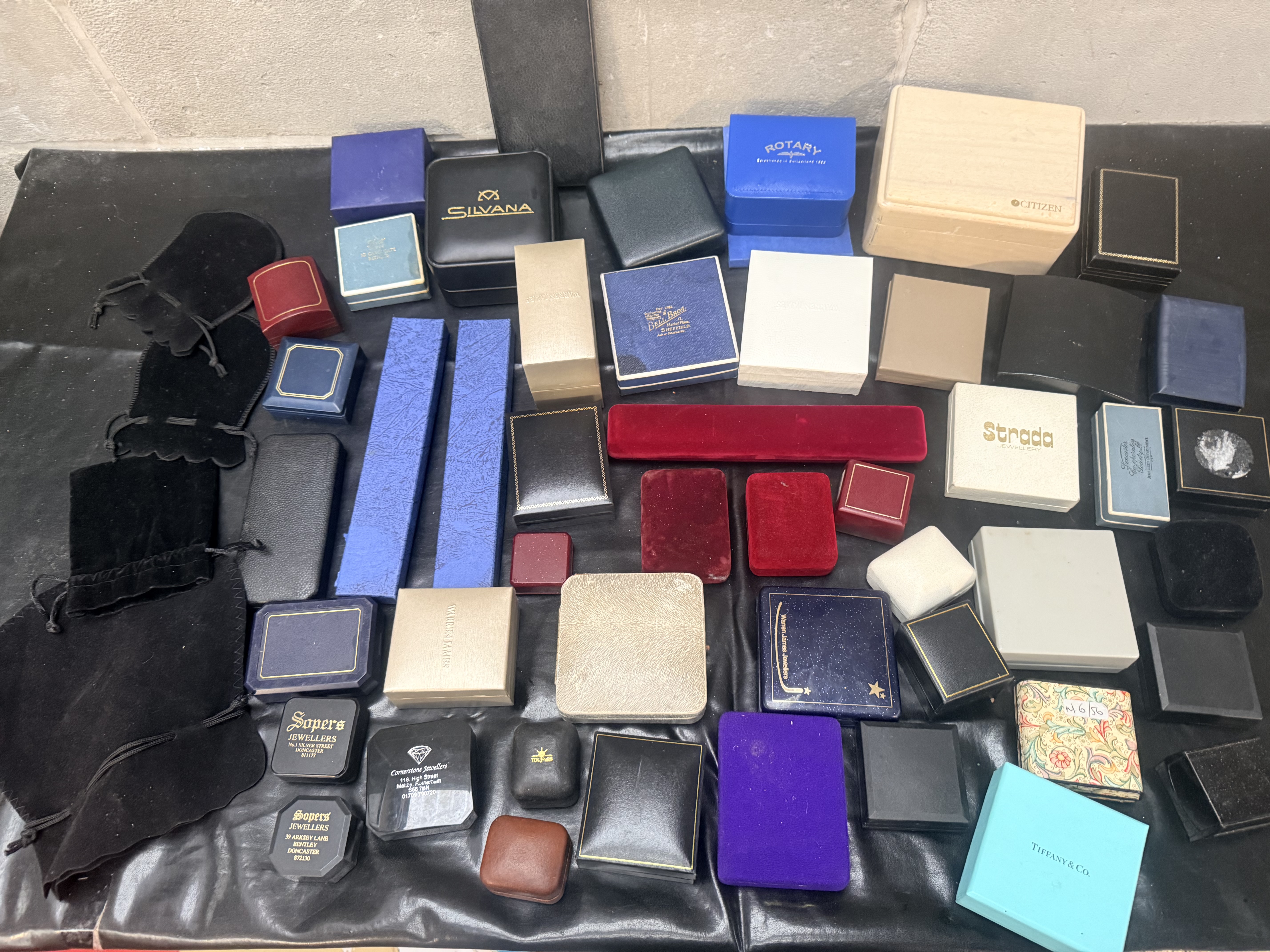 A collection of 49 empty presentation boxes and pouches designed for the storage and display of jewelry and watches. The assortment includes items constructed from cardboard, wood, leatherette, and velvet-flocked plastic, alongside several black fabric drawstring pouches. Visible branding includes manufacturers and retailers such as Tiffany & Co., Rotary, Citizen, Silvana, Strada, Warren James, Bell & Bros., Sopers Jewellers, and Cornerstone Jewellers. The collection features a diverse range of colors including signature blue, black, red, and cream, with one box decorated in a floral motif. The items are presented in various forms including square ring boxes, rectangular watch cases, and elongated bracelet boxes.